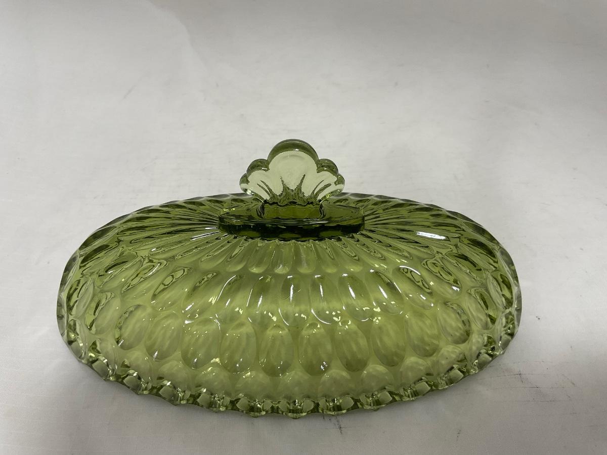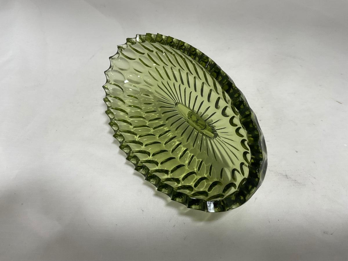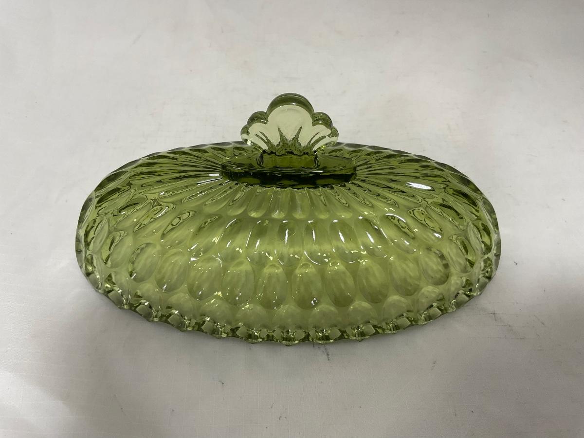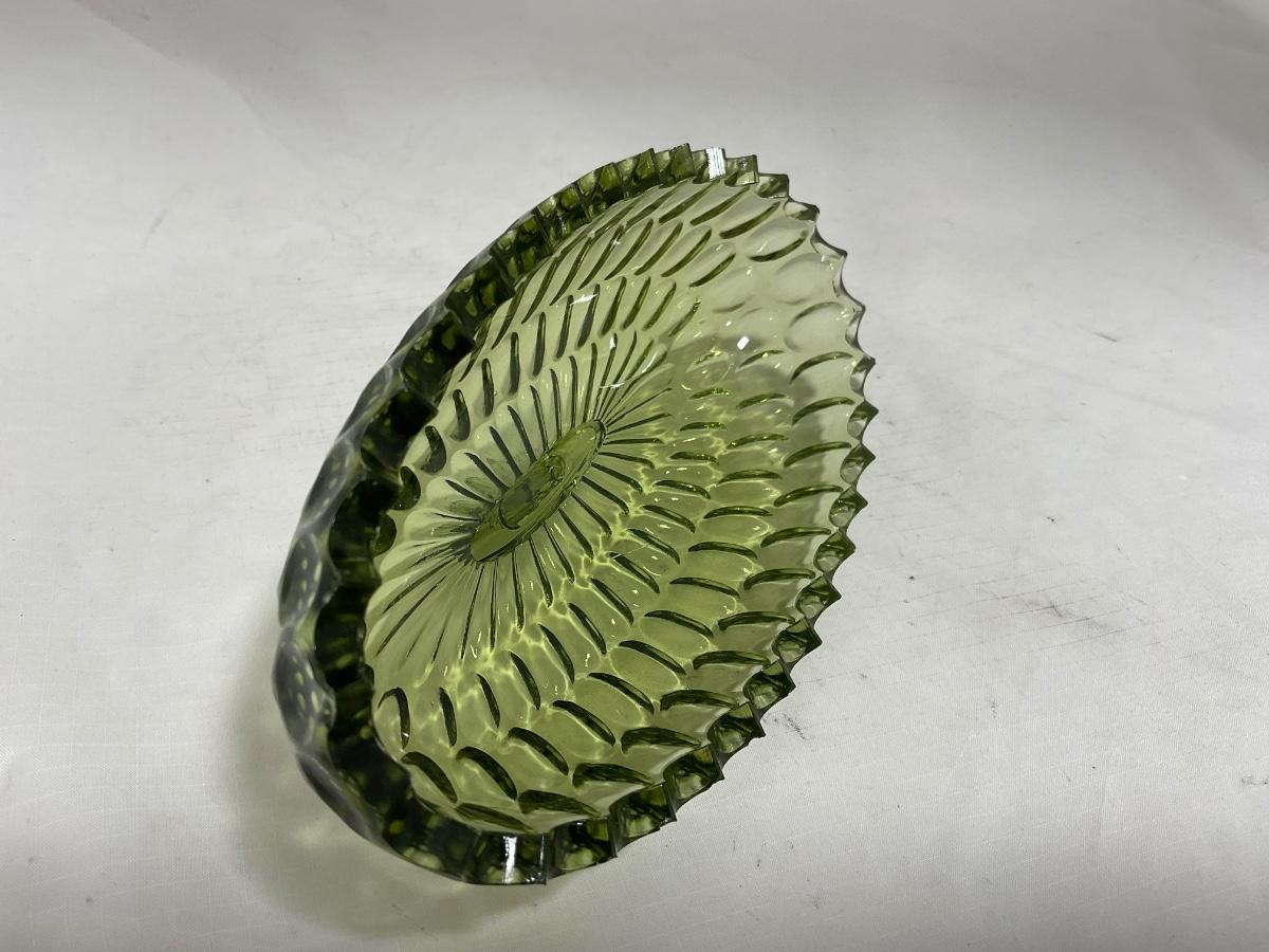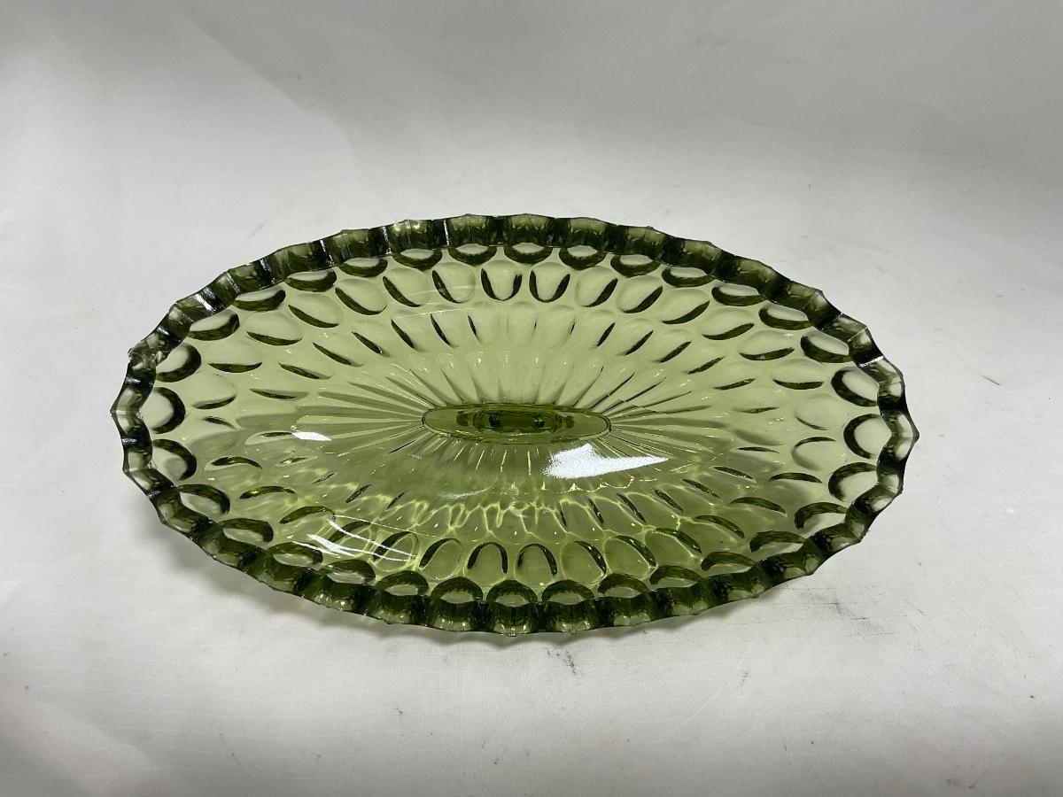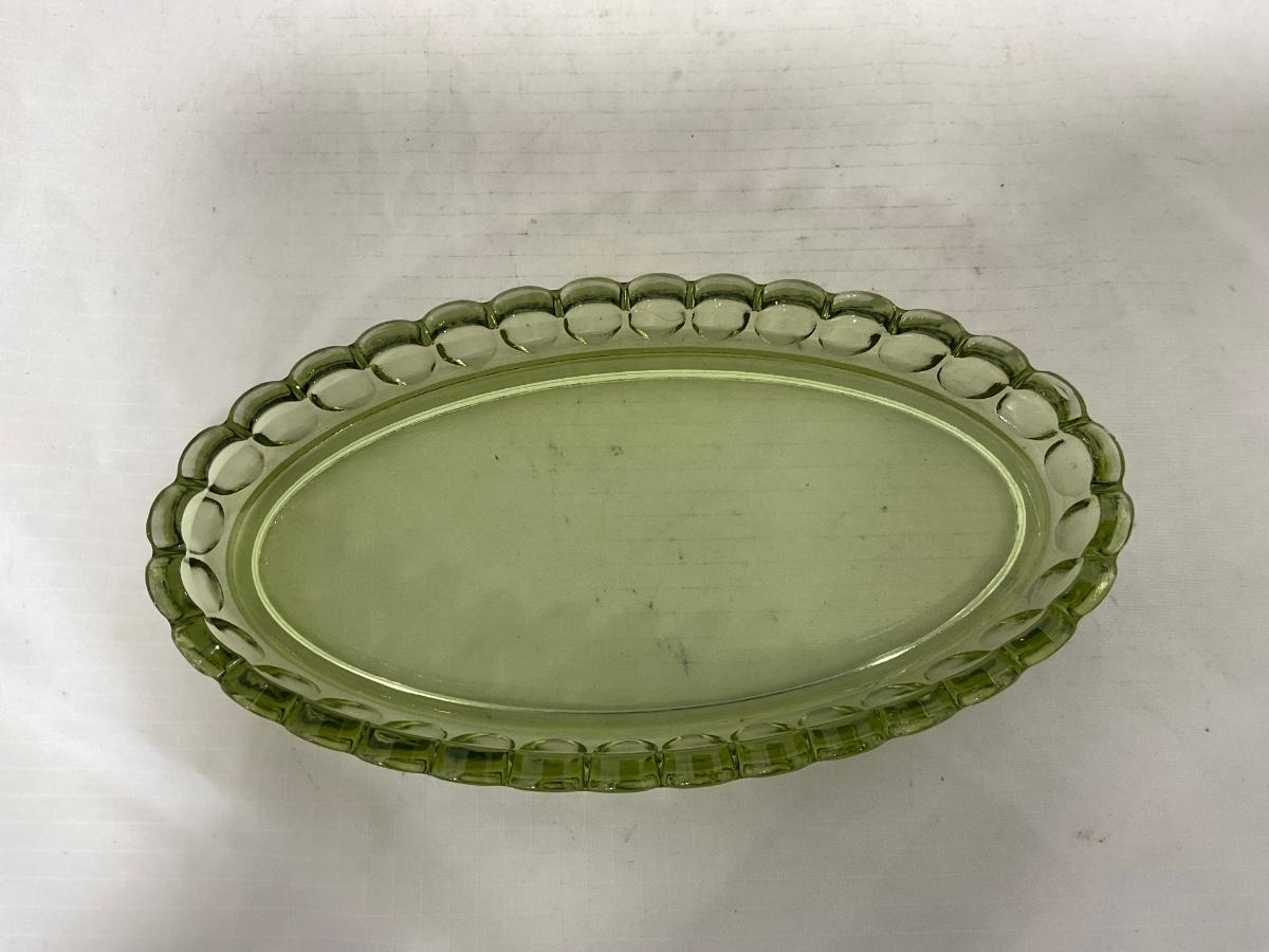 One long green glass covered butter dish. In amazing condition. Please see photos for details and condition. ::: Shipping is available on this lot. If you require shipping you must let us know at the close of the auction. We will coordinate with you after the item has been won. Shipping fees will include insurance up to or exceeding the value of all items being mailed. If you have any questions regarding this lot please contact the auctioneer either via this website, by direct email or by phone. PICK UP TIMES and other important information can be found in the TERMS and DESCRIPTION of the auction. Please take a look for pertinent information. Thanks!