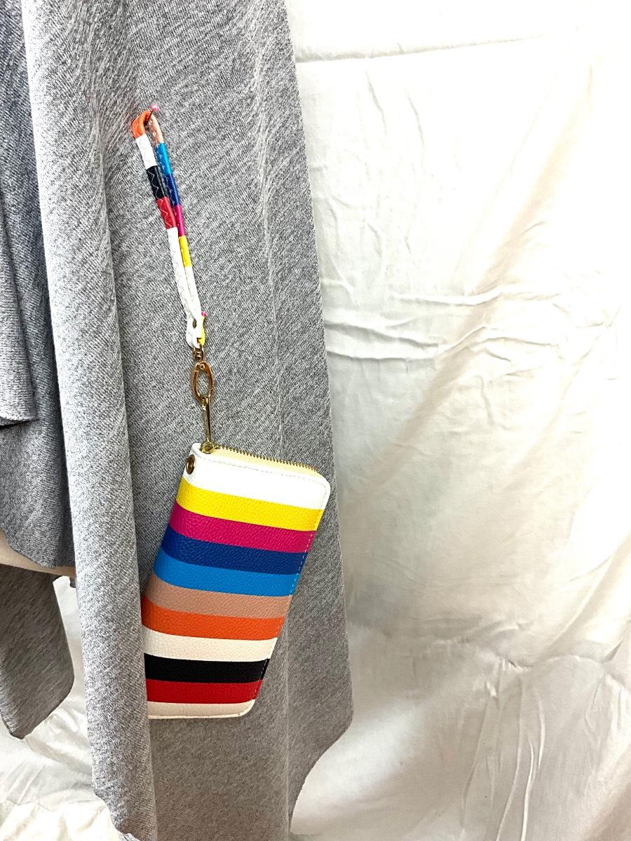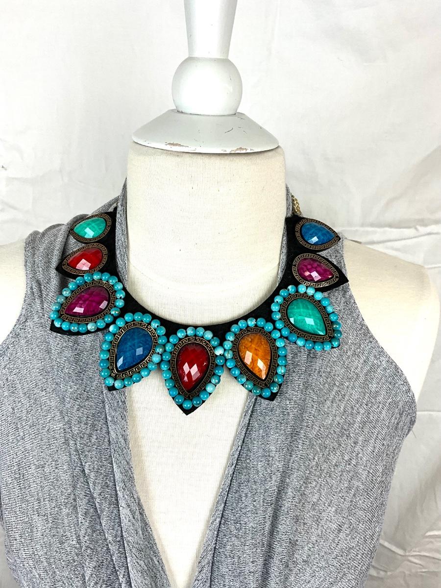 One size shawl with statement multi colored necklace with matching clutch