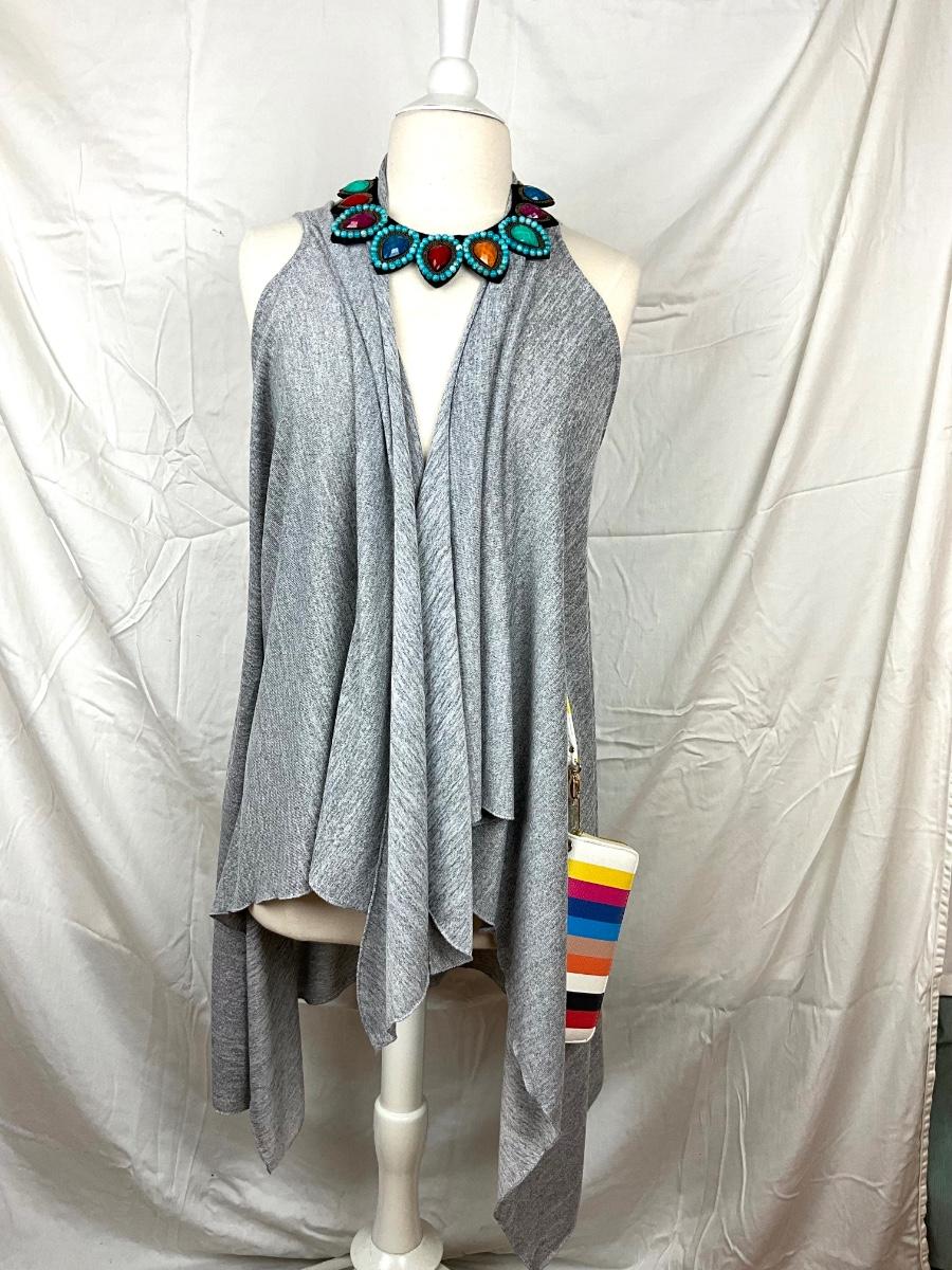 115 Grey Jersey Knit Shawl Wrap with Multi Colored Necklace and Clutch