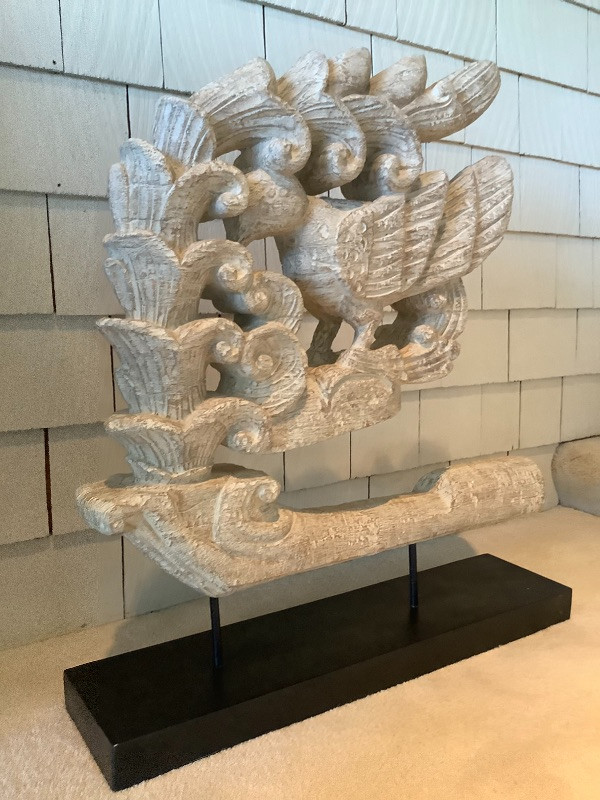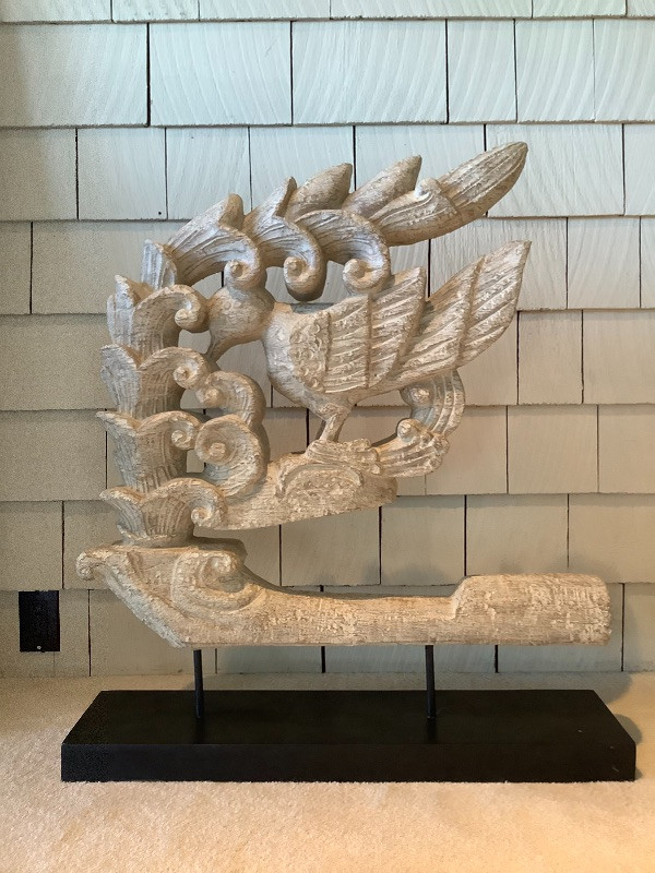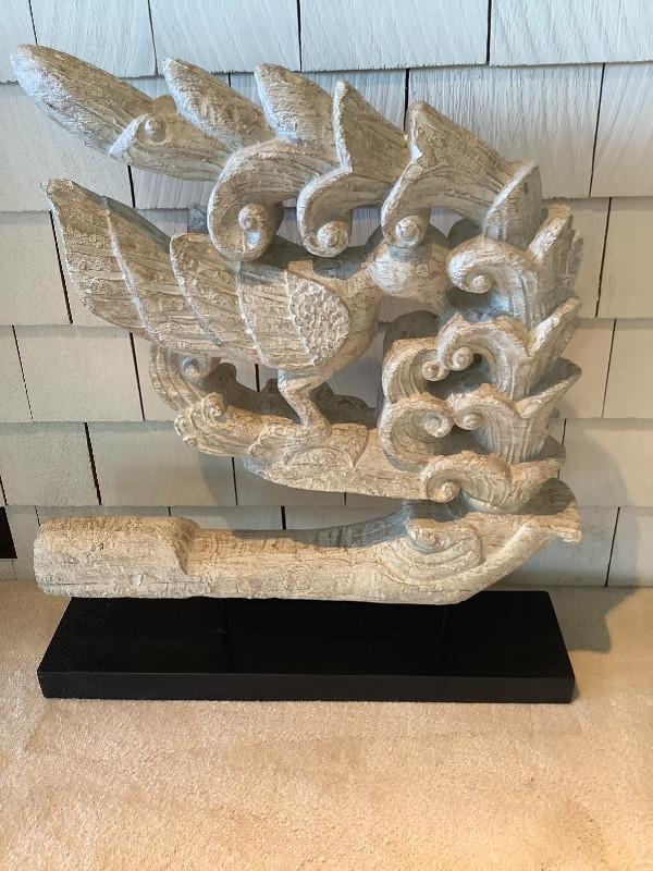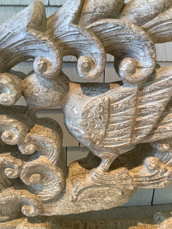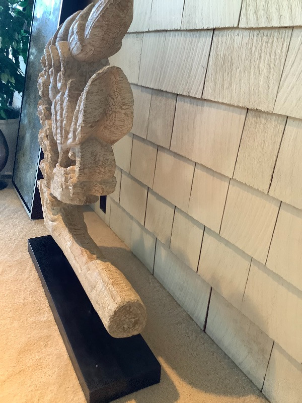 Beautiful large heavy table art of bird on a pedestal from Vietnam. Measures 32” wide x 39” tall