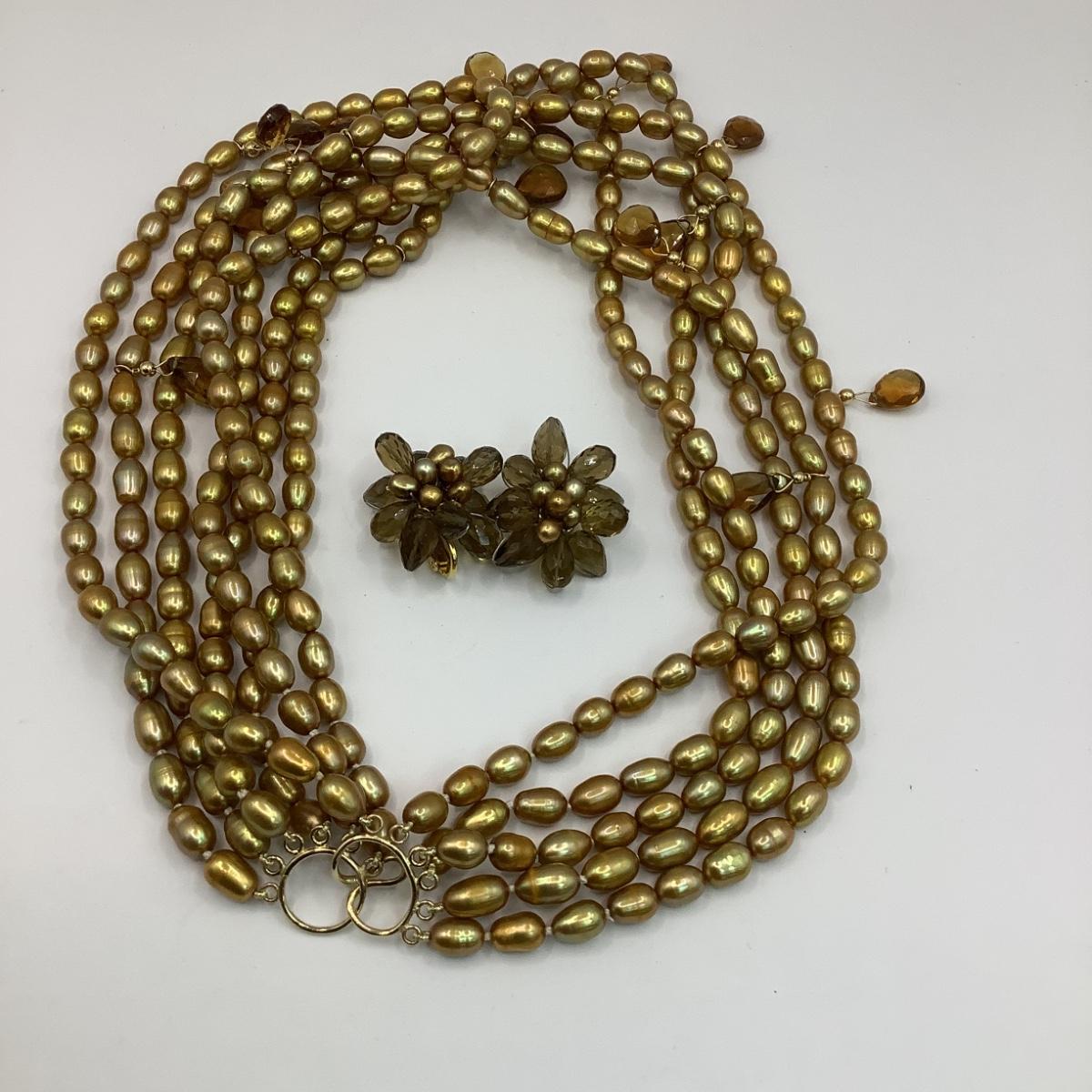Necklace is 16" from end to end, freshwater pearls, topaz and 14k gold clasp. Earrings are clip on.