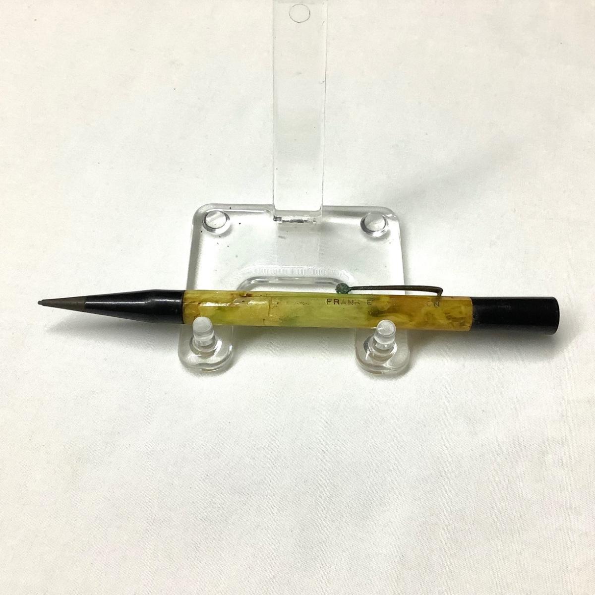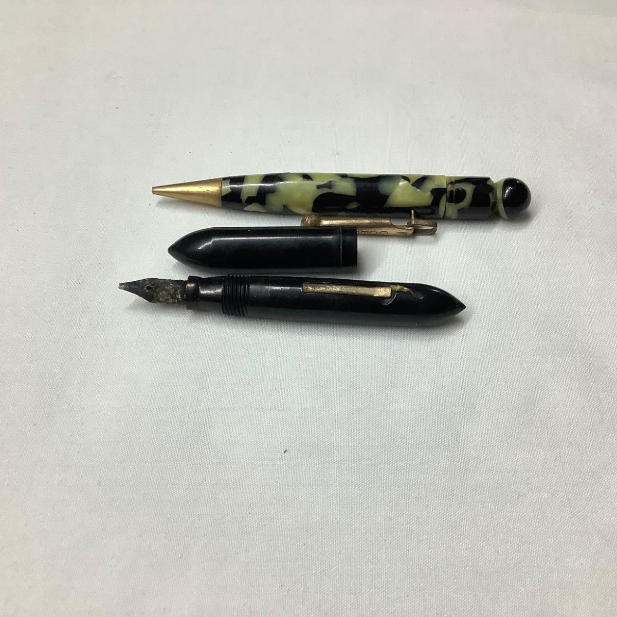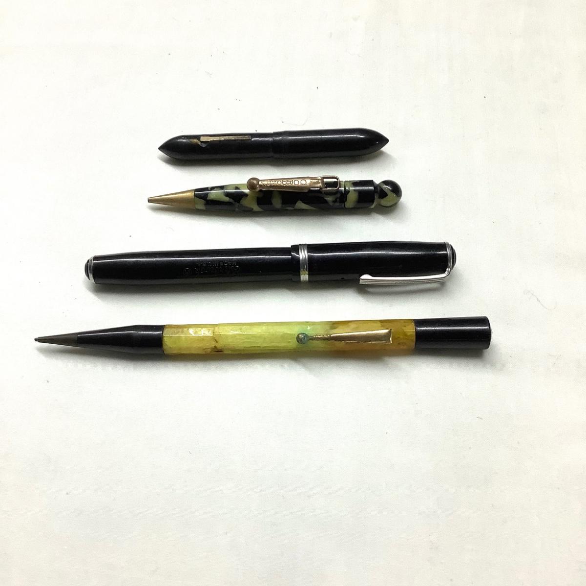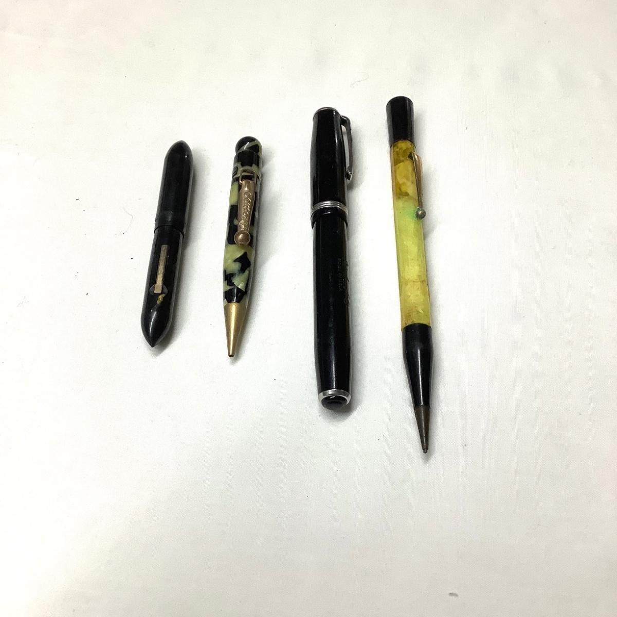 The lot contains a Gordon small pencil with black and pearl body, Esterbrook fountain pen, mechanical amber pencil with damage to the amber barrel, ladies black fountain pen with corrosion on the tip.