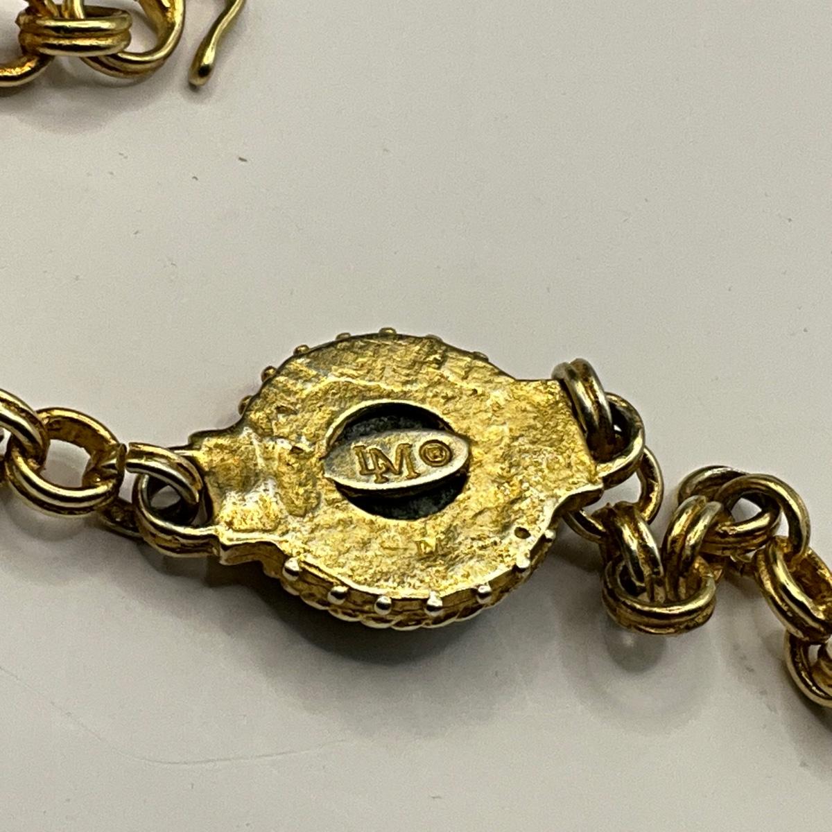 Button bracelet is 7.5" and roman gold tone bracelet is marked LM and 7" in length
