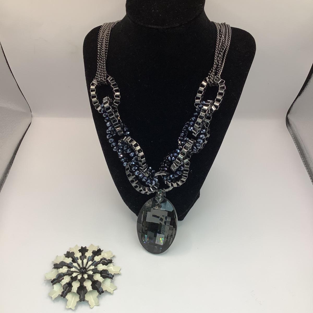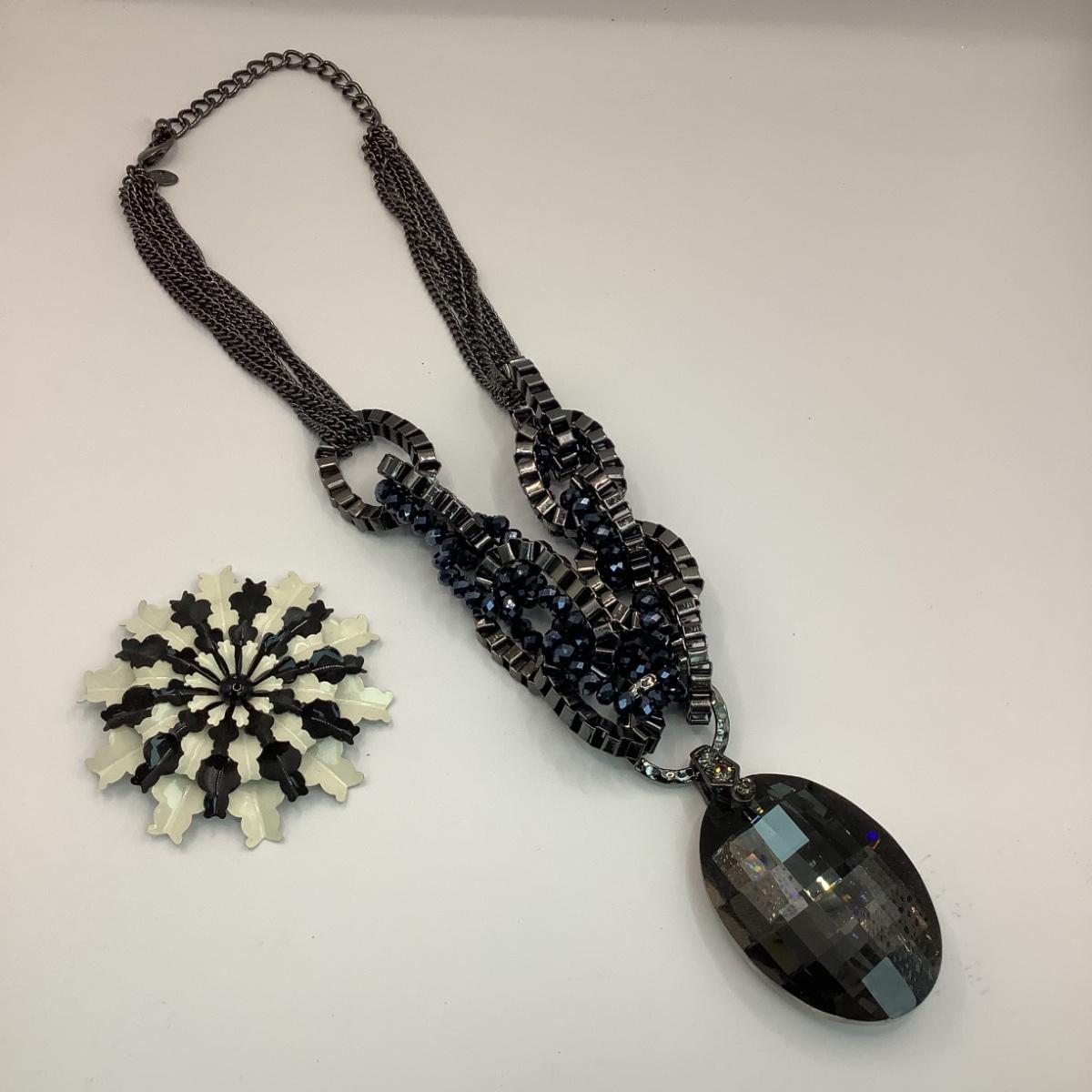 Necklace is 23" in length and has adjustable clasp, pin is vintage.