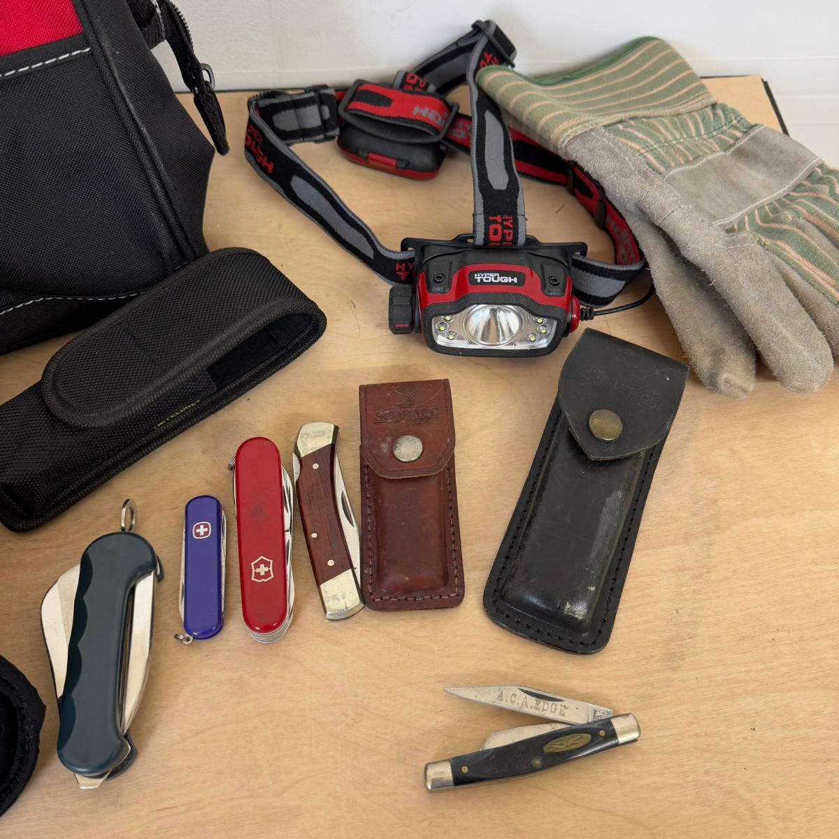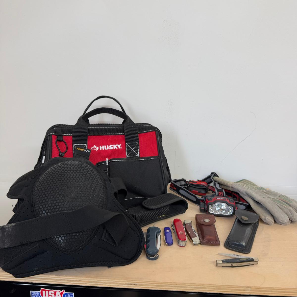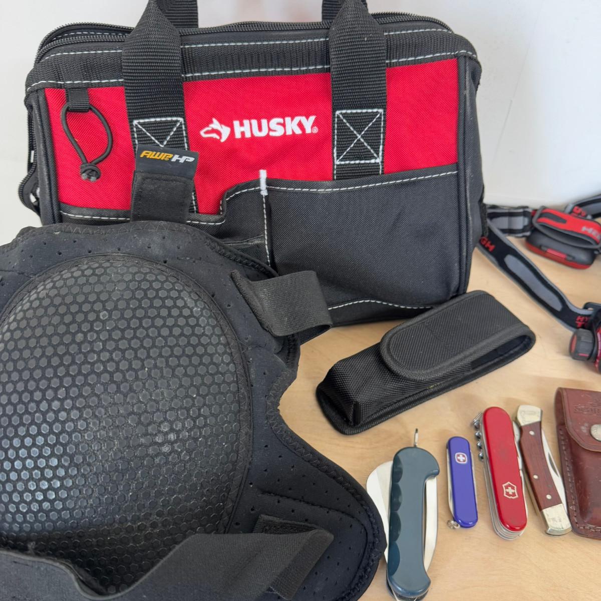 1159 Knife Lot: Schrade Knife, Swiss Army Knife, Rigging Knife, Husky Bag, Gloves and Knee Pads