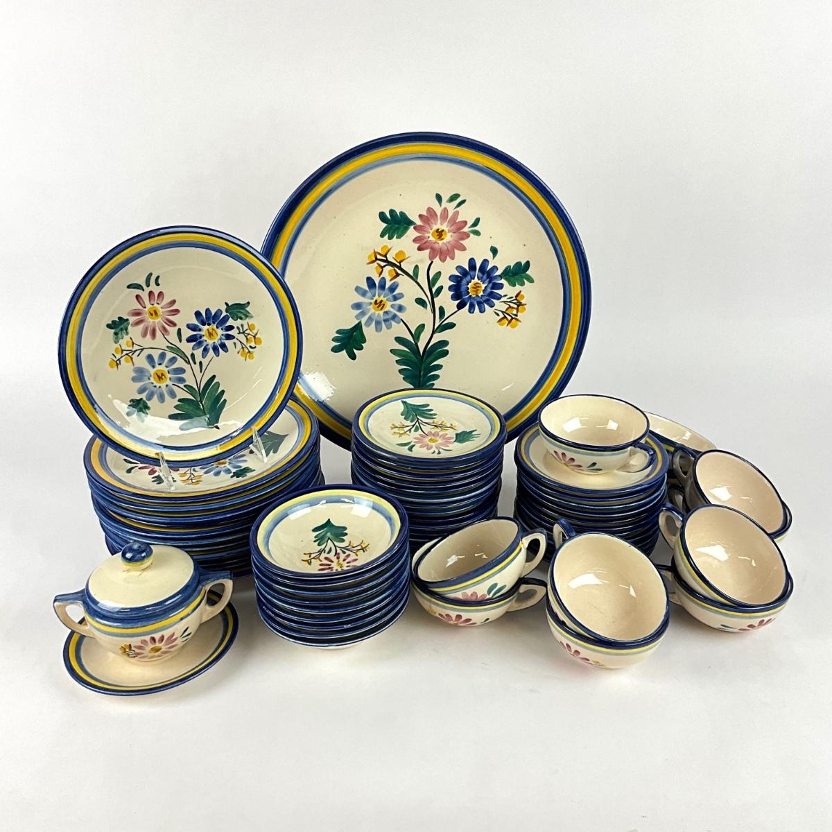One large charger 14.5" diameter, 12 salad plates 9" diameter, 1 covered sugar dish, 9 small bowls 5.5" diameter , 14 bread and butter plates, 13 saucers, 11 teacups
