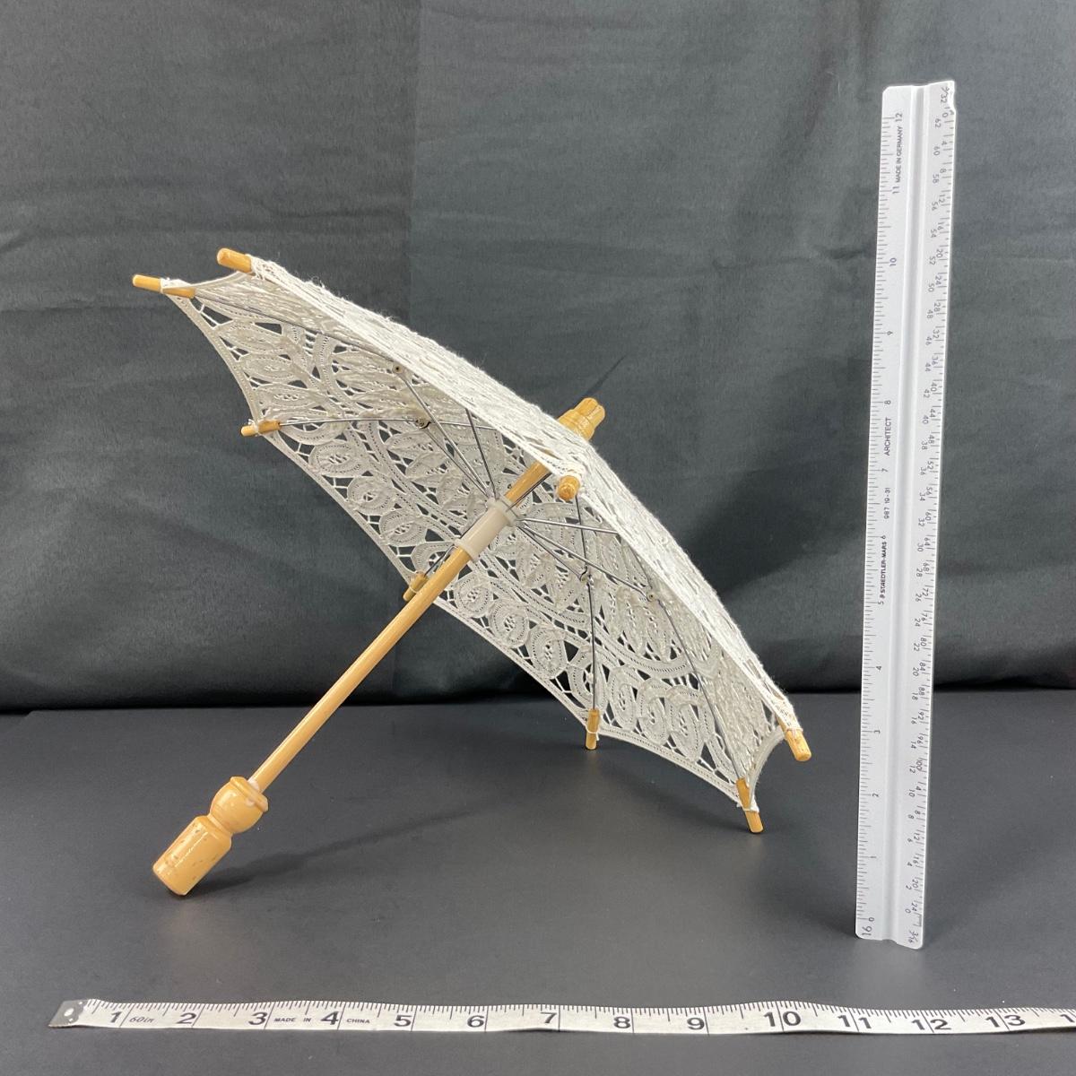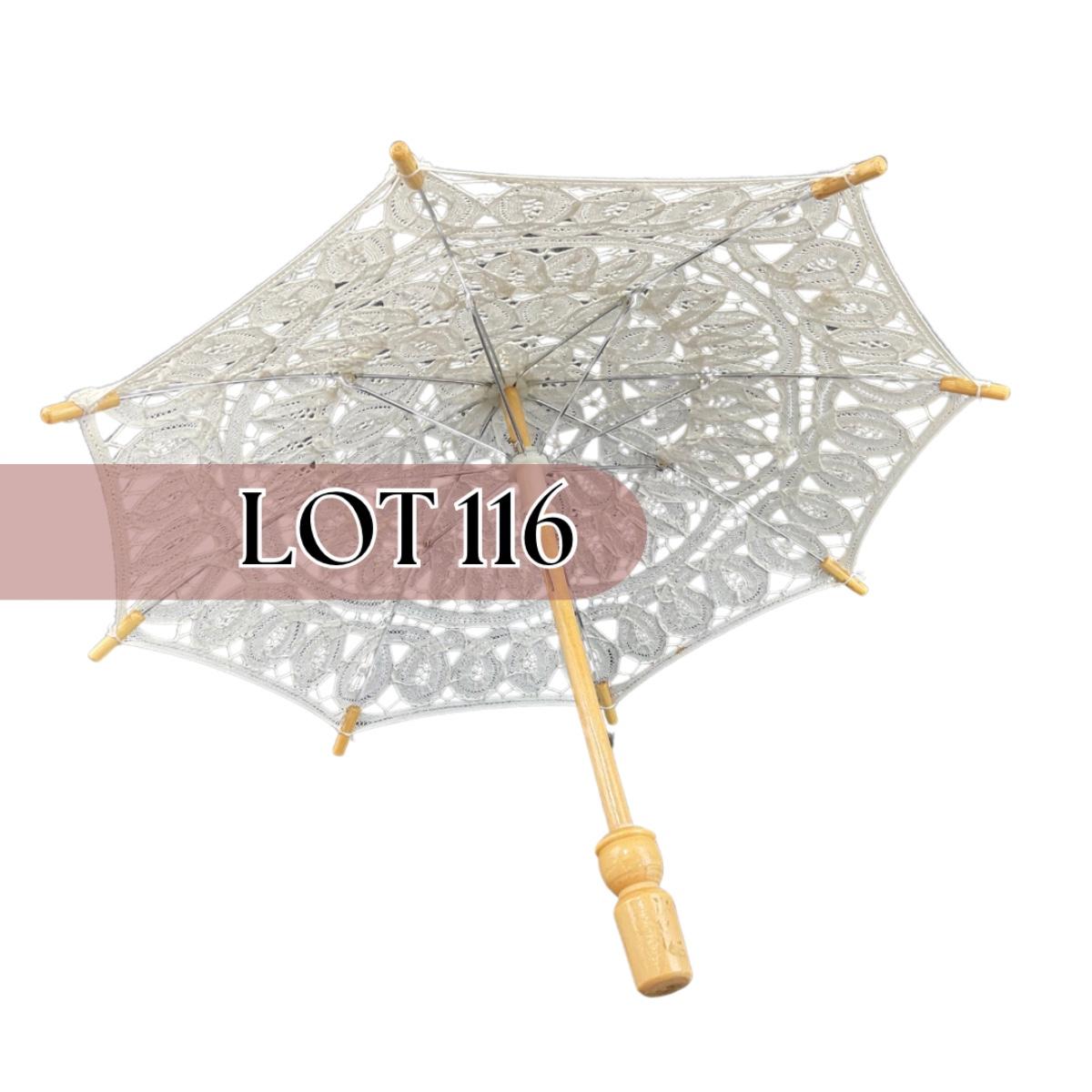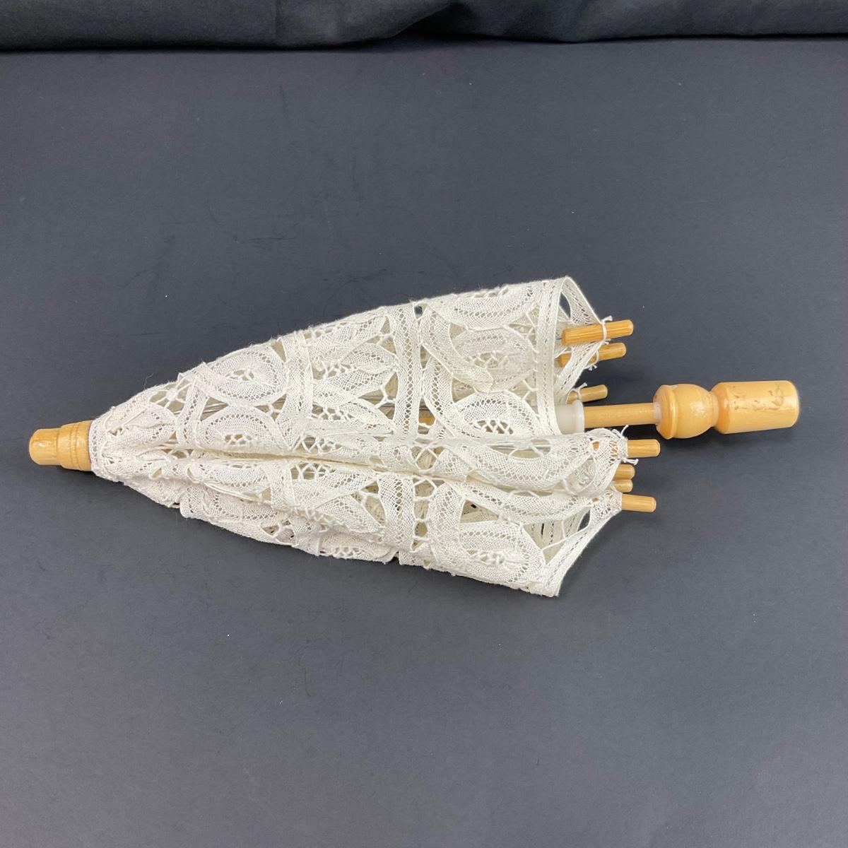 One vintage small white lace parasol. Opens and closes with ease. This piece has no damage, and appears to be in great shape with no visable chips, cracks, or broken pieces. Please see photos for details and condition. Any condition statement is given as a courtesy to a client, is an opinion, and should not be treated as a statement of fact. Reference to condition written, oral or within a condition report shall not be regarded as a full account of condition and may not include all defects, alterations, or restorations. Absence of a condition report does not imply a lot is flawless or lacking imperfections or damage. Katherine’s Auction & Appraisal Service shall have no responsibility for any error or omission. Returns shall not be accepted on the basis of condition. ::: Shipping is available on this lot. If you require shipping you must let us know at the close of the auction. We will coordinate with you after the item has been won. Shipping fees will include insurance up to or exceeding the value of all items being mailed. If you have any questions regarding this lot please contact the auctioneer either via this website, by direct email or by phone. PICK UP TIMES and other important information can be found in the TERMS and DESCRIPTION of the auction. Please take a look for pertinent information. Thanks!