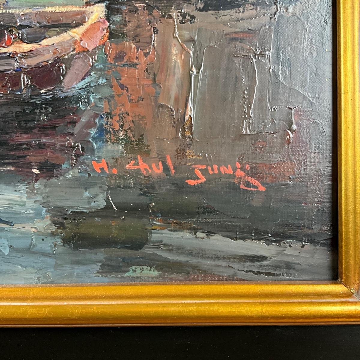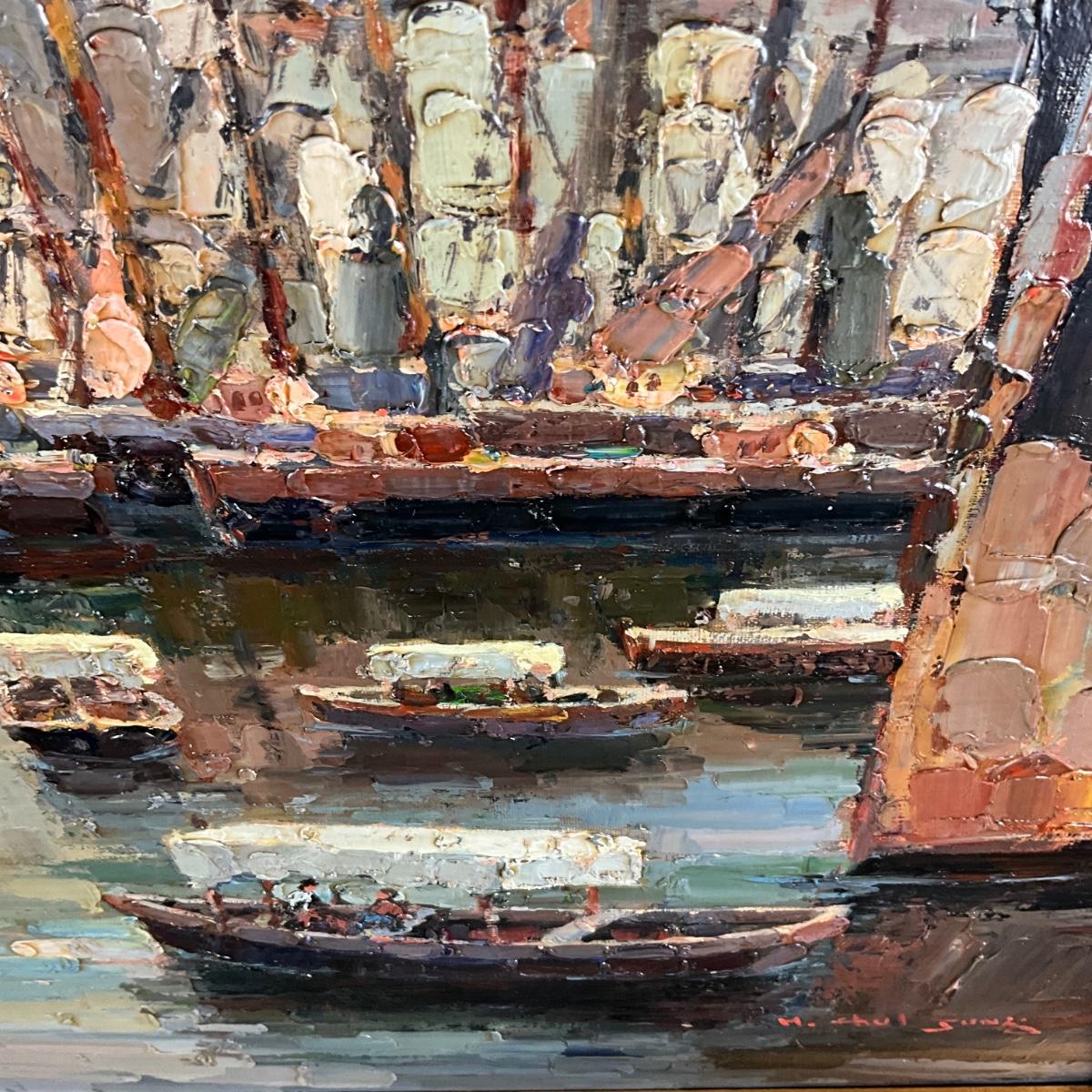 H. Chul Sung was a Korean artist active during the mid-to-late 20th century, known for impressionistic harbor scenes rendered with thick impasto brushwork and muted coastal palettes