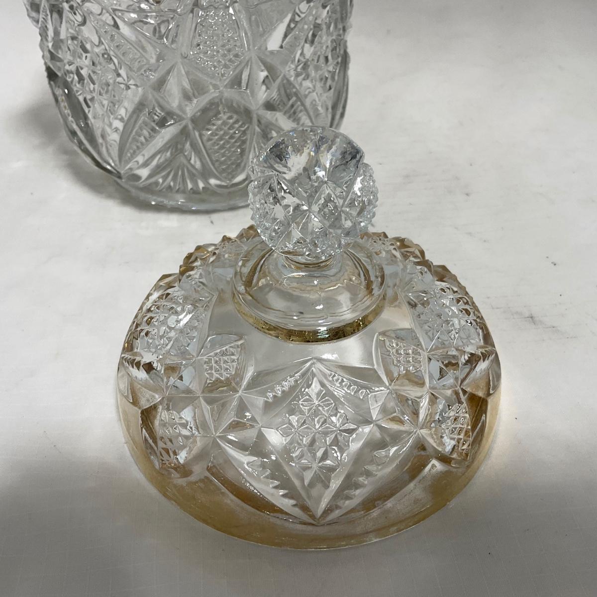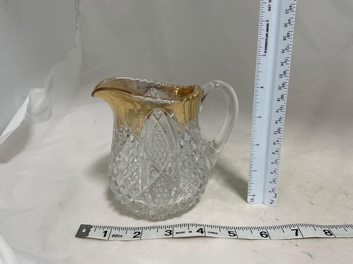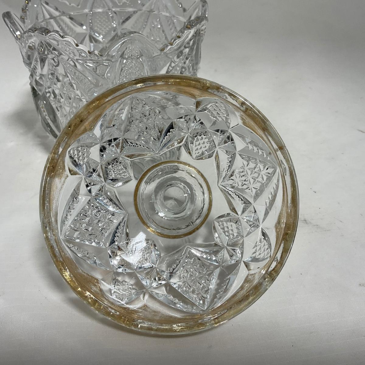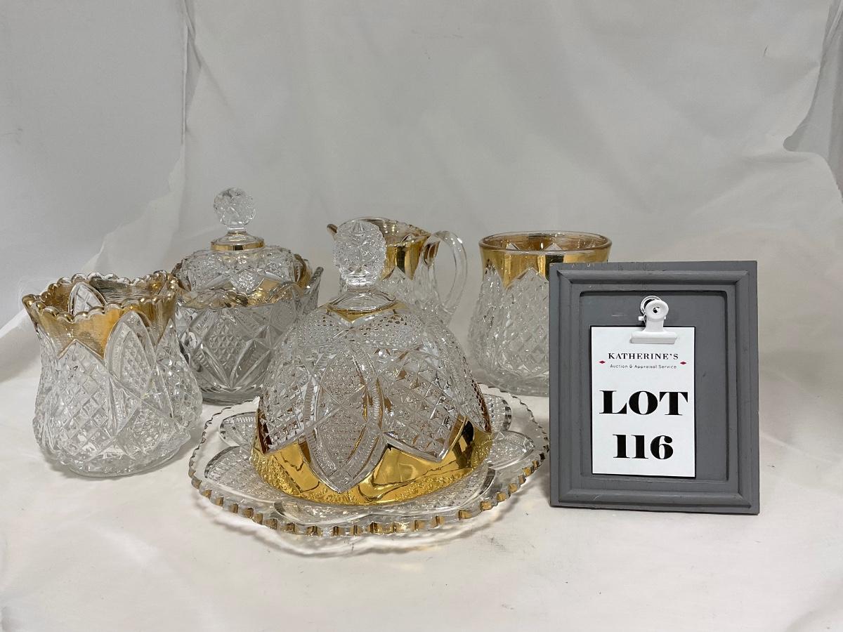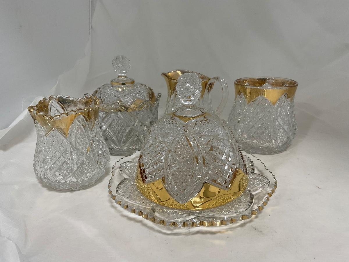 Heavy clear glass with gold accents covered butter dish, lidded jar, jar, and creamer and sugar set. Stunning set perfect for any family table this holiday season. Please see photos for details and condition. ::: Shipping is available on this lot. If you require shipping you must let us know at the close of the auction. We will coordinate with you after the item has been won. Shipping fees will include insurance up to or exceeding the value of all items being mailed. If you have any questions regarding this lot please contact the auctioneer either via this website, by direct email or by phone. PICK UP TIMES and other important information can be found in the TERMS and DESCRIPTION of the auction. Please take a look for pertinent information. Thanks!