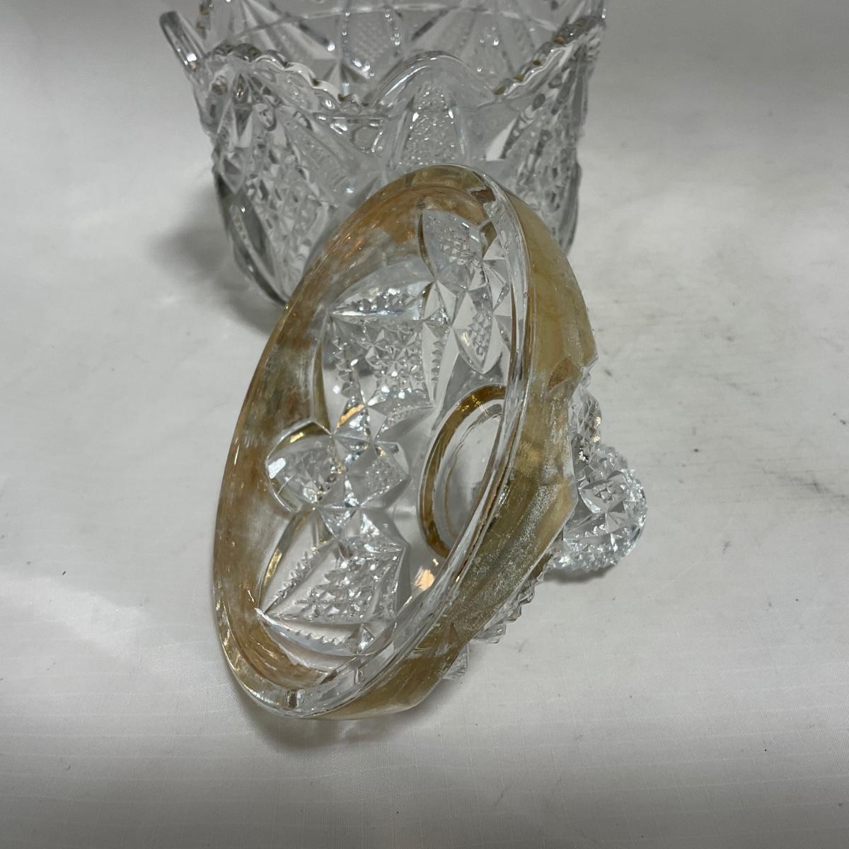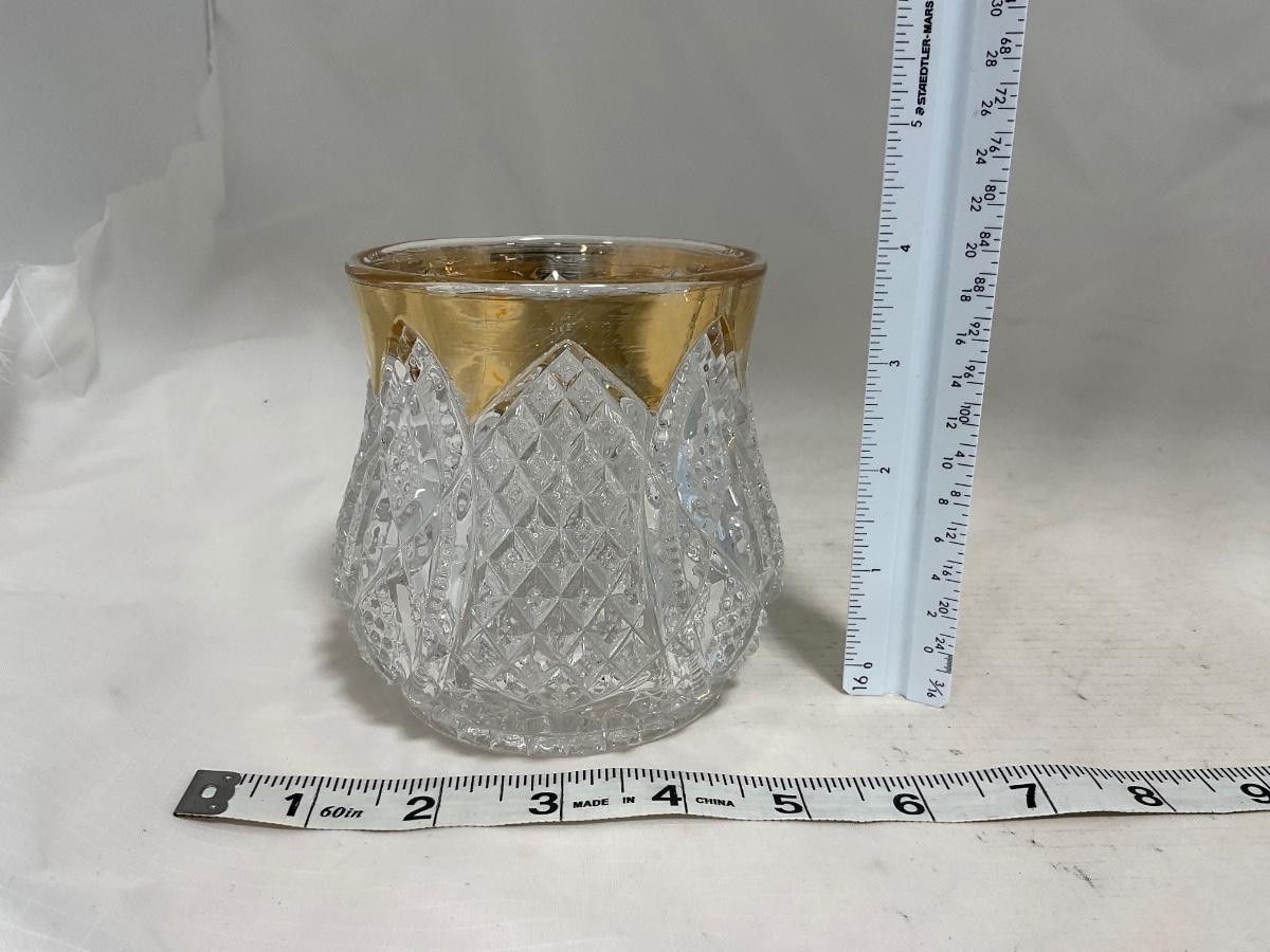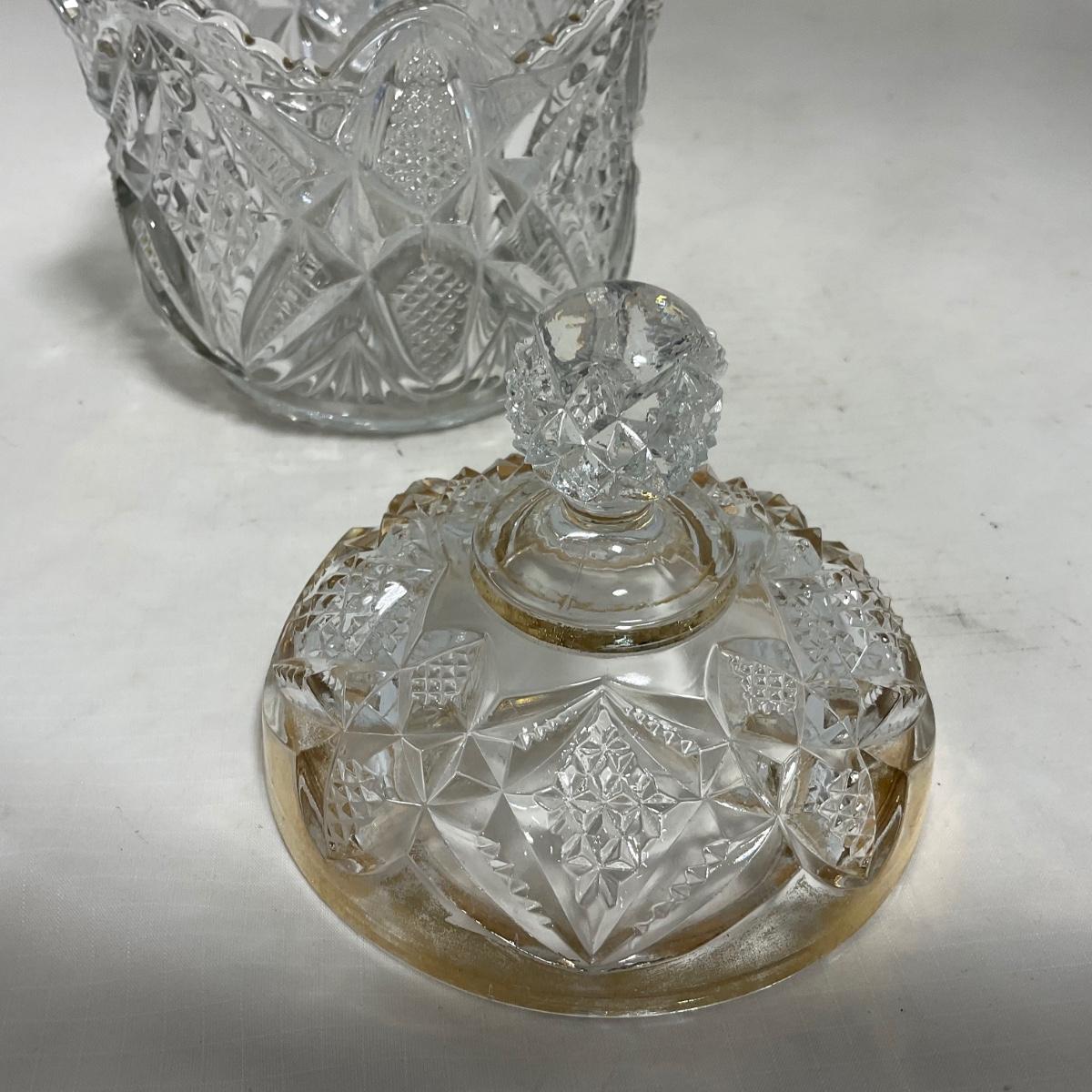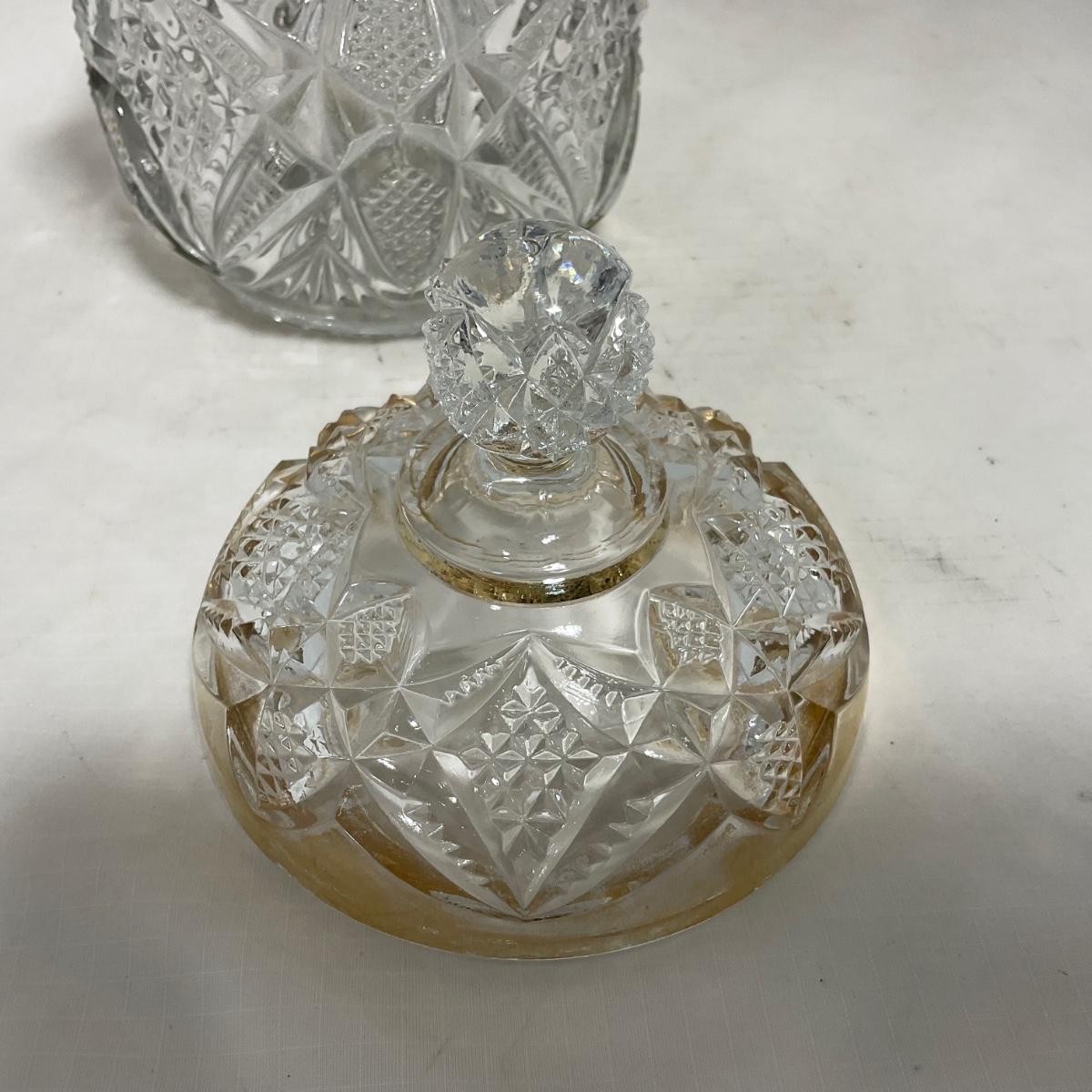 Heavy clear glass with gold accents covered butter dish, lidded jar, jar, and creamer and sugar set. Stunning set perfect for any family table this holiday season. Please see photos for details and condition. ::: Shipping is available on this lot. If you require shipping you must let us know at the close of the auction. We will coordinate with you after the item has been won. Shipping fees will include insurance up to or exceeding the value of all items being mailed. If you have any questions regarding this lot please contact the auctioneer either via this website, by direct email or by phone. PICK UP TIMES and other important information can be found in the TERMS and DESCRIPTION of the auction. Please take a look for pertinent information. Thanks!