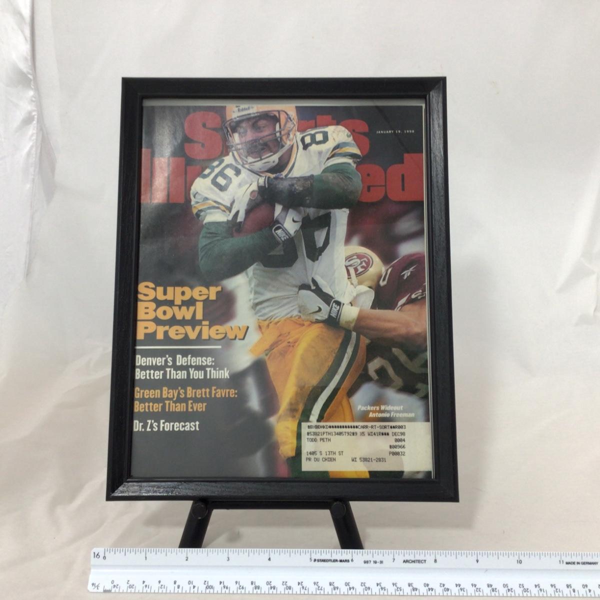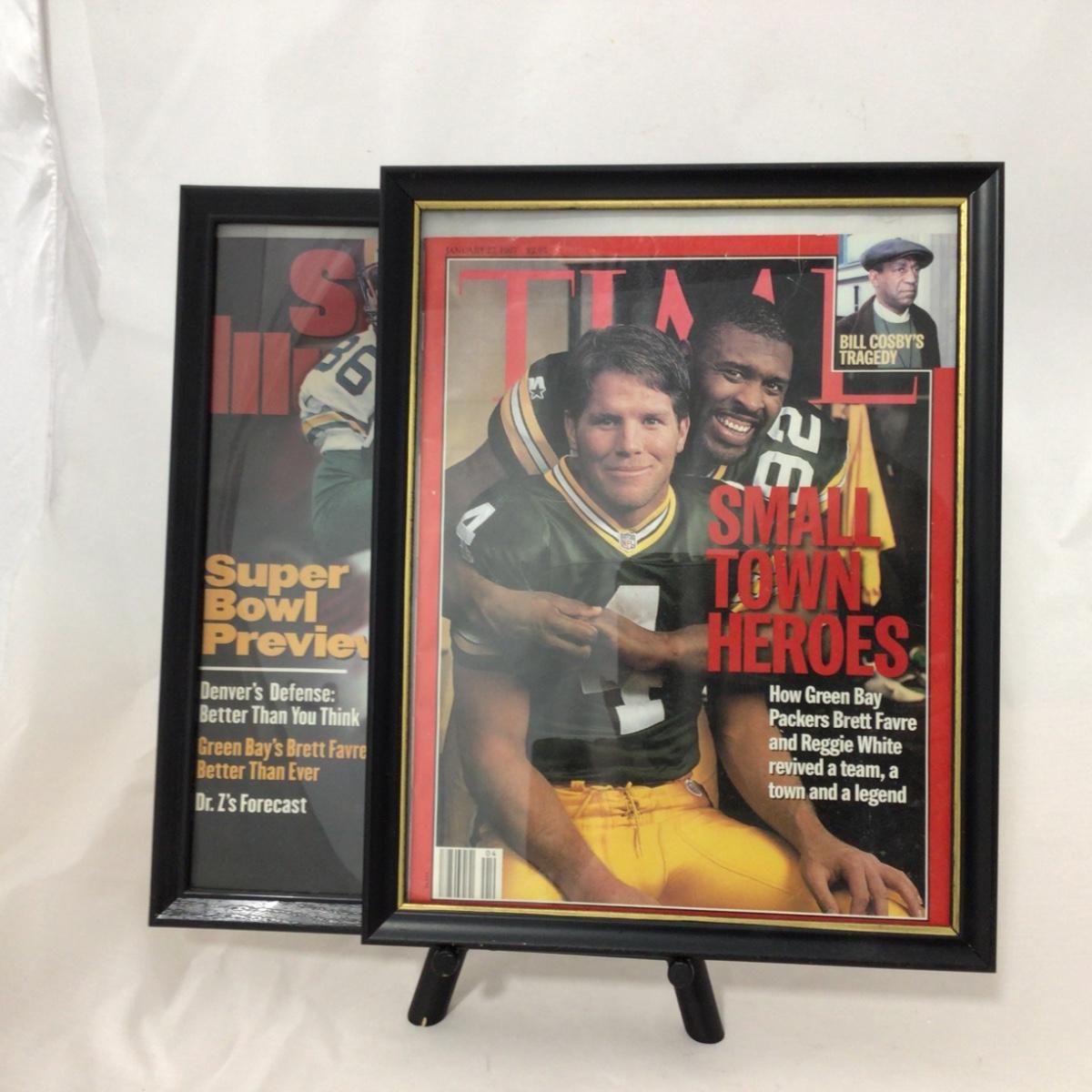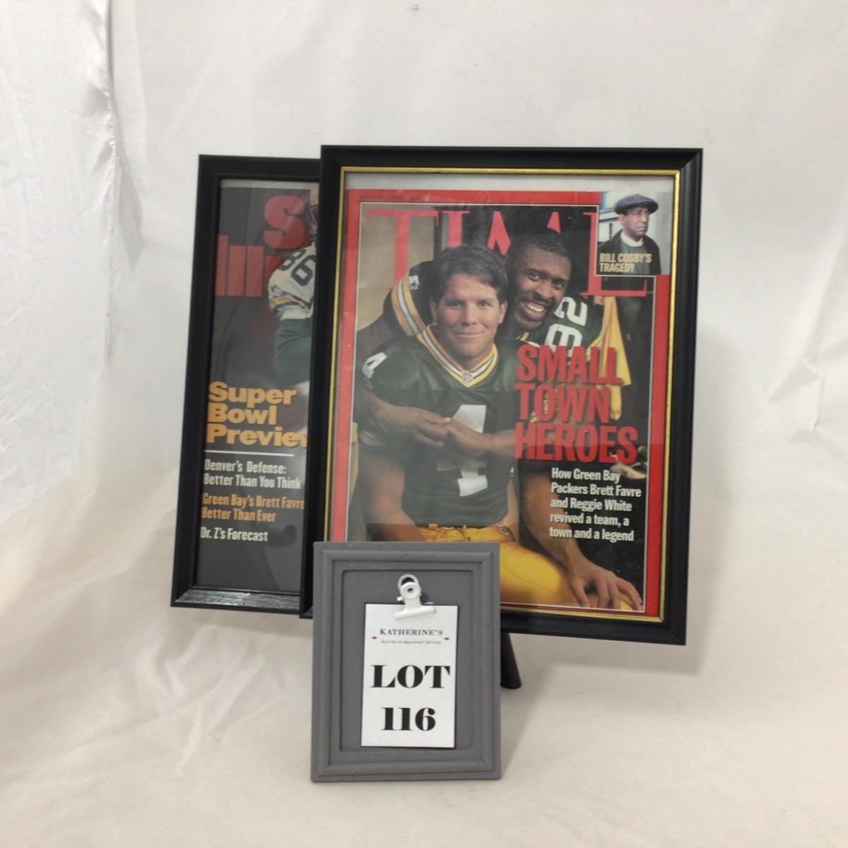 Two framed magazines one time magazine with Reggie White and Brett Favre. One Sports Illustrated Antonio Freeman. Both 9 inches by 11.5 inches. Please see photos for details and condition. ::: Shipping is available on this lot. If you require shipping you must let us know at the close of the auction. We will coordinate with you after the item has been won. Shipping fees will include insurance up to or exceeding the value of all items being mailed. If you have any questions regarding this lot please contact the auctioneer either via this website, by direct email or by phone. PICK UP TIMES and other important information can be found in the TERMS and DESCRIPTION of the auction. Please take a look for pertinent information. Thanks!