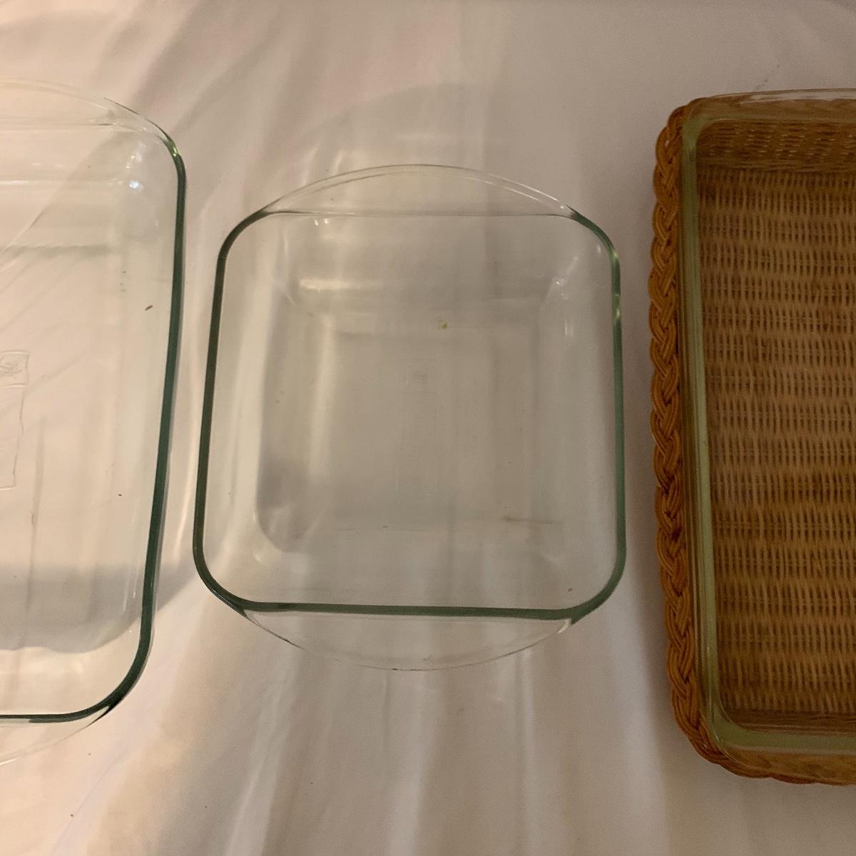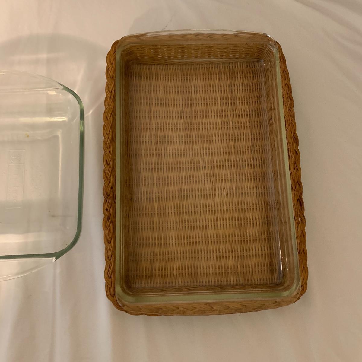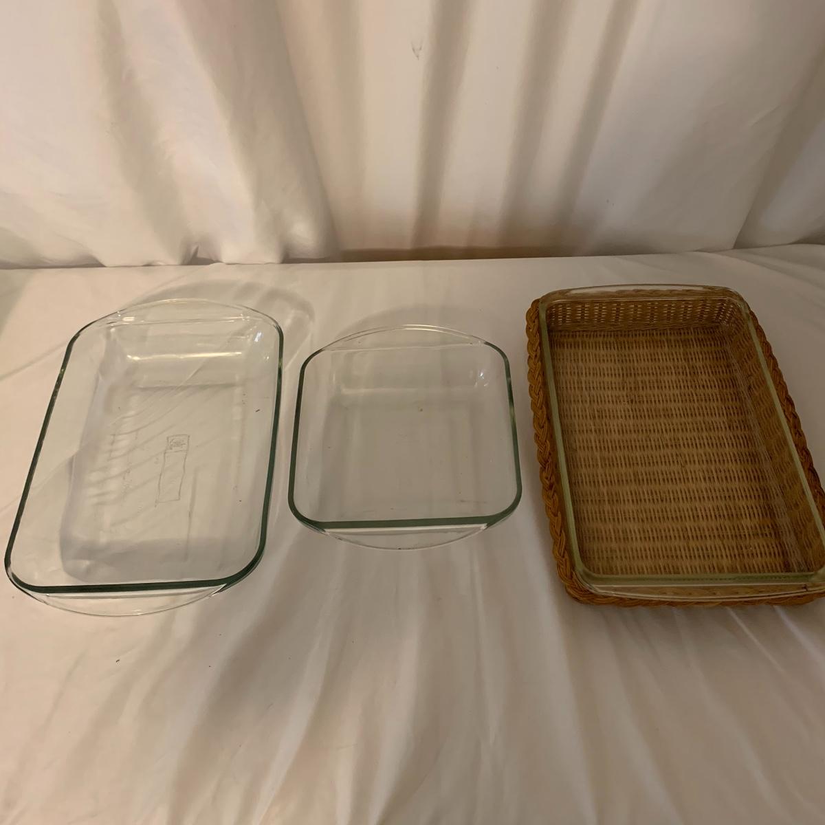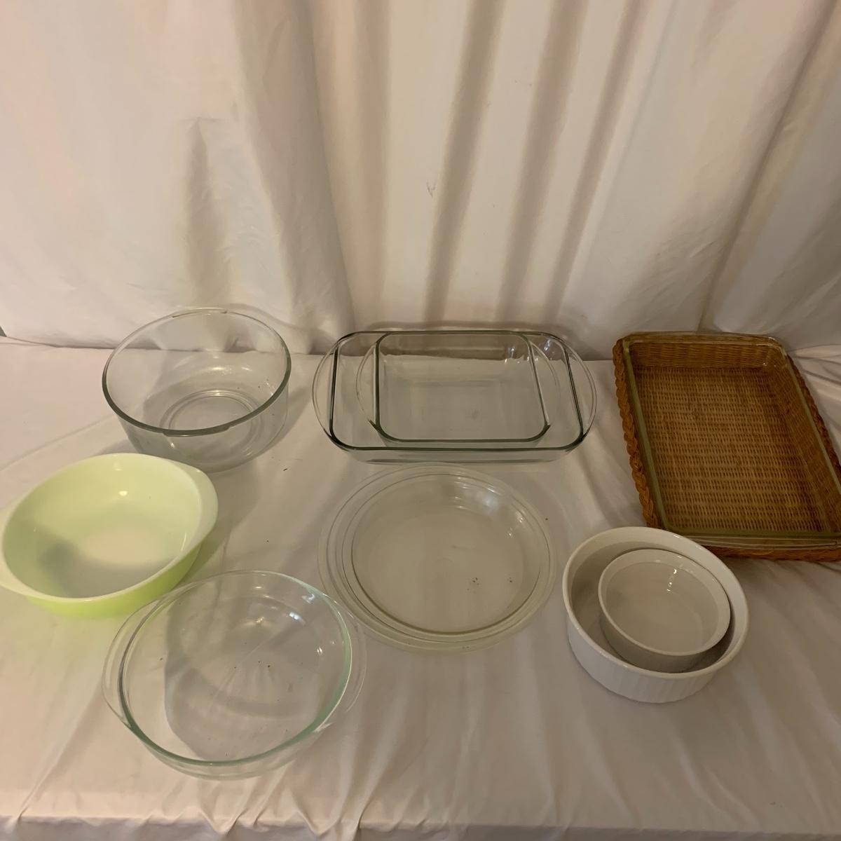Add durable Pyrex to your kitchen collection. This lot includes three rectangle casserole dishes one of which comes with a fitted wicker basket. Also featured are two clear glass bowls and one green. Three pie bowls are included as well as two Corning Ware bowls.