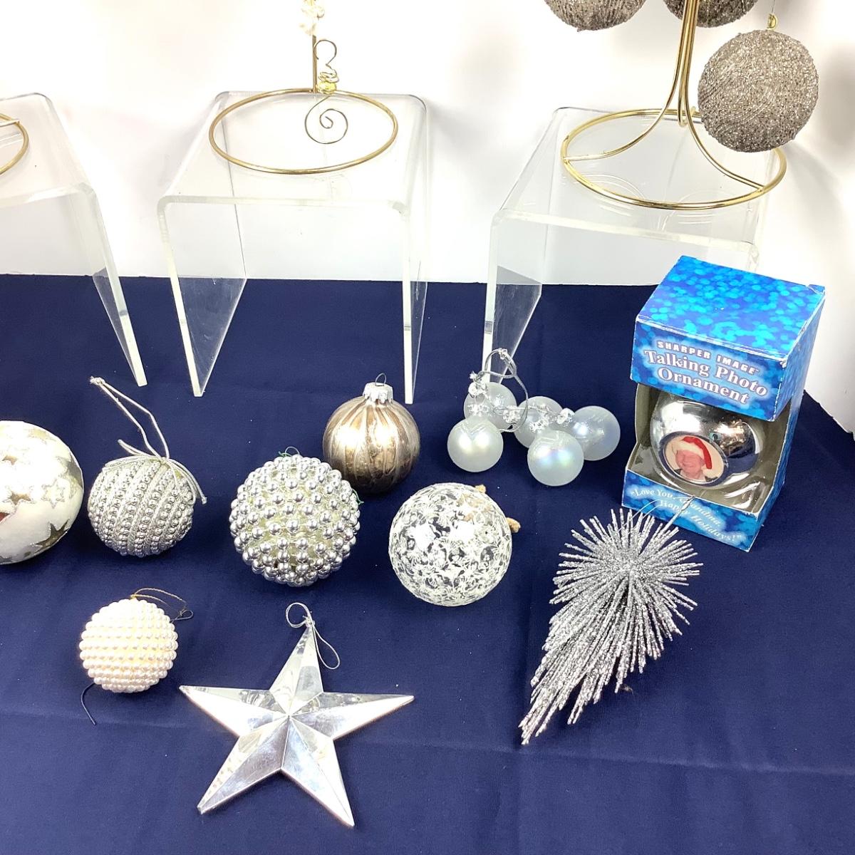 This lot contains 17 various ornaments including a new Sharper Image photo ornament that talks. The ornaments are glass, plastic and metal.