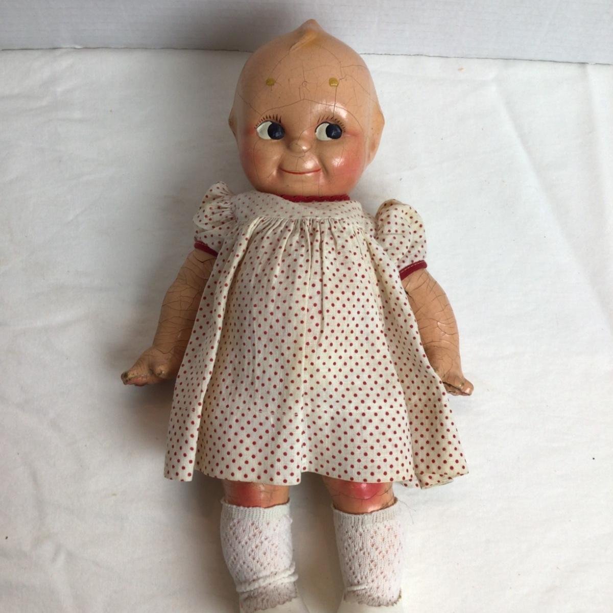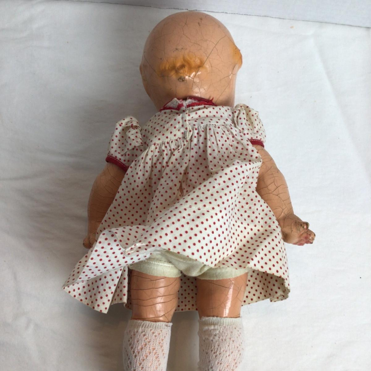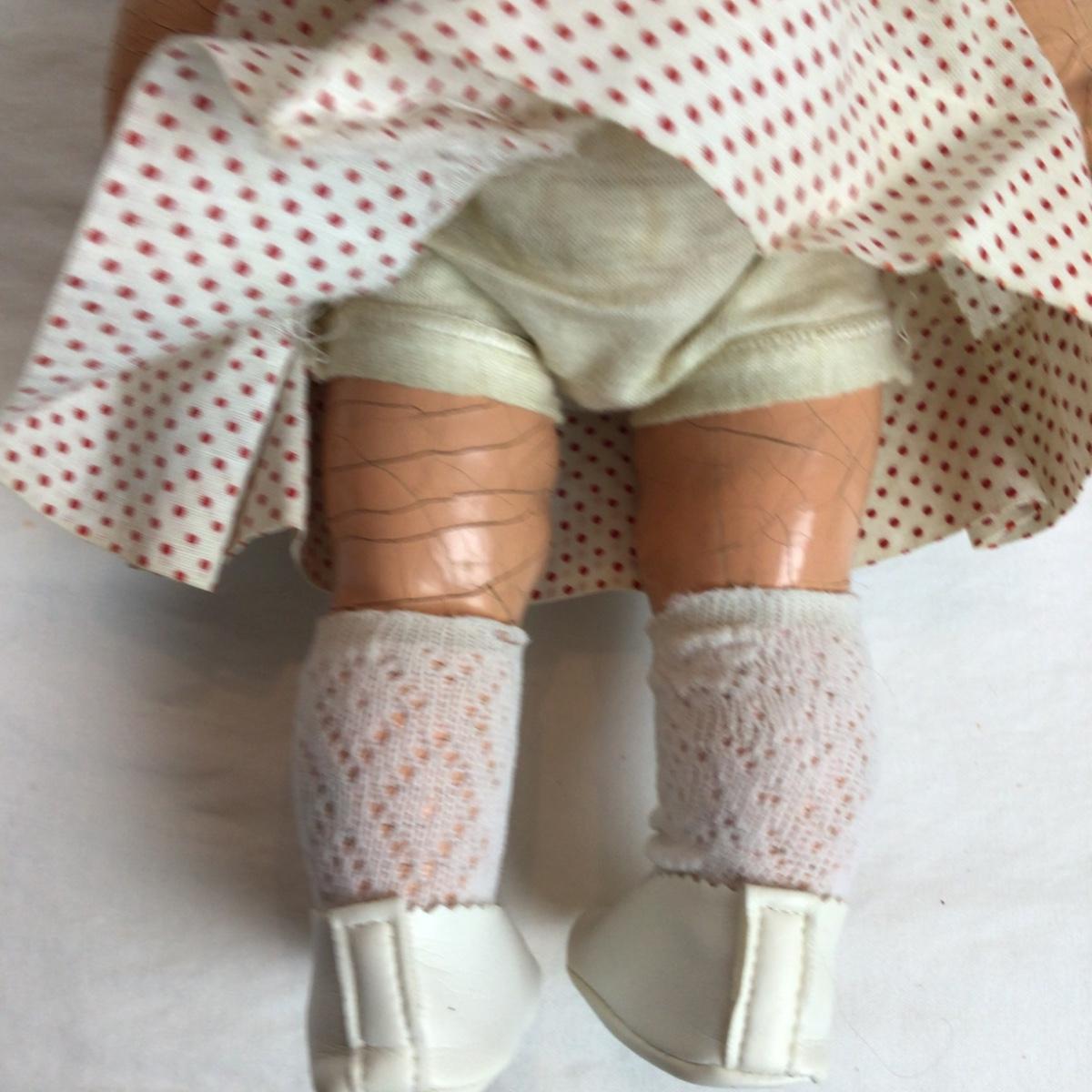 Doll is approximately 12” tall, red polka dotted dress, socks and shoes. The composition doll has wear and signs of age.