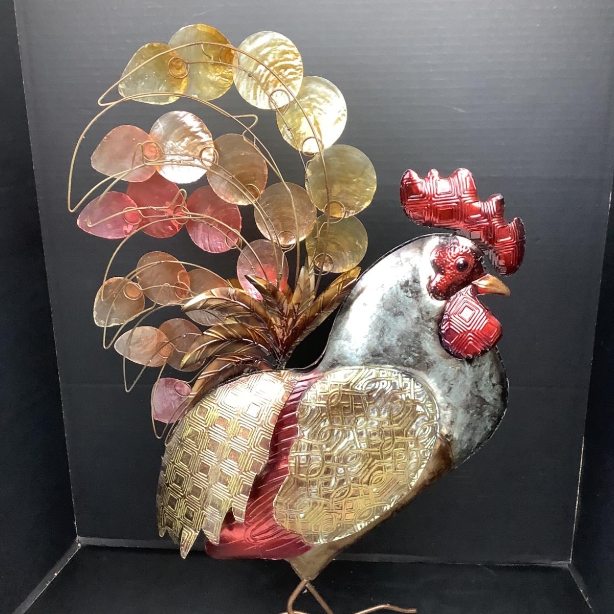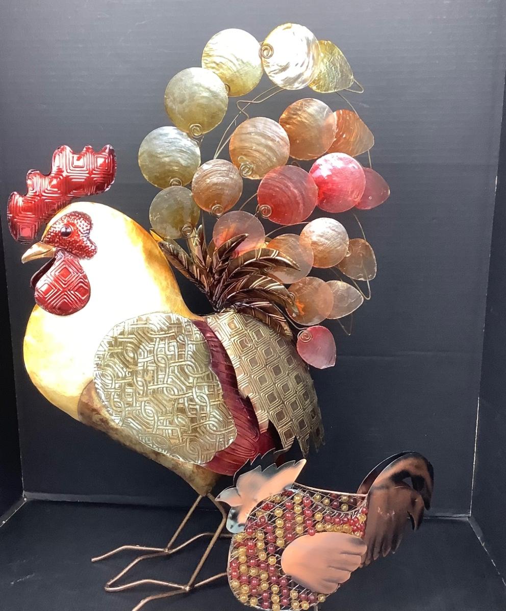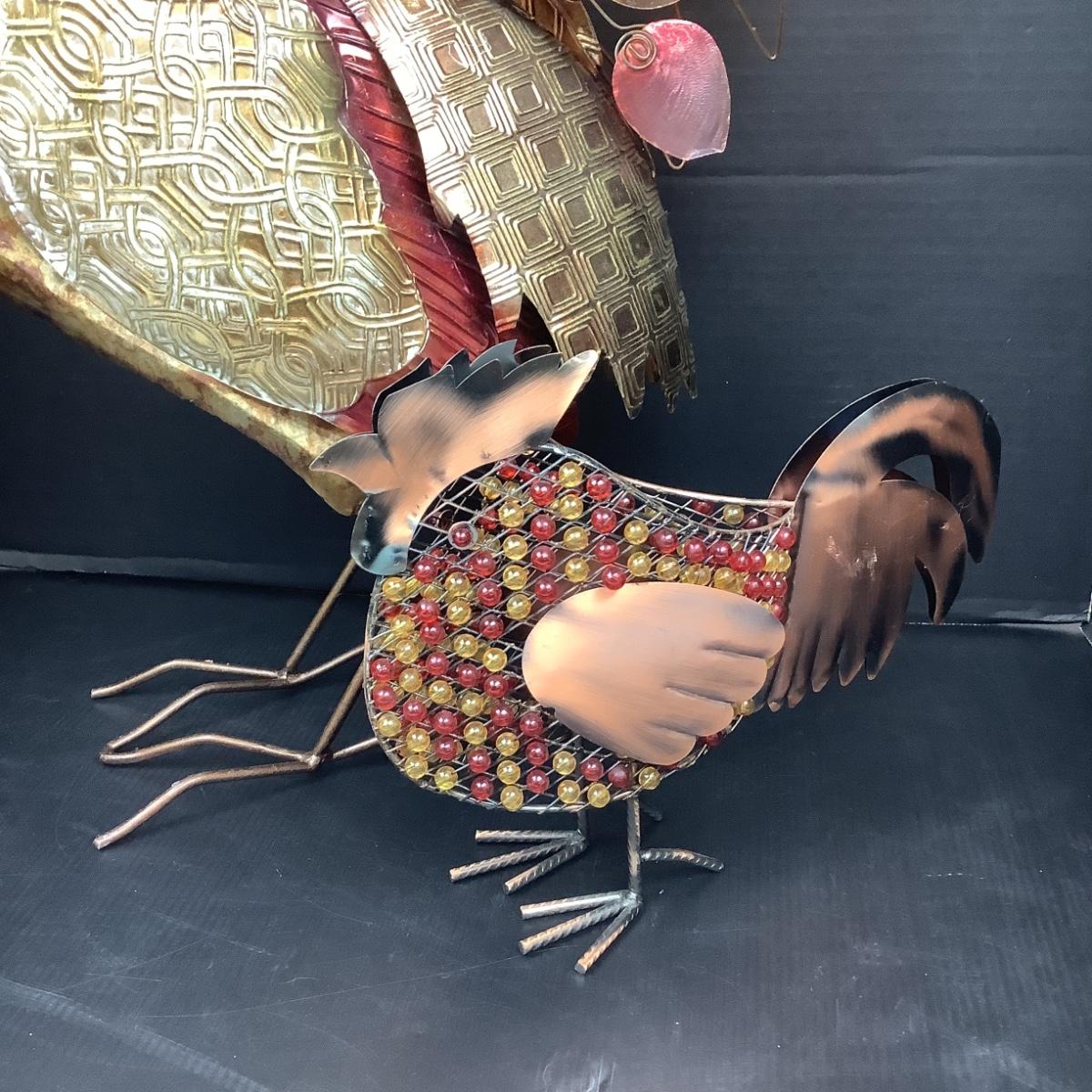 Large rooster is 24" tall x 16" at its widest, small beaded and metal rooster is 8" tall and 10" wide.