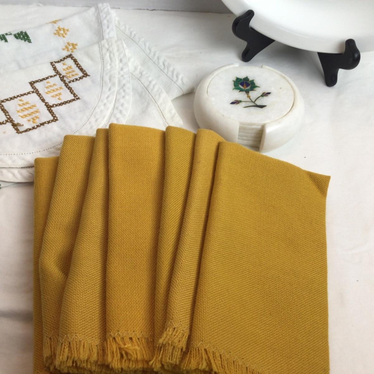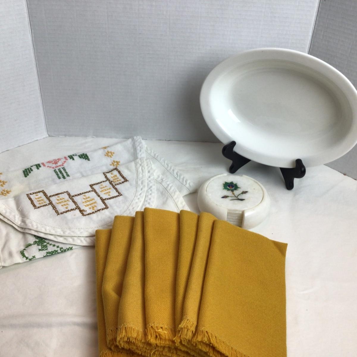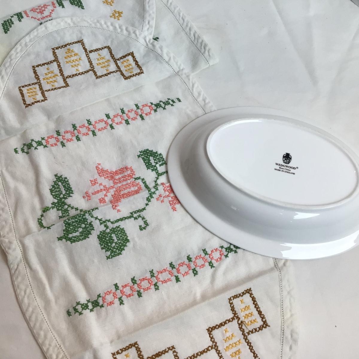 Lot contains Wedgewood bowl, stone floral coasters, linen napkins and cross stitch doilies.