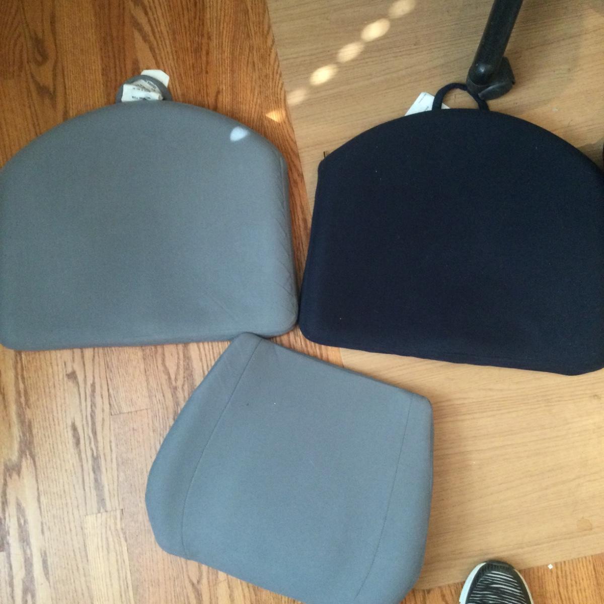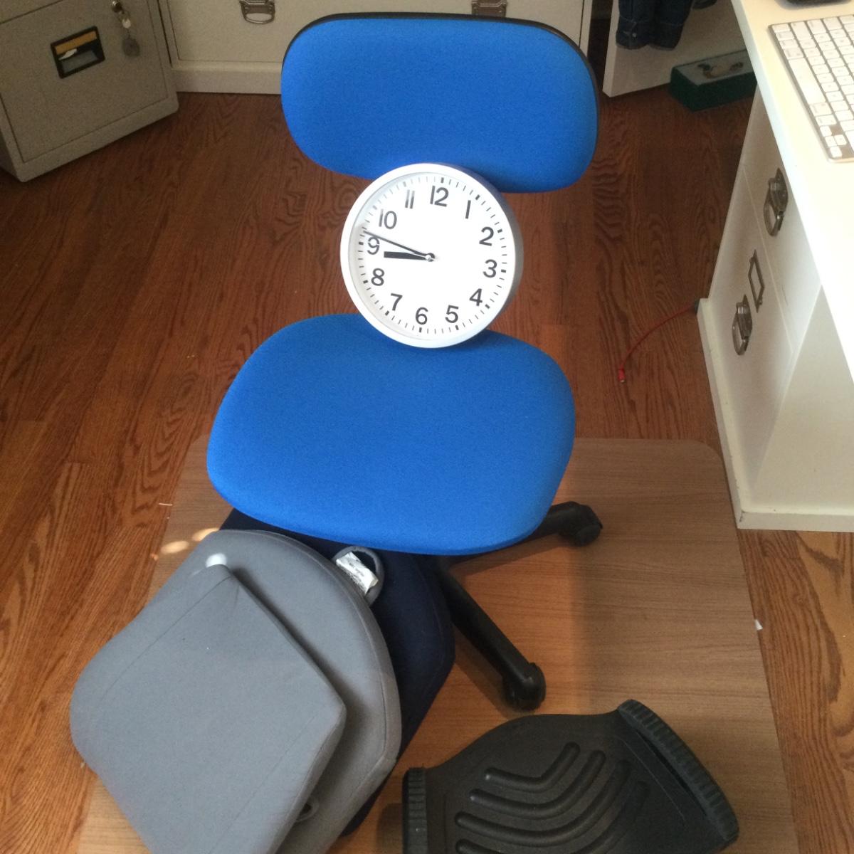 Lot contains blue office chair on wheels, 3 assorted seat cushions and lumbar pillow, foot rest with wheels for exercise and wall clock.
