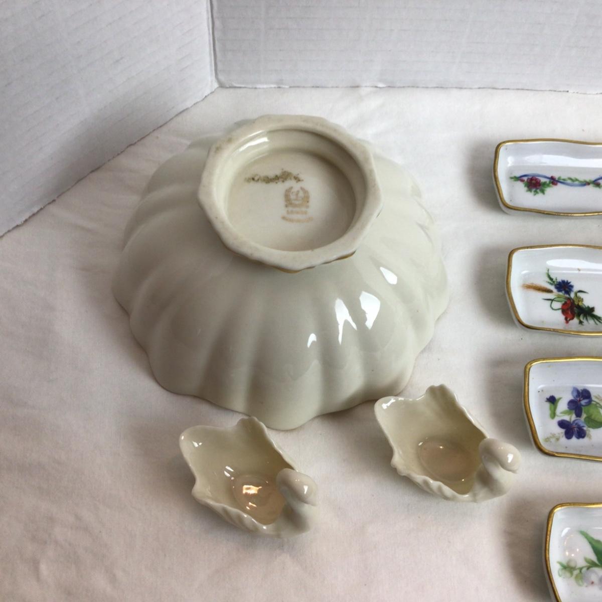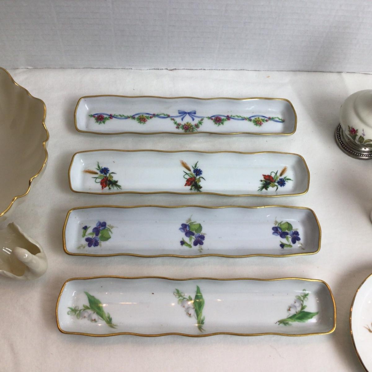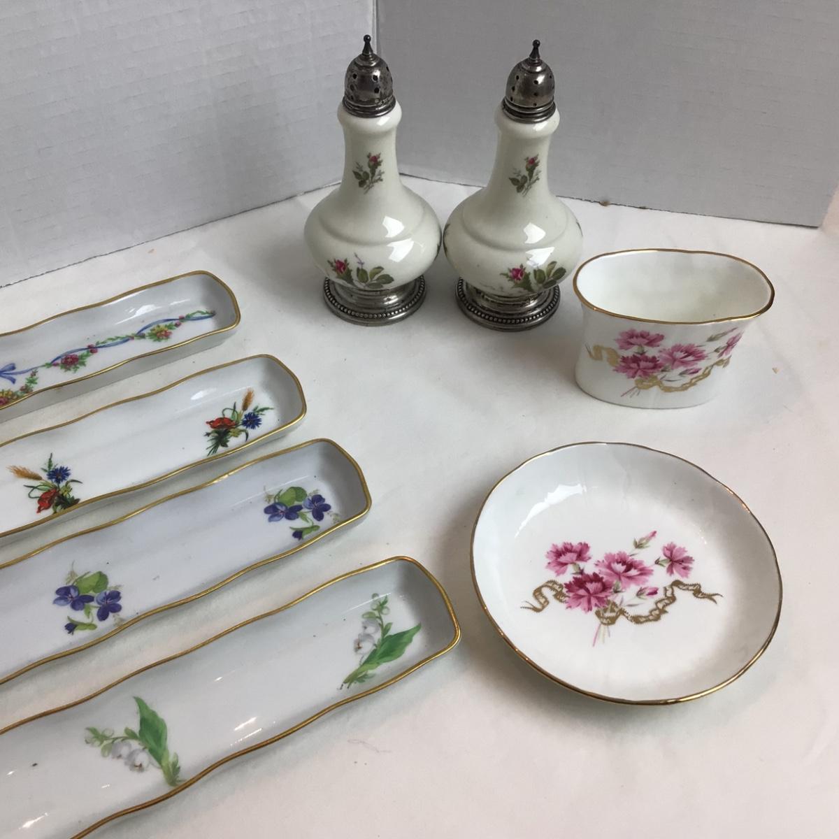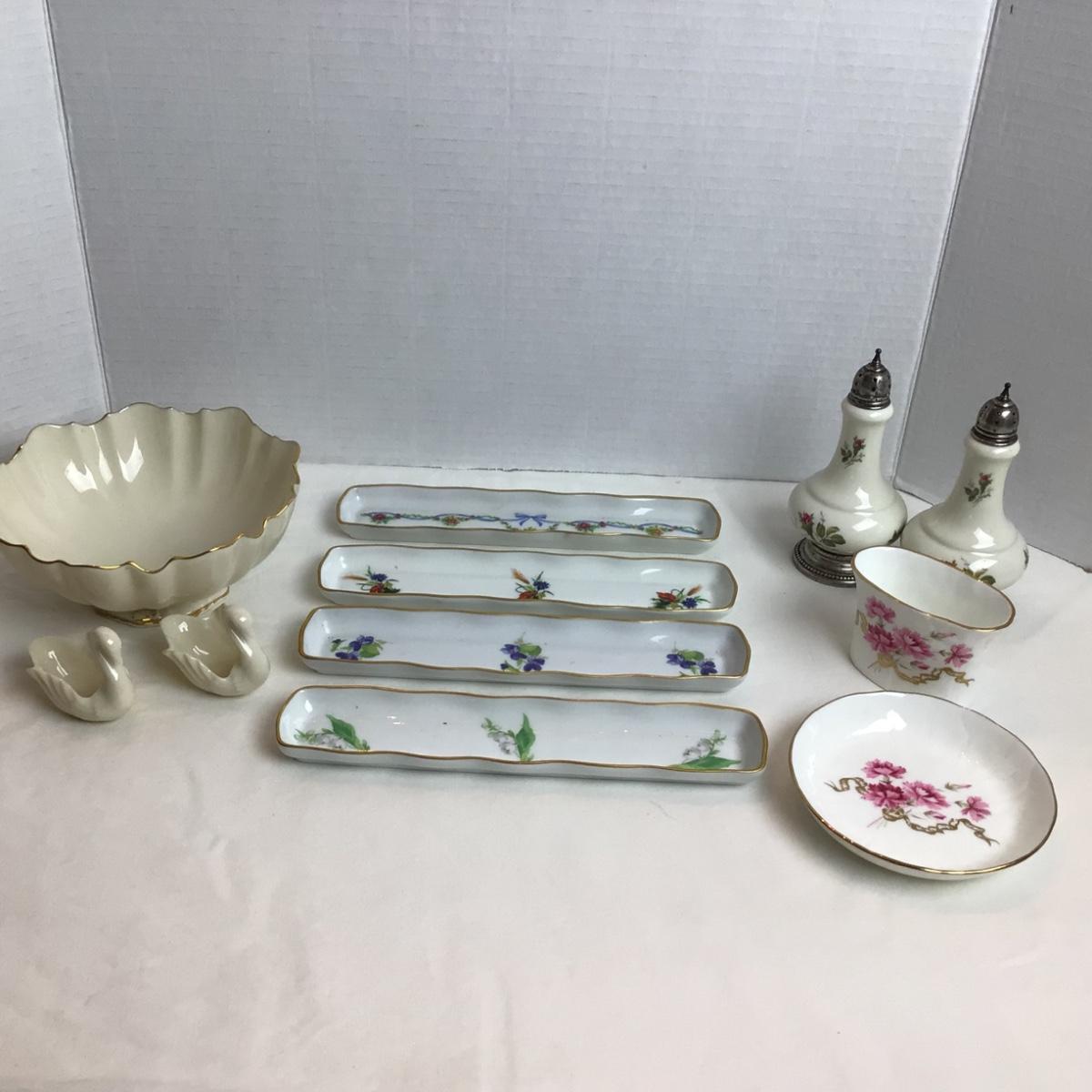 The lot contains Lenox bowl and swan dishes, floral Limoges dishes, Rosenthal salt & Pepper shakers and Aynsley floral dish and plate.