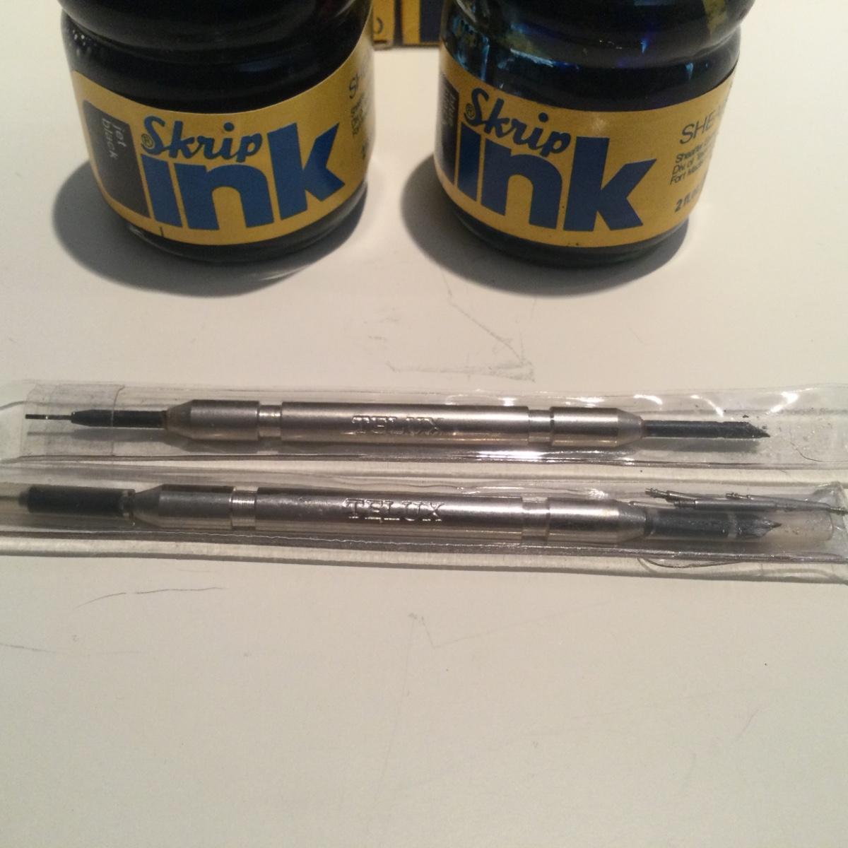 One of the ink bottles is empty and the other is full, there are Telux pencil refils and assorted pens.