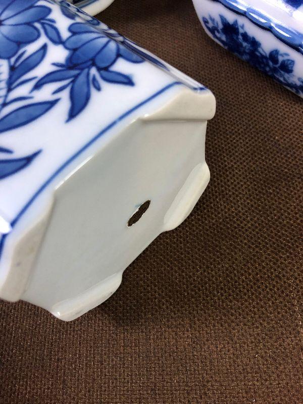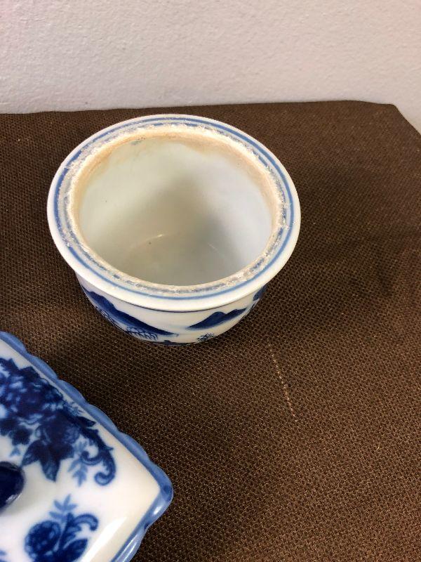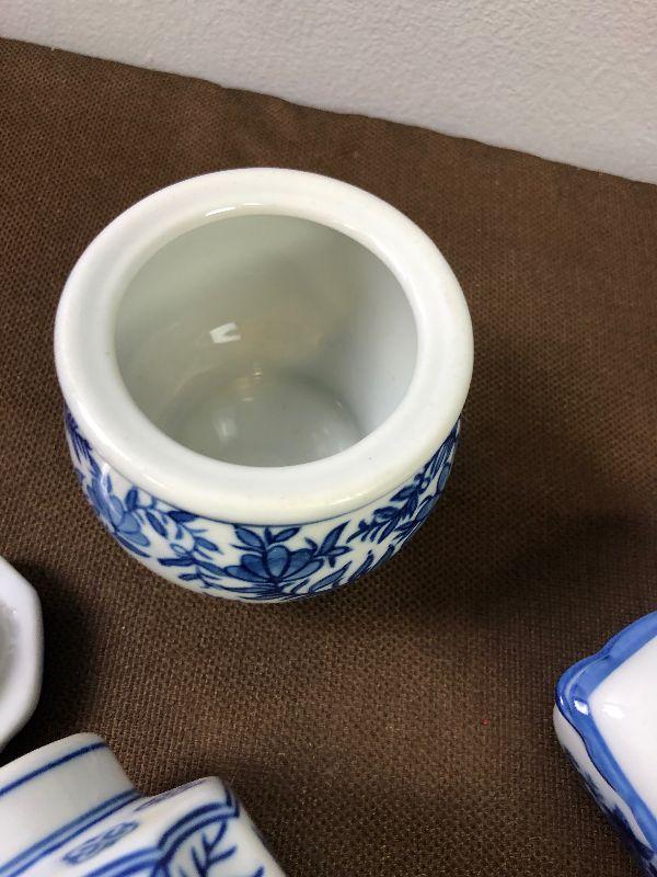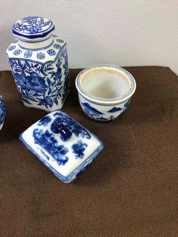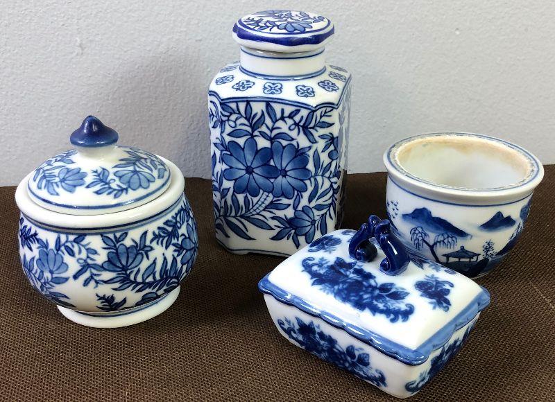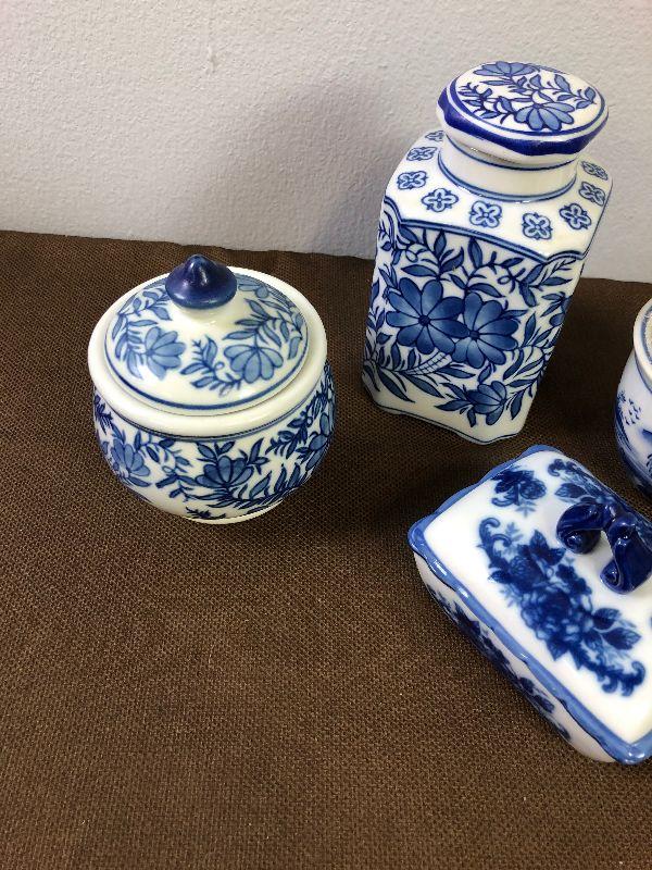 #117 4 Blue Transfers ware Sugars Bows and canisters