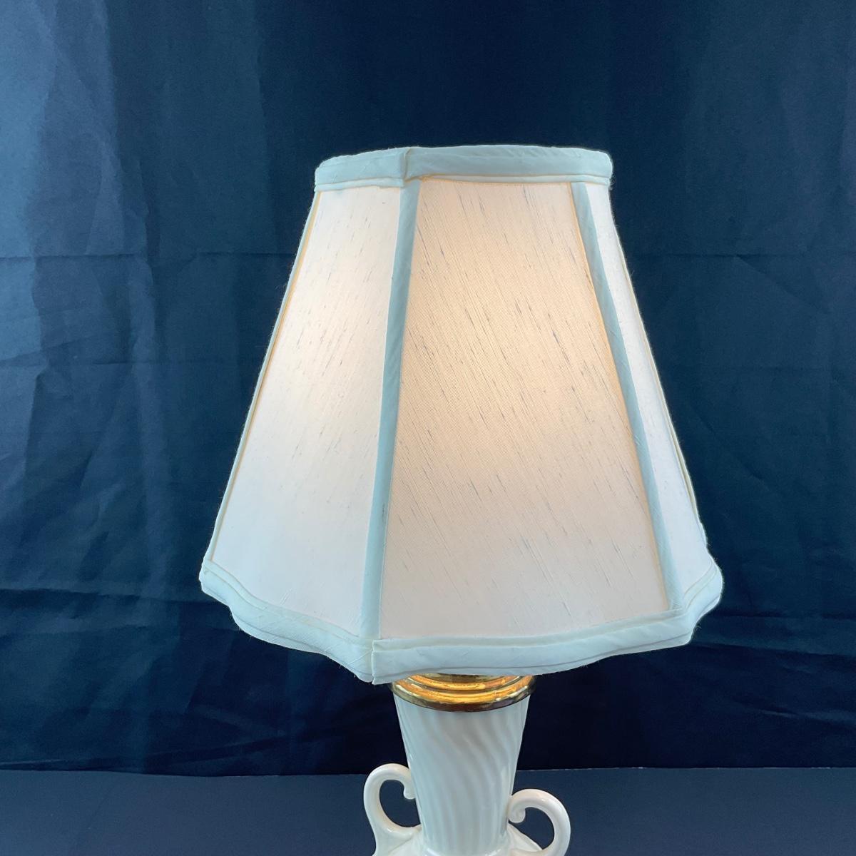 One vintage Belleek shamrock Ireland porcelain lamp in working condition unmarked but believed to be authentic. 18.5 inches tall with the shade. Please see photos for details and condition. Any condition statement is given as a courtesy to a client, is an opinion, and should not be treated as a statement of fact. Reference to condition written, oral or within a condition report shall not be regarded as a full account of condition and may not include all defects, alterations, or restorations. Absence of a condition report does not imply a lot is flawless or lacking imperfections or damage. Katherine’s Auction & Appraisal Service shall have no responsibility for any error or omission. Returns shall not be accepted on the basis of condition. ::: Shipping is available on this lot. If you require shipping you must let us know at the close of the auction. We will coordinate with you after the item has been won. Shipping fees will include insurance up to or exceeding the value of all items being mailed. If you have any questions regarding this lot please contact the auctioneer either via this website, by direct email or by phone. PICK UP TIMES and other important information can be found in the TERMS and DESCRIPTION of the auction. Please take a look for pertinent information. Thanks!