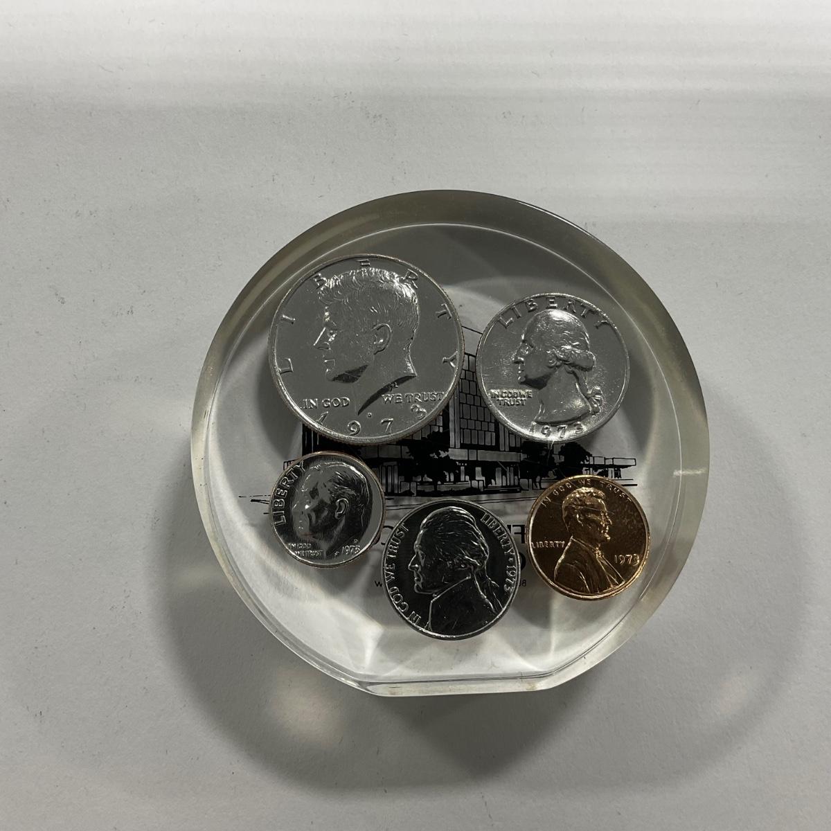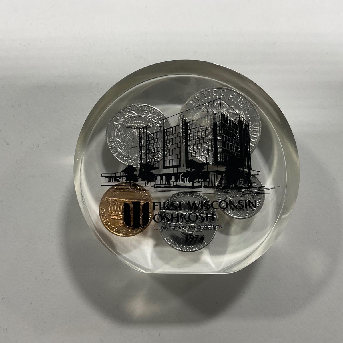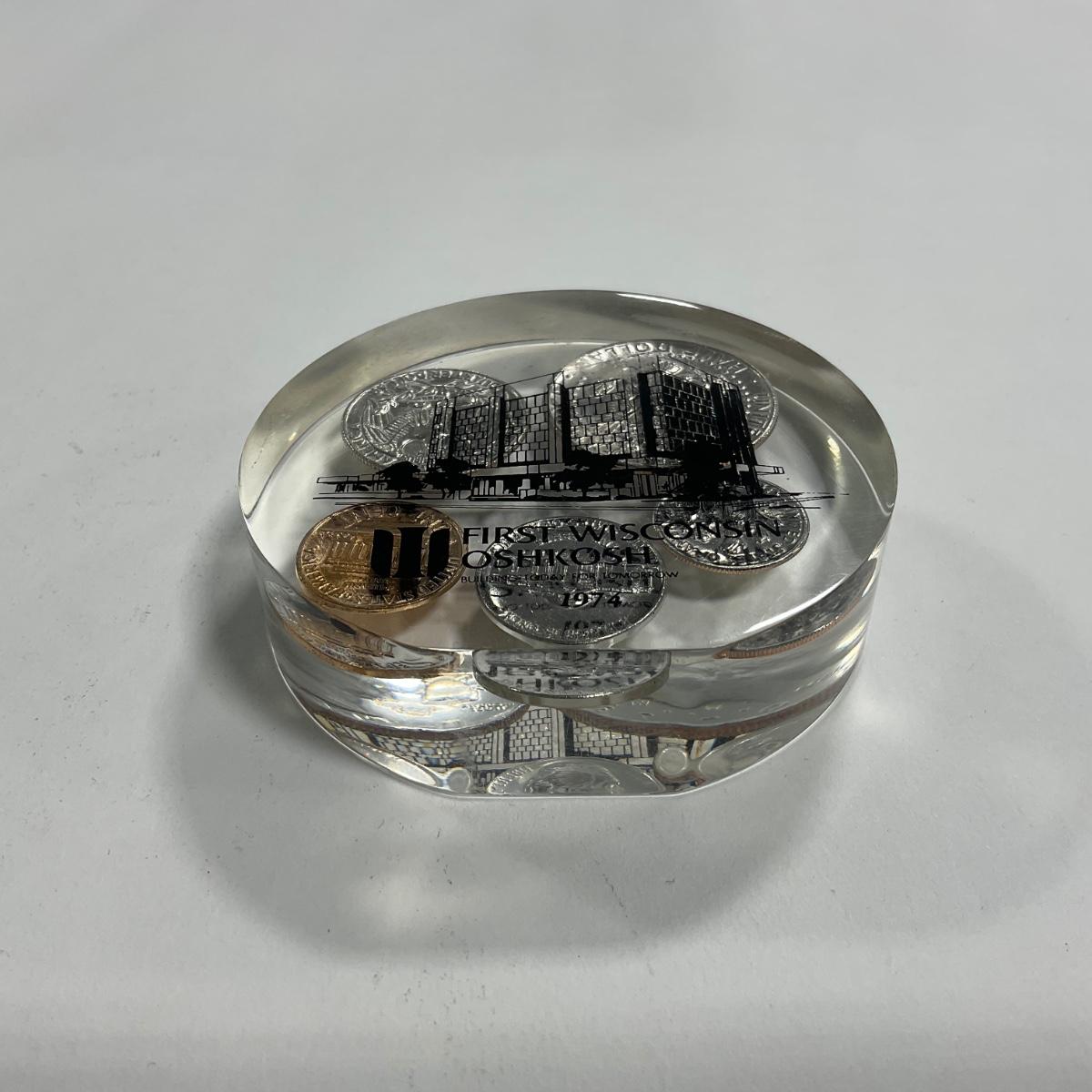 -117- COINS | First Wisconsin Oshkosh Acrylic Coin Desk Display | Coins Dated 1973