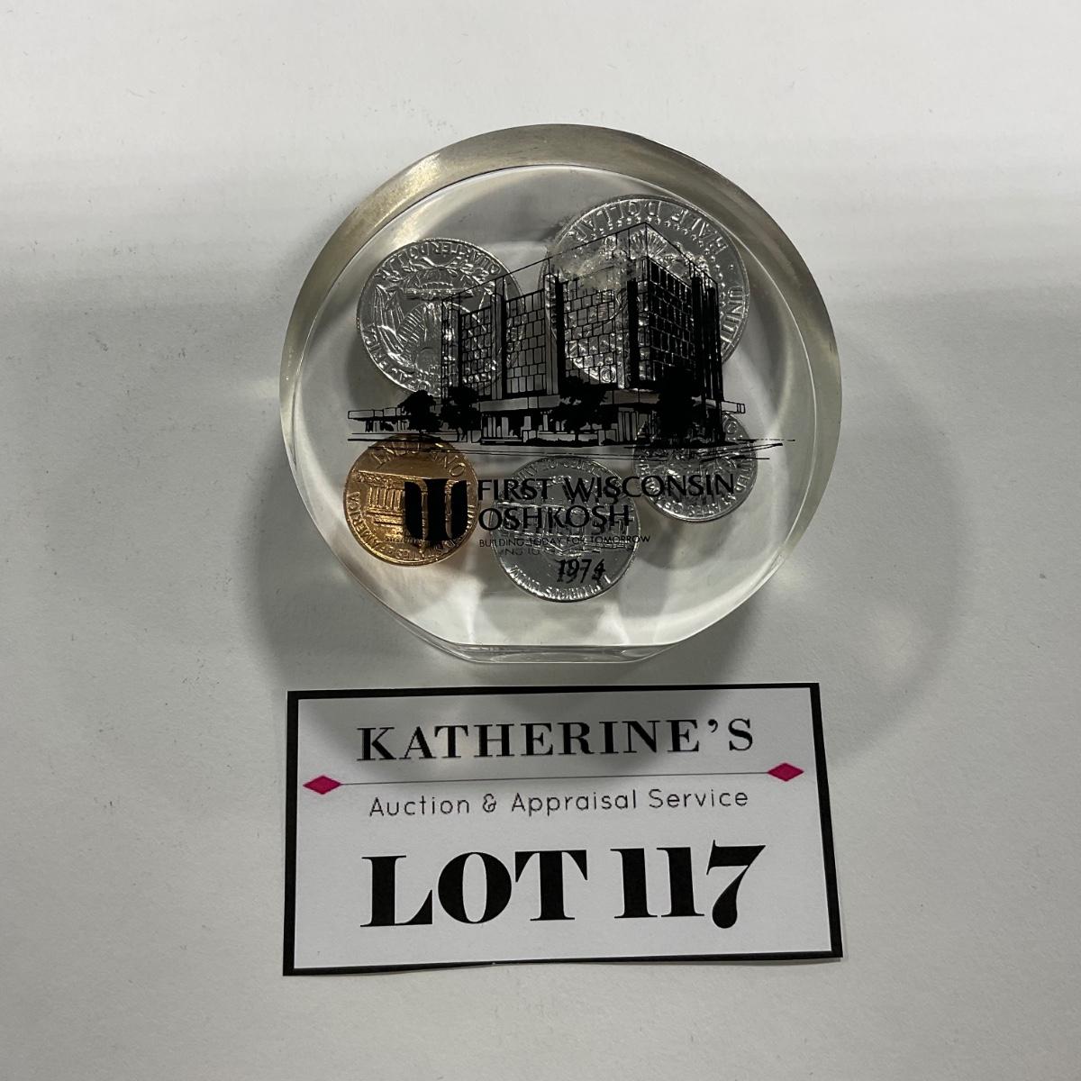 One First Wisconsin Oshkosh Acrylic Coin Desk Display, with Coins Dated 1973. Please see photos for details and condition. ::: Shipping is available on this lot. If you require shipping you must let us know at the close of the auction. We will coordinate with you after the item has been won. Shipping fees will include insurance up to or exceeding the value of all items being mailed. If you have any questions regarding this lot please contact the auctioneer either via this website, by direct email or by phone. PICK UP TIMES and other important information can be found in the TERMS and DESCRIPTION of the auction. Please take a look for pertinent information. Thanks!