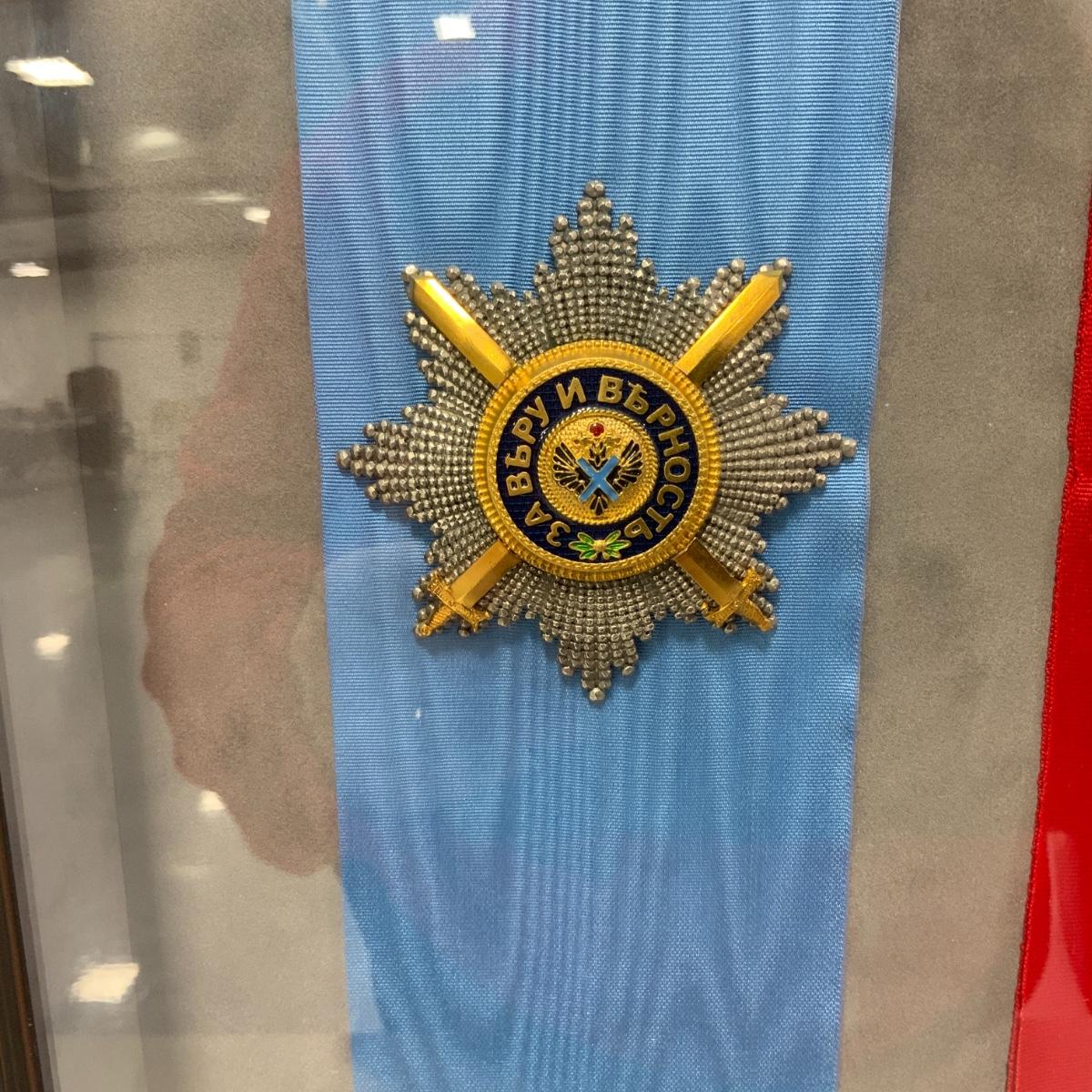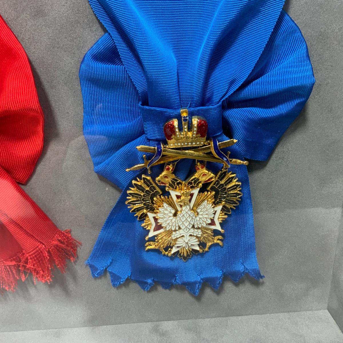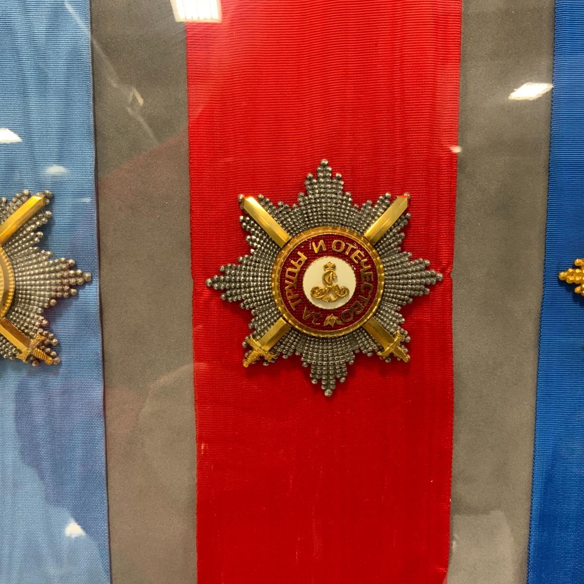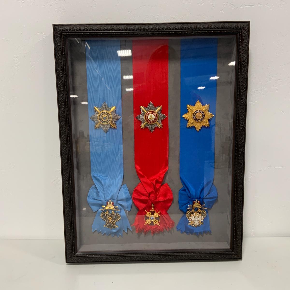 From the Estate of Peter and Alice Radovanovich: Framed set of three medals with the accompanying decorations and colors. From Left to Right: The Order of Saint Andrew the Apostle, The First Called (Awarded to the most outstanding civilians or for military merit), The Order of Saint Alexander Nevsky (Awarded for bravery in battle), The Order of the White Eagle (A high-status award that was preferred to be given to non-Christians that had earned a distinction). All medals are excellent reproductions. They are framed behind conservation glass by a reputable local frame shop. Frame measures 27” x 20.5”. Please see photos for details and condition. ::: Shipping is available on this lot. If you require shipping you must let us know at the close of the auction. We will coordinate with you after the item has been won. Shipping fees will include insurance up to or exceeding the value of all items being mailed. If you have any questions regarding this lot please contact the auctioneer either via this website, by direct email or by phone. PICK UP TIMES and other important information can be found in the TERMS and DESCRIPTION of the auction. Please take a look for pertinent information. Thanks!