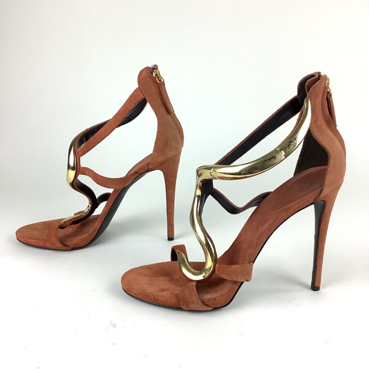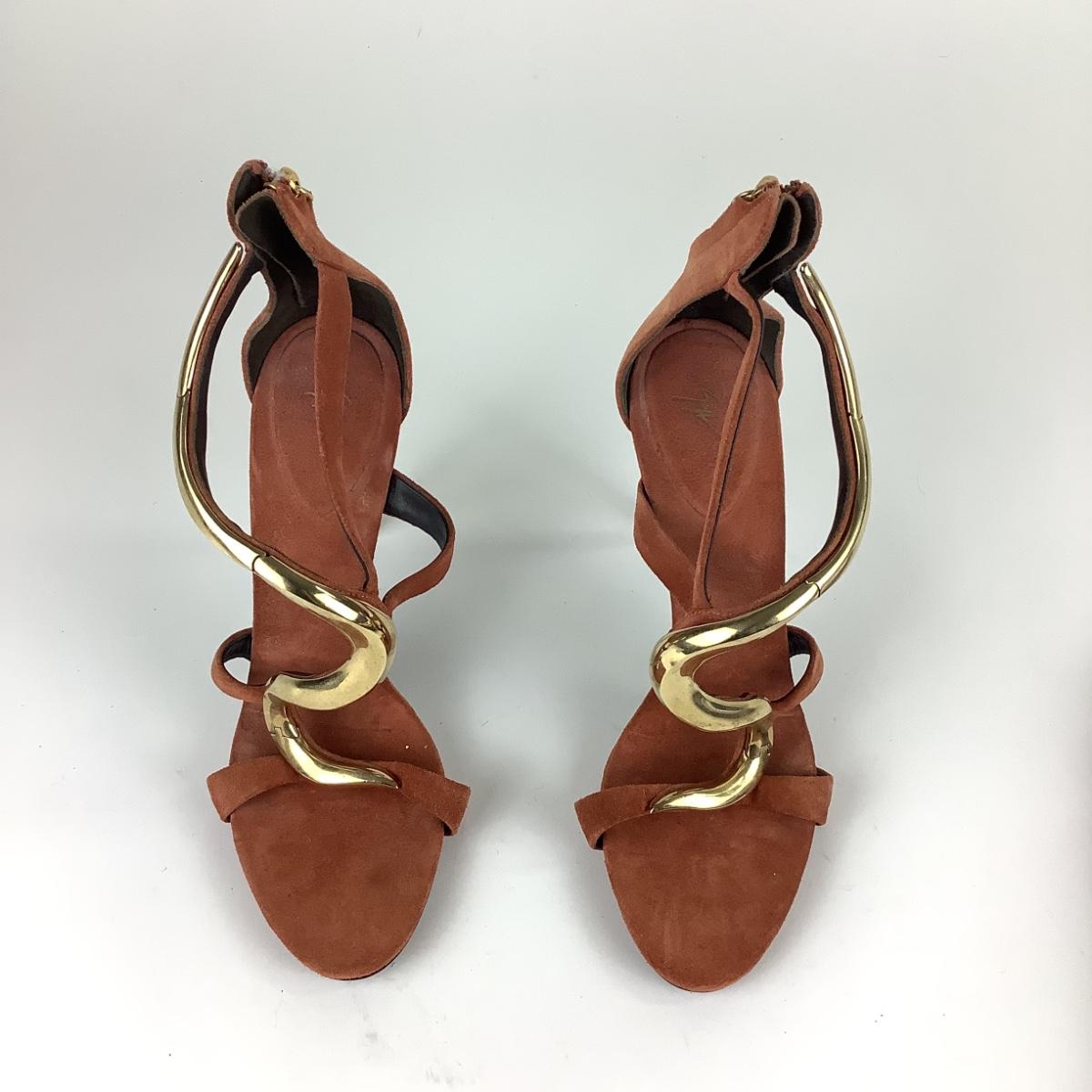 Like new Giuseppe Zanotti burnt orange/terracotta color suede alien ankle strap sandals, zipper fastening, goldtone metal hardware on vamp, made in Italy.