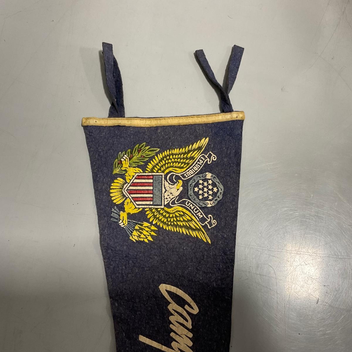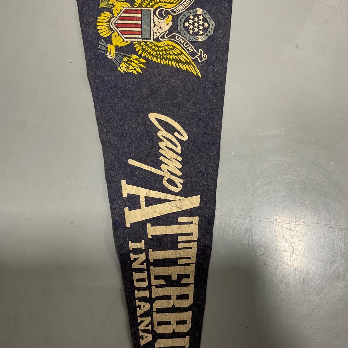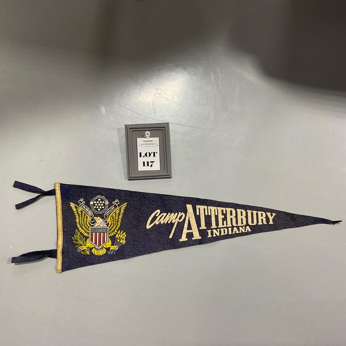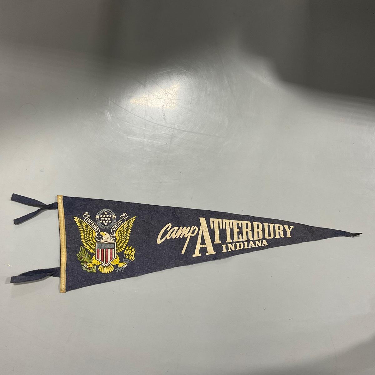 One military camp Atterbury Indiana pennant. 25 inches long. Please see photos for details and condition. ::: Shipping is available on this lot. If you require shipping you must let us know at the close of the auction. We will coordinate with you after the item has been won. Shipping fees will include insurance up to or exceeding the value of all items being mailed. If you have any questions regarding this lot please contact the auctioneer either via this website, by direct email or by phone. PICK UP TIMES and other important information can be found in the TERMS and DESCRIPTION of the auction. Please take a look for pertinent information. Thanks!
