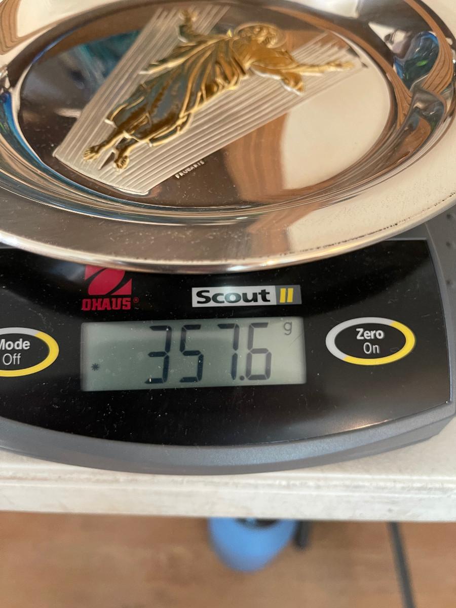 Beautiful condition, in original box, solid sterling silver (.925) weighs an impressive 357 grams.