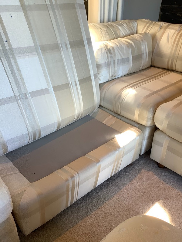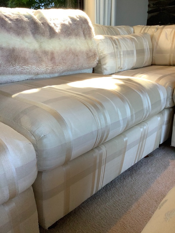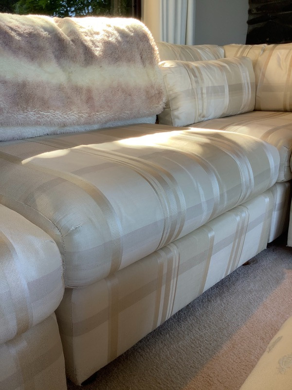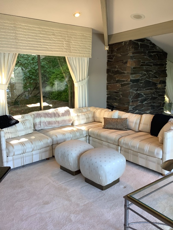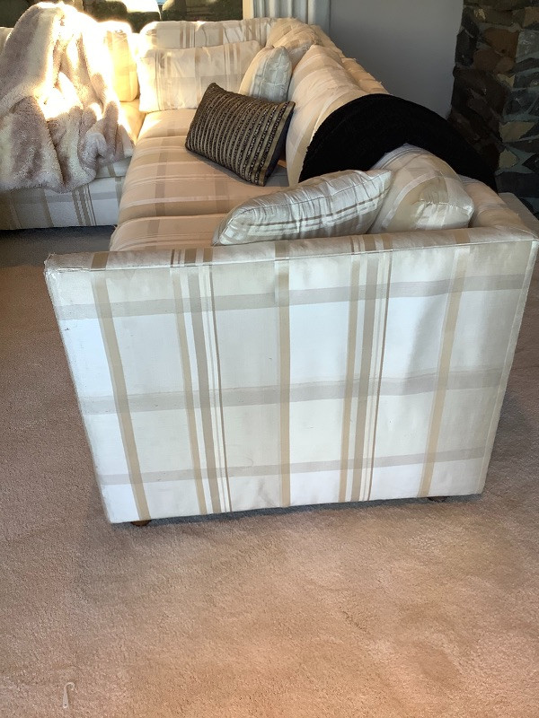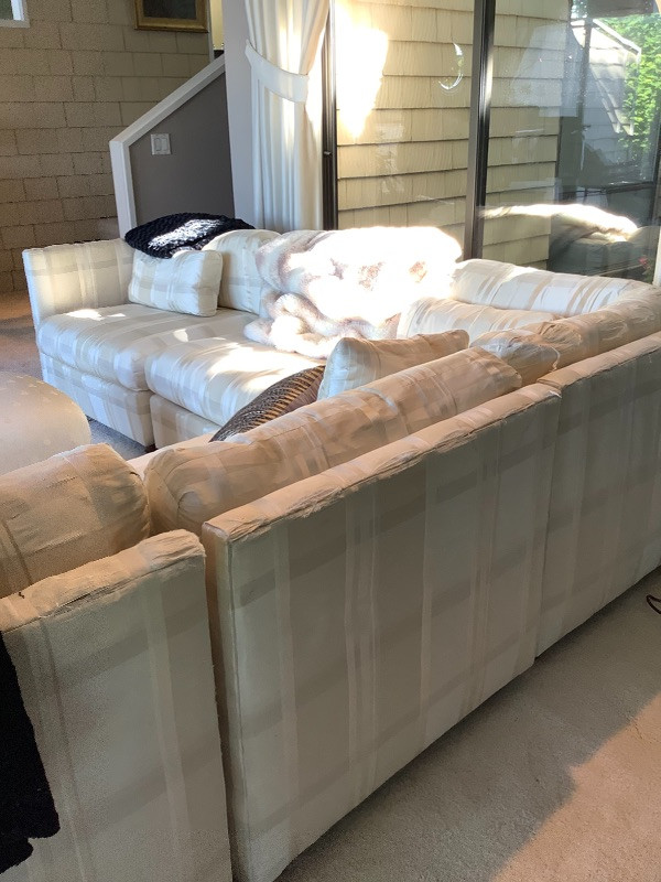 This Vintage Five Piece couch can be arranged in multiple configurations along with the Two Ottomans,.cushions are reversible. The upholstery is showing signs of wear but this sectional is still very nice and functional