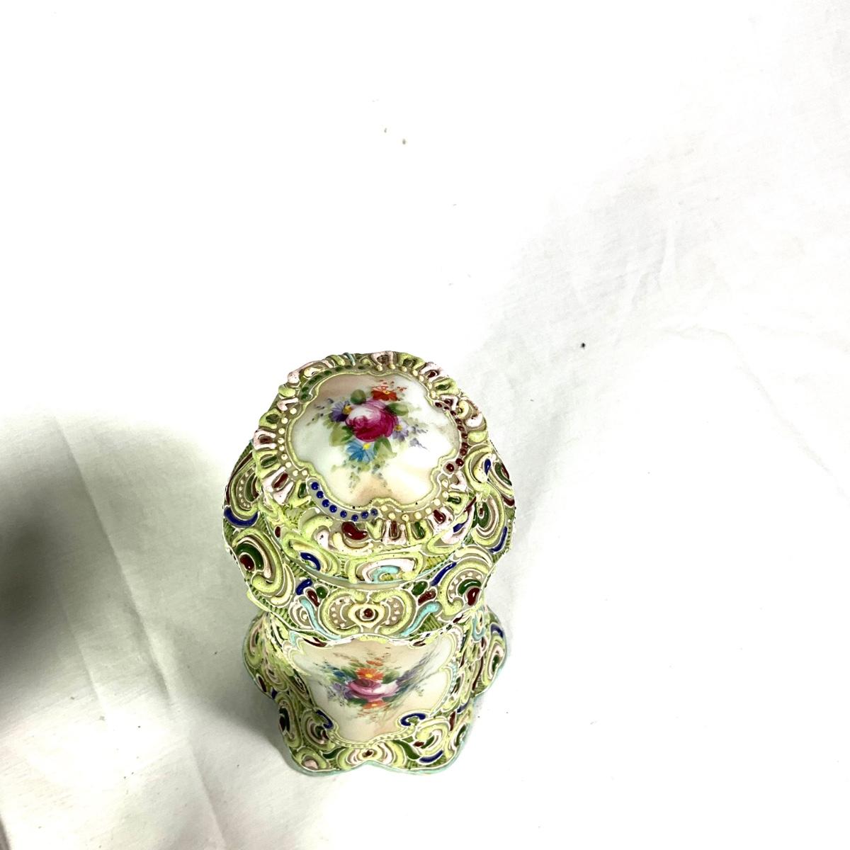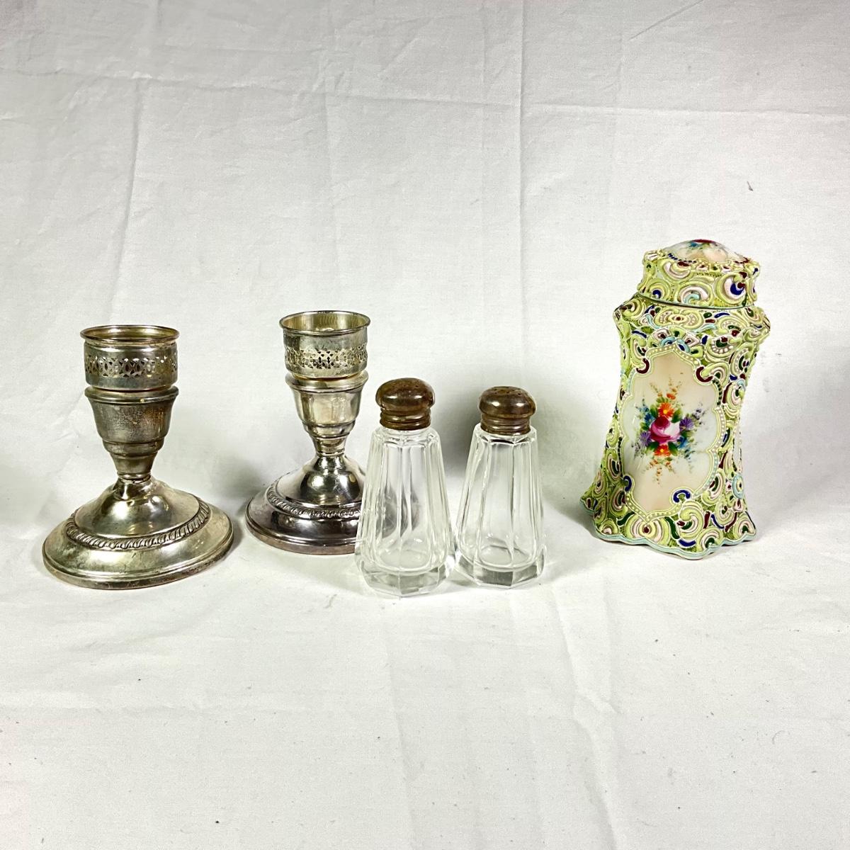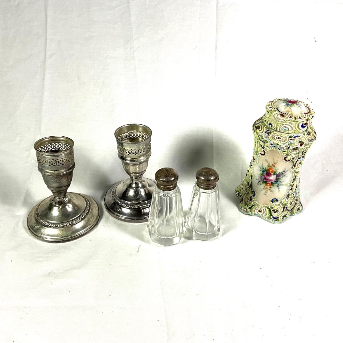 1172 Antique Moriage Tea Jar with Sterling Candlesticks and Shakers