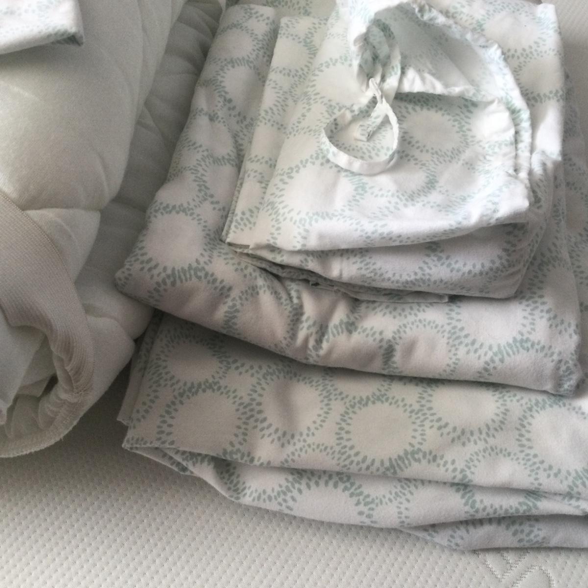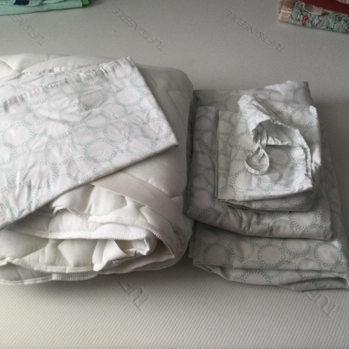 Sheet set with 3 pillowcases and like new mattress pad. Pale green and white design.