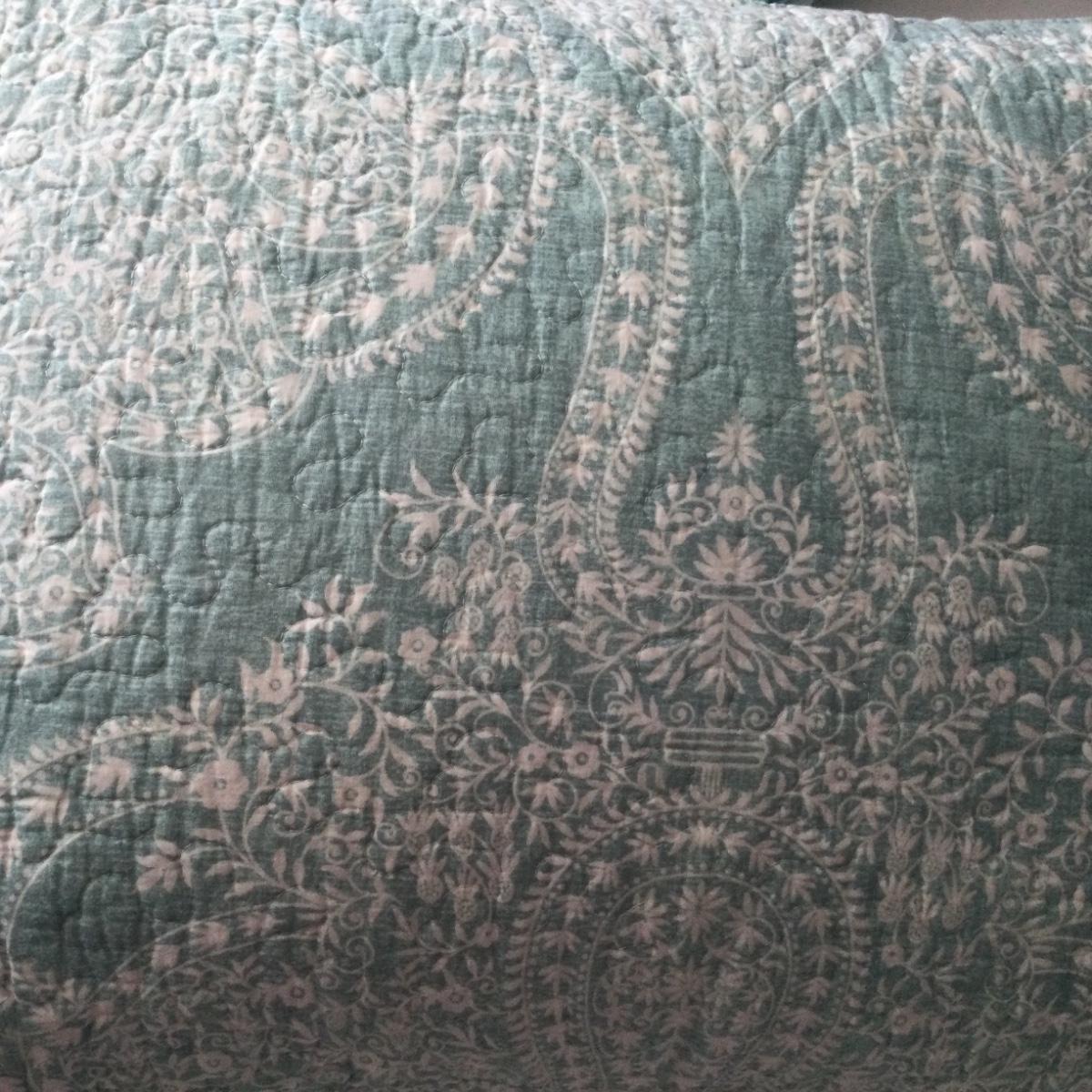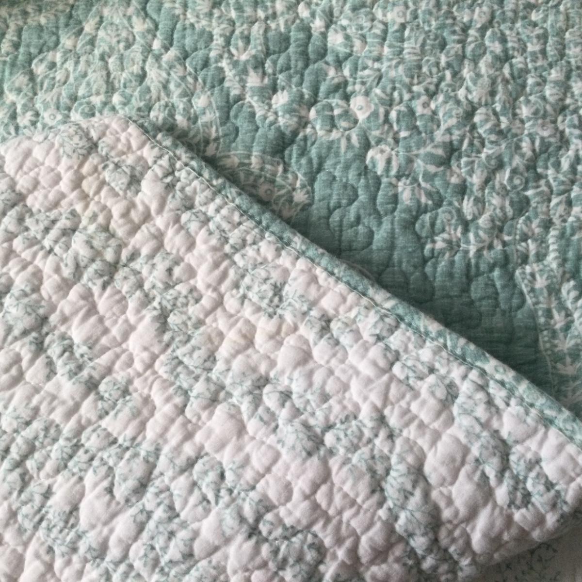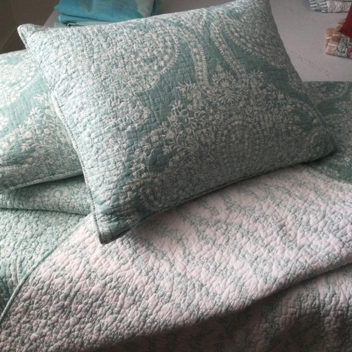 Bedspread is reversible, blue/green with white paisley design, there are 2 pillow shams with pillows.