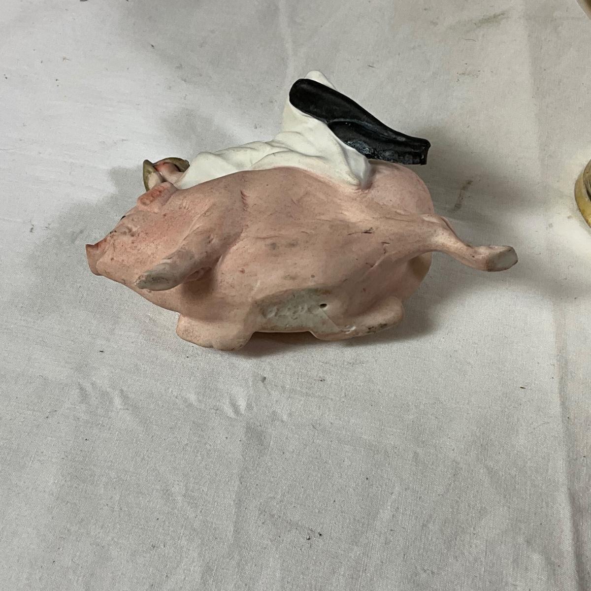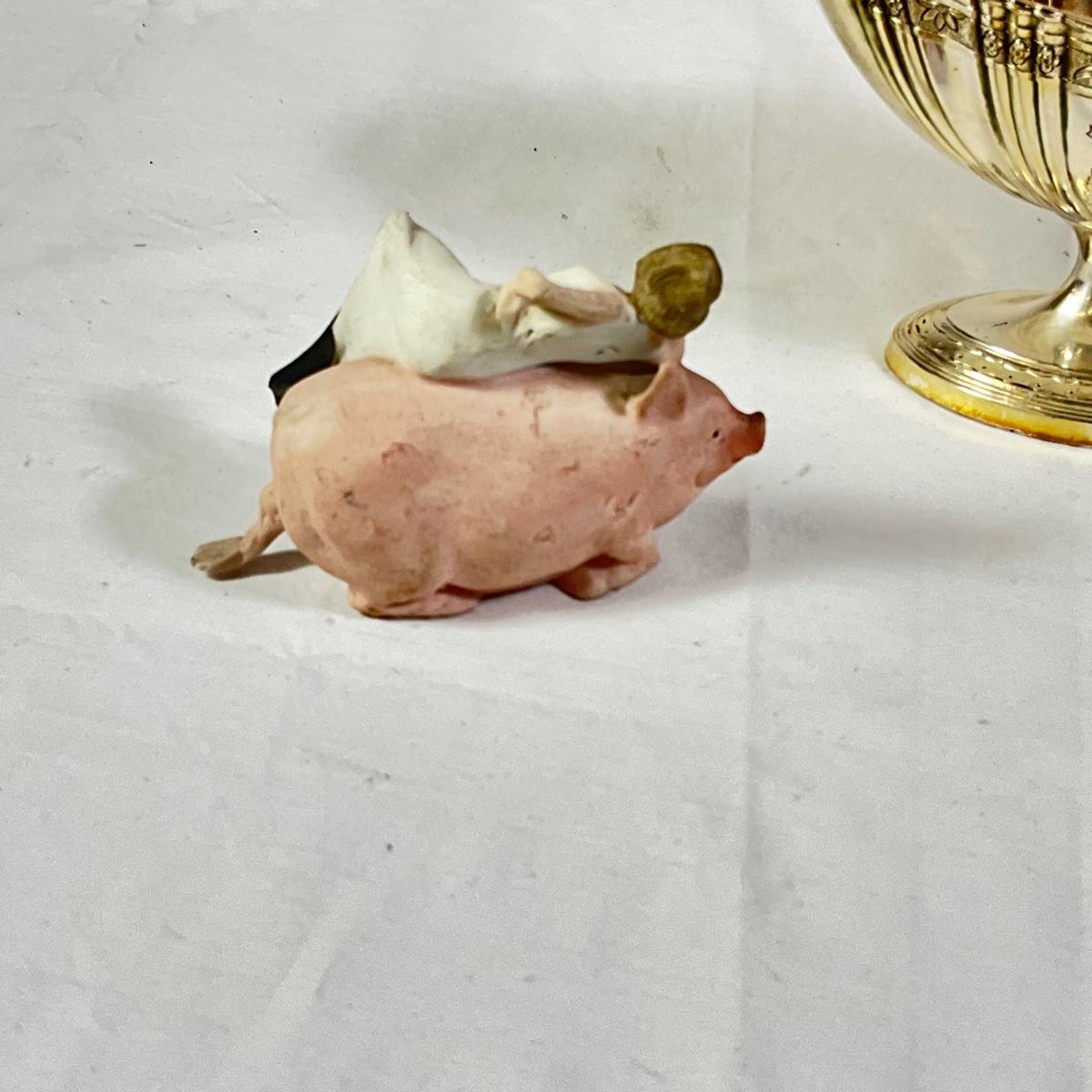 1176 Vintage Silverplate Basket with Porcelain Woman on Pig Figurine