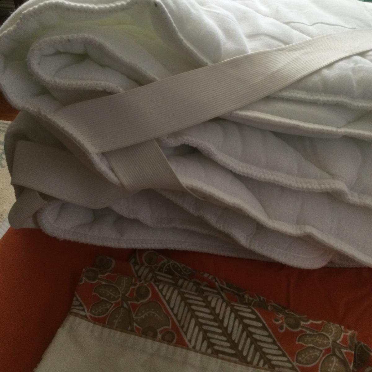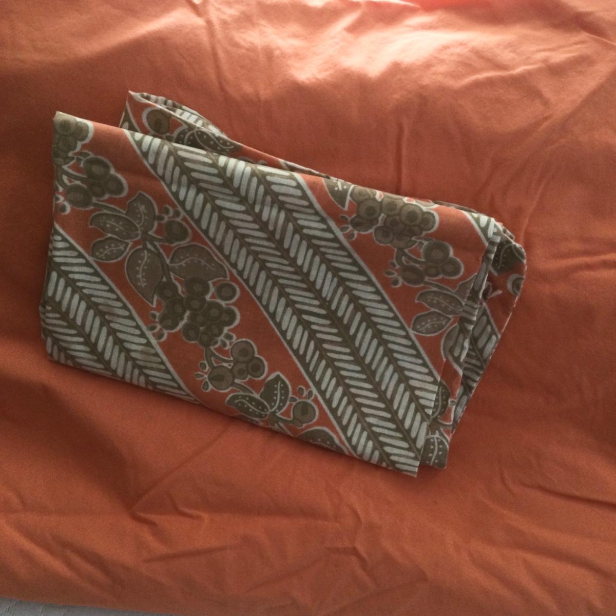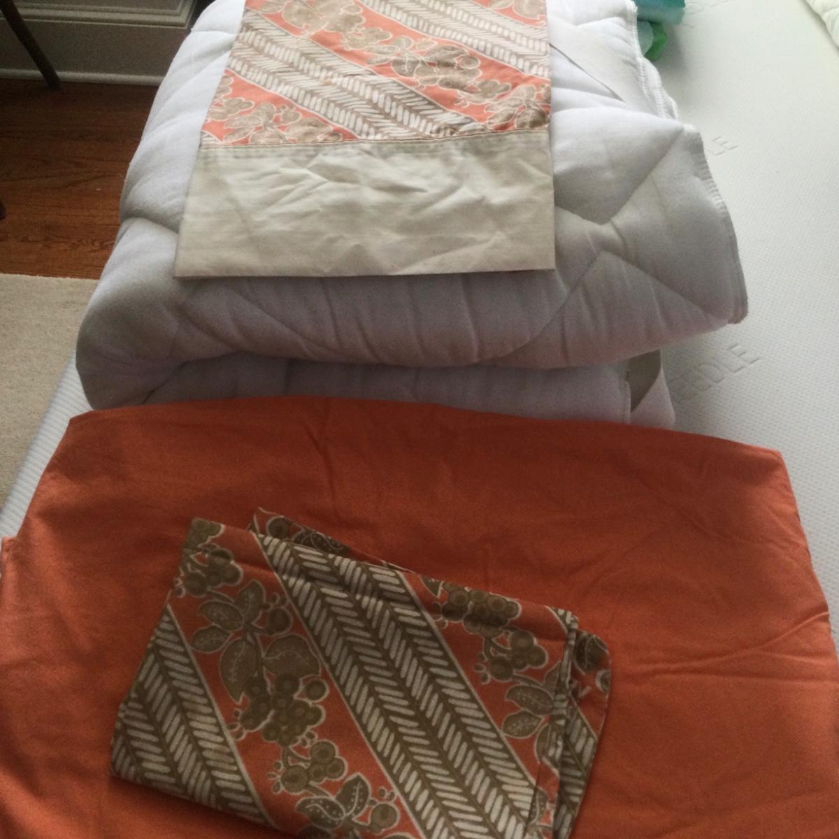 Orange Duvet Cover is twin size from The Company Store, 2 vintage pillowcases (one is damaged) and like new mattress pad.