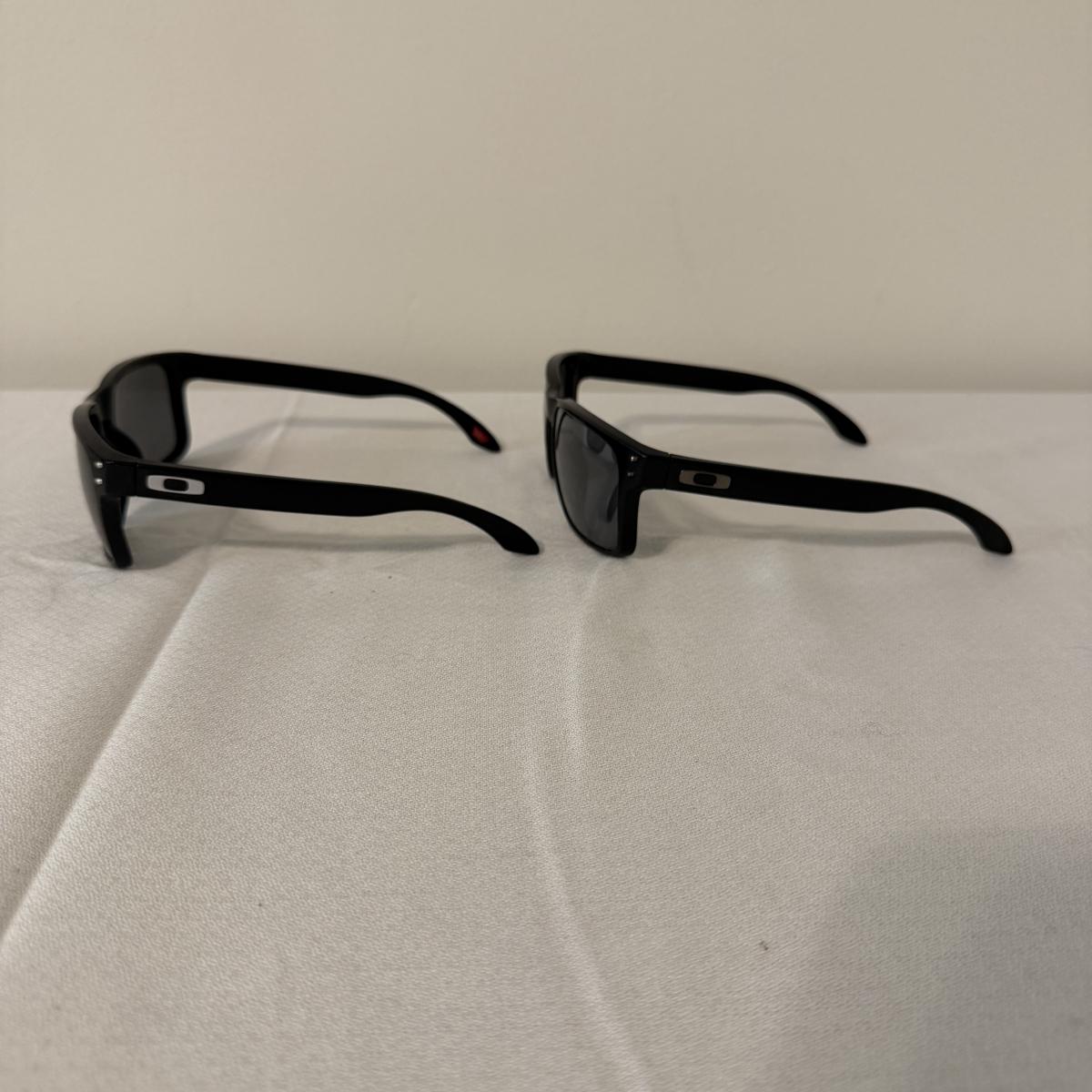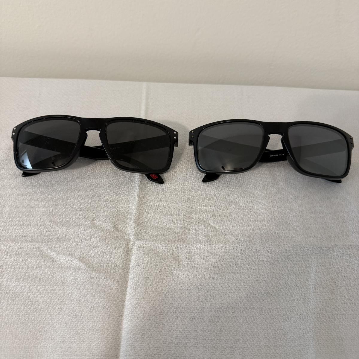 Lot includes two pair of Oakley Holbrook and two pair of Ray Ban sunglasses. Sunglasses have scratches on lenses, but they don’t show well in pictures.