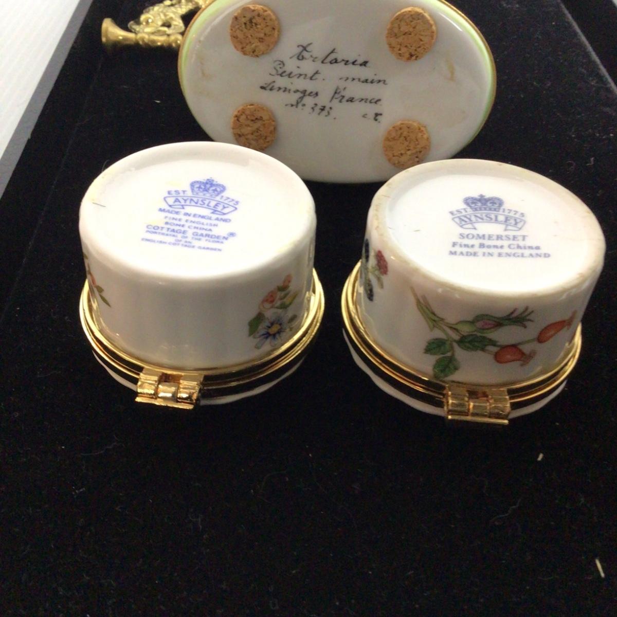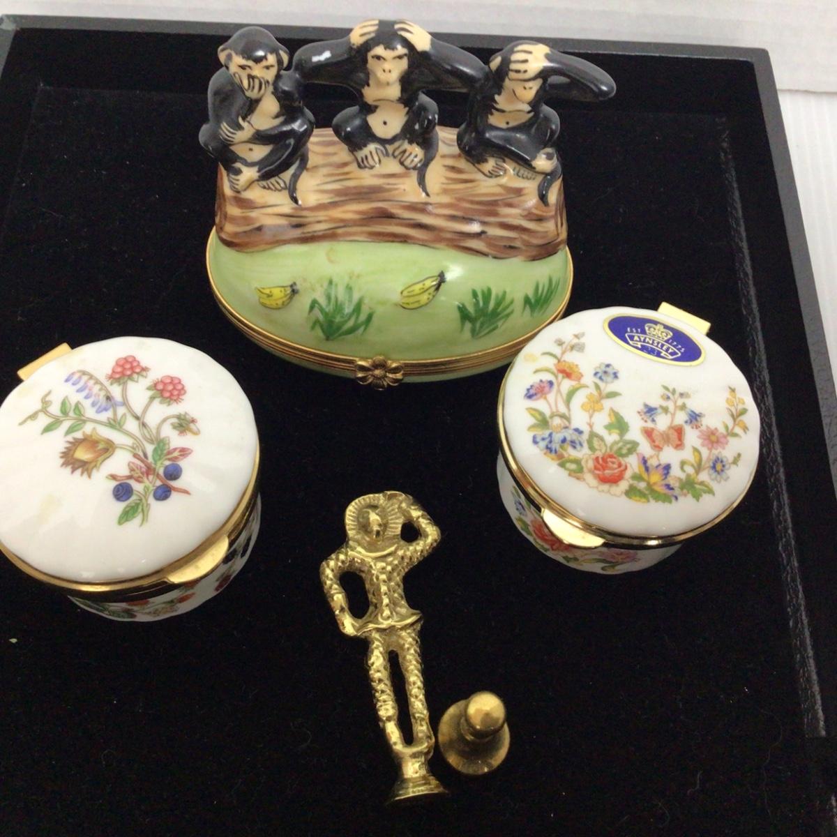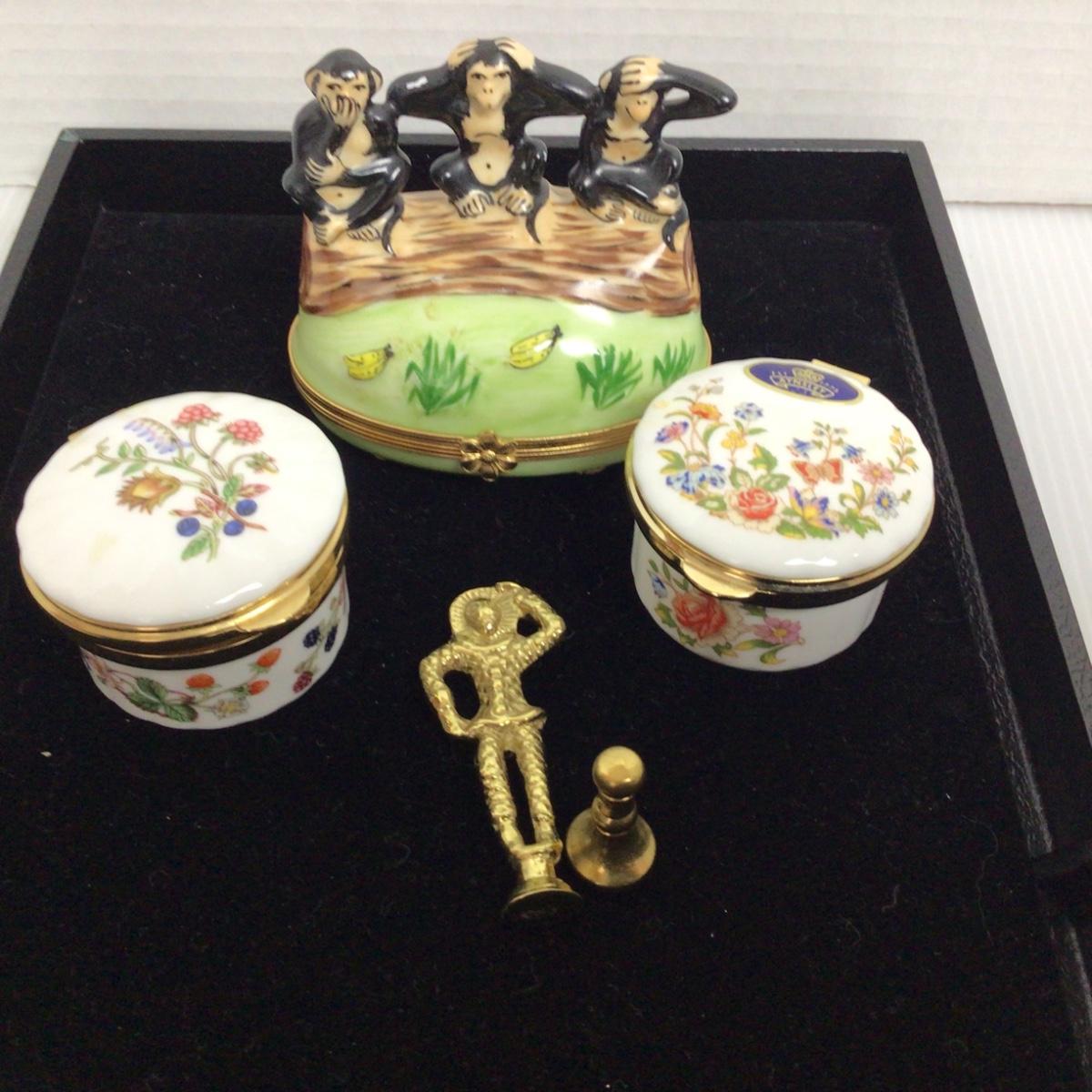 Limoge Three Wise Money trinket box that is handpainted, 2 Aynsley floral trinket boxes.