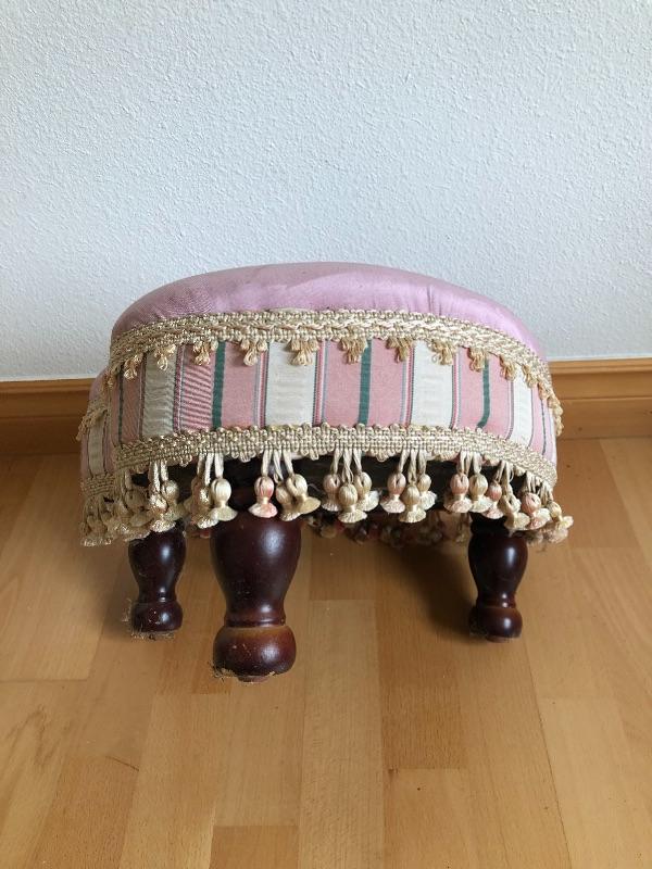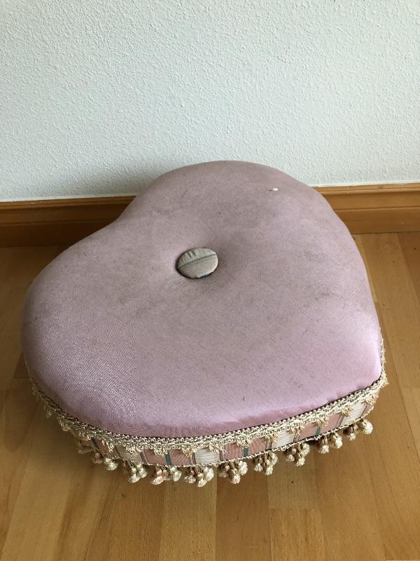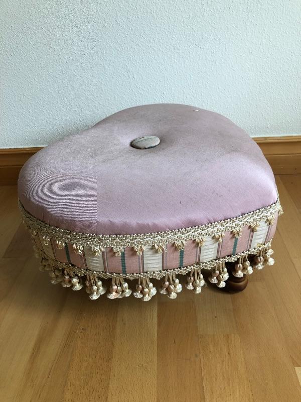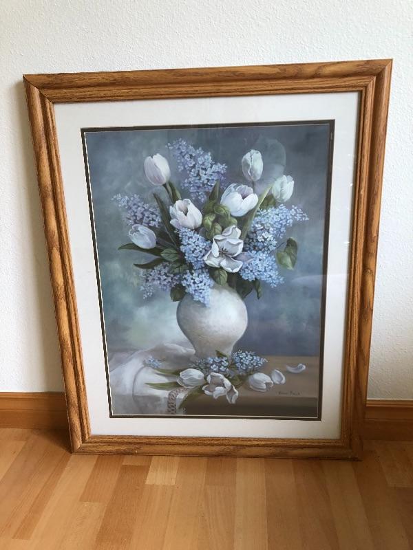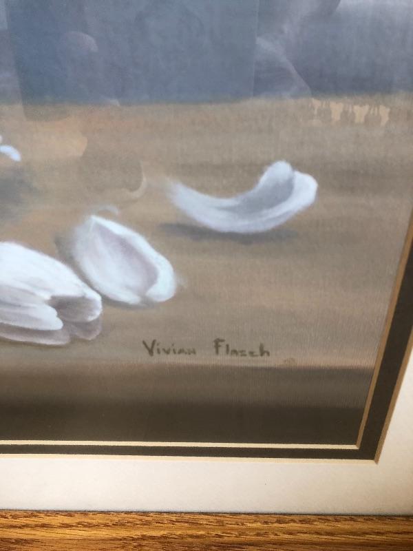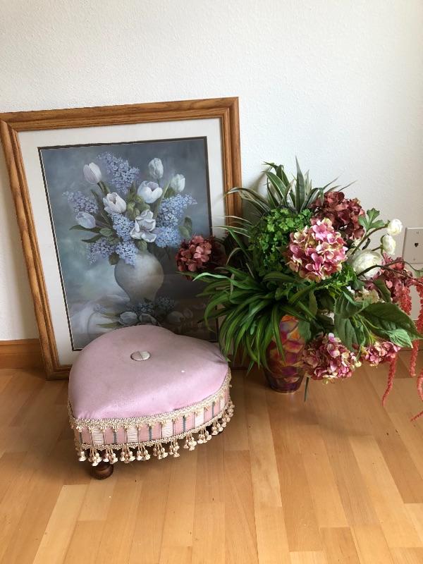 Vivian Flasch Signed print 32 inches tall x 25.5 W, heart shaped fringed pink footstool (needs cleaning) and beautiful silk flower in a beautiful pink iridescent vase.