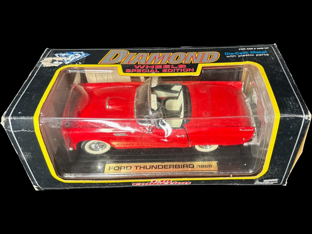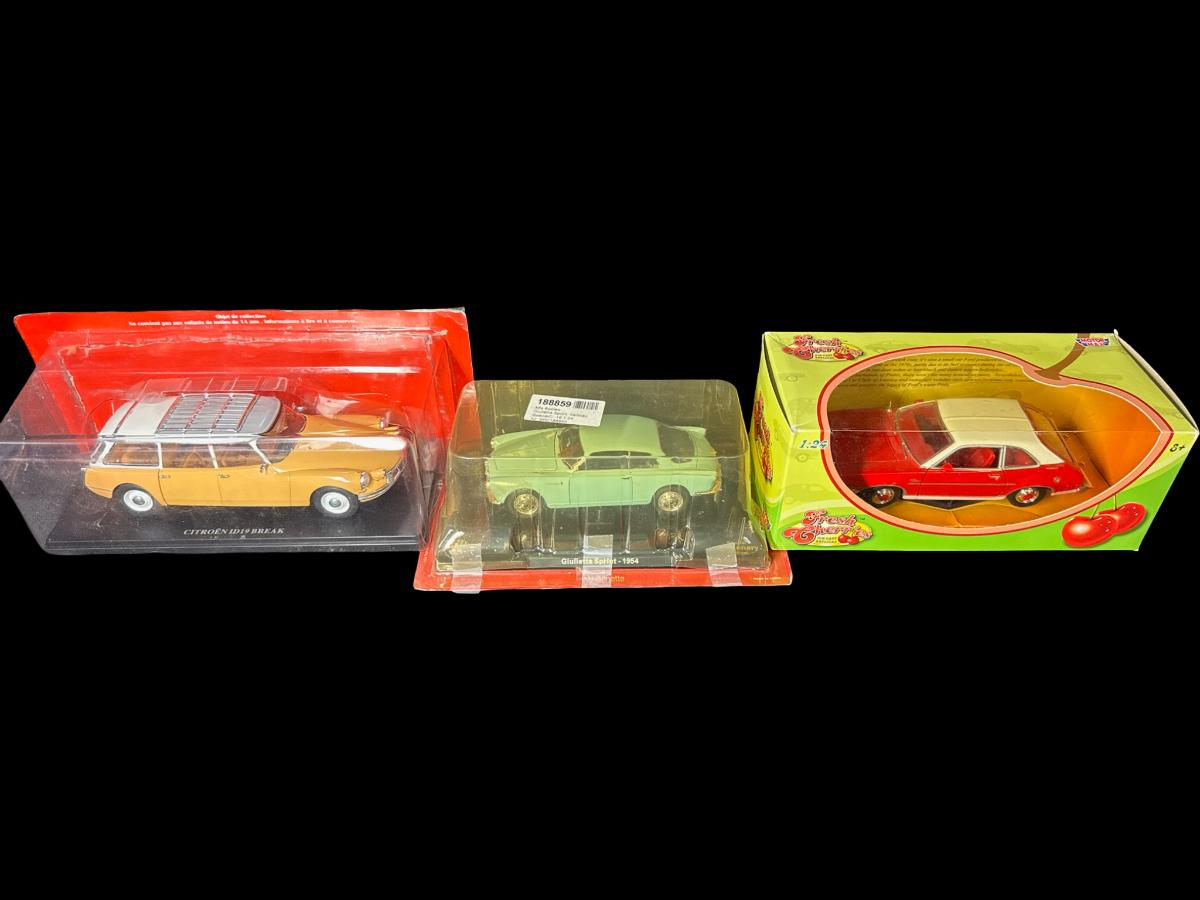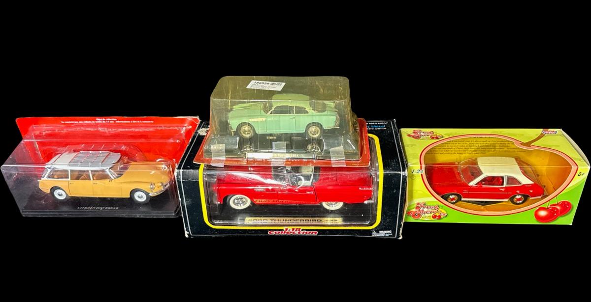 Includes a Diamond Wheels Special Edition 1955 Ford Thunderbird, a Fresh Cherries 1974 Ford Pinto, a Citroen ID 19 Break, and a 1954 Alfa Romeo Guilietta Sprint. Total of four pieces. In the original packages. Some packages may not be complete.