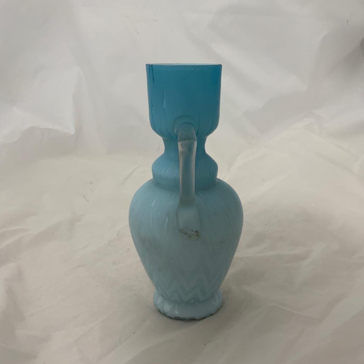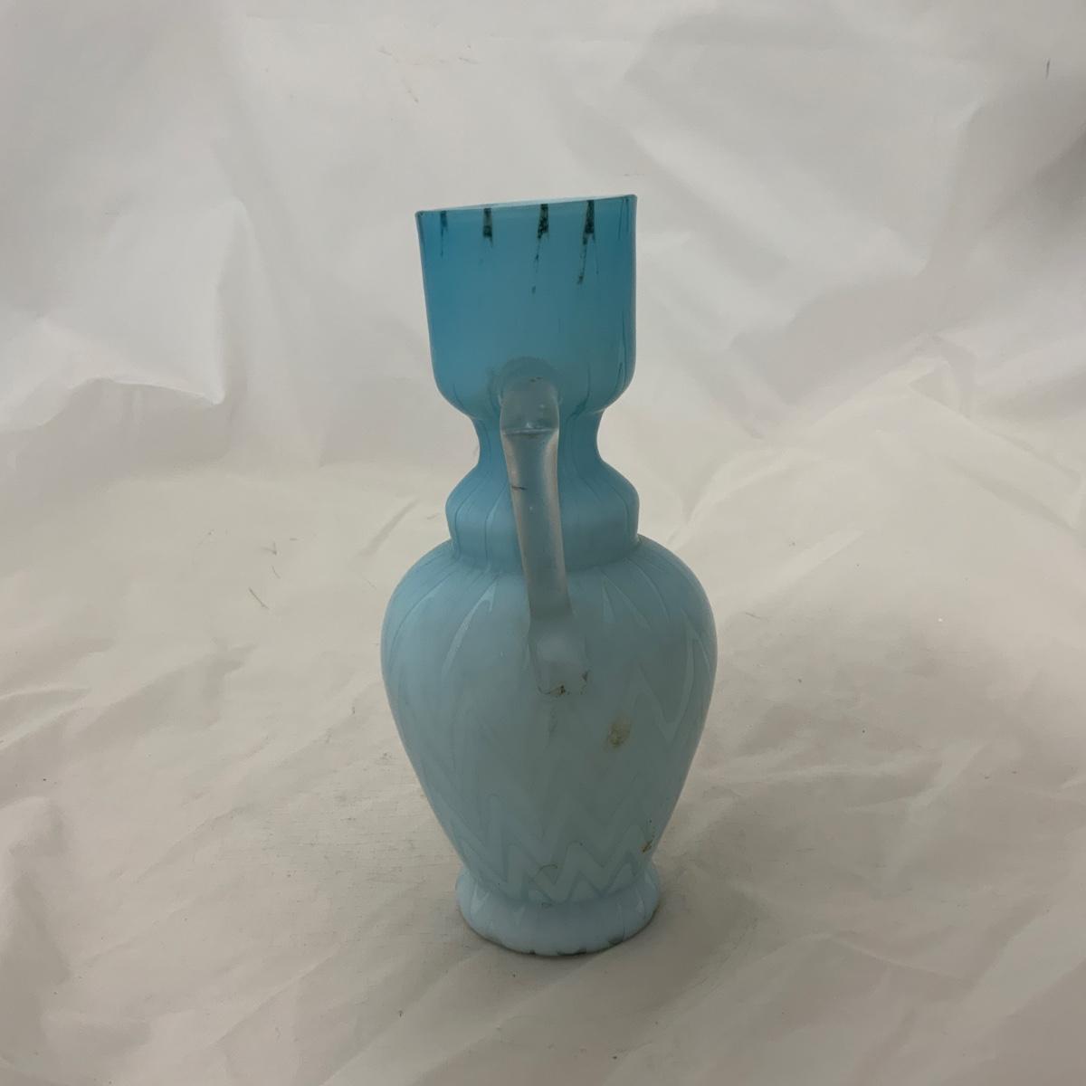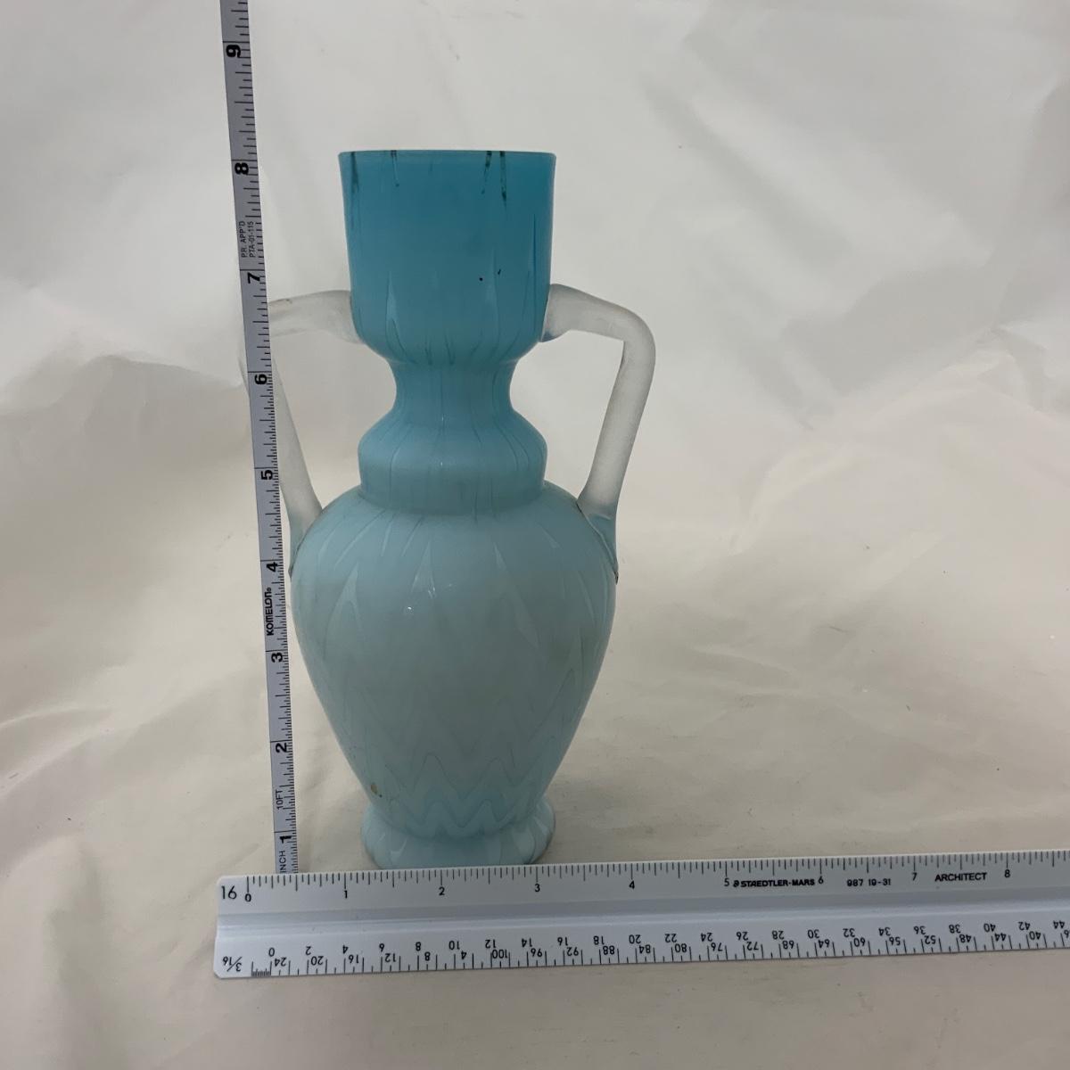 Beautiful Blue Herringbone Double Handled Satin Vase, circa 1900. This vase needs a little cleaning to bring it back to it’s original glory. Overall incredible condition given it’s age. Being that it’s cased glass it gives an incredible glow, but can also look a little uneven on the top. Please see photos for details and condition. ::: Shipping is available on this lot. If you require shipping you must let us know at the close of the auction. We will coordinate with you after the item has been won. Shipping fees will include insurance up to or exceeding the value of all items being mailed. If you have any questions regarding this lot please contact the auctioneer either via this website, by direct email or by phone. PICK UP TIMES and other important information can be found in the TERMS and DESCRIPTION of the auction. Please take a look for pertinent information. Thanks!