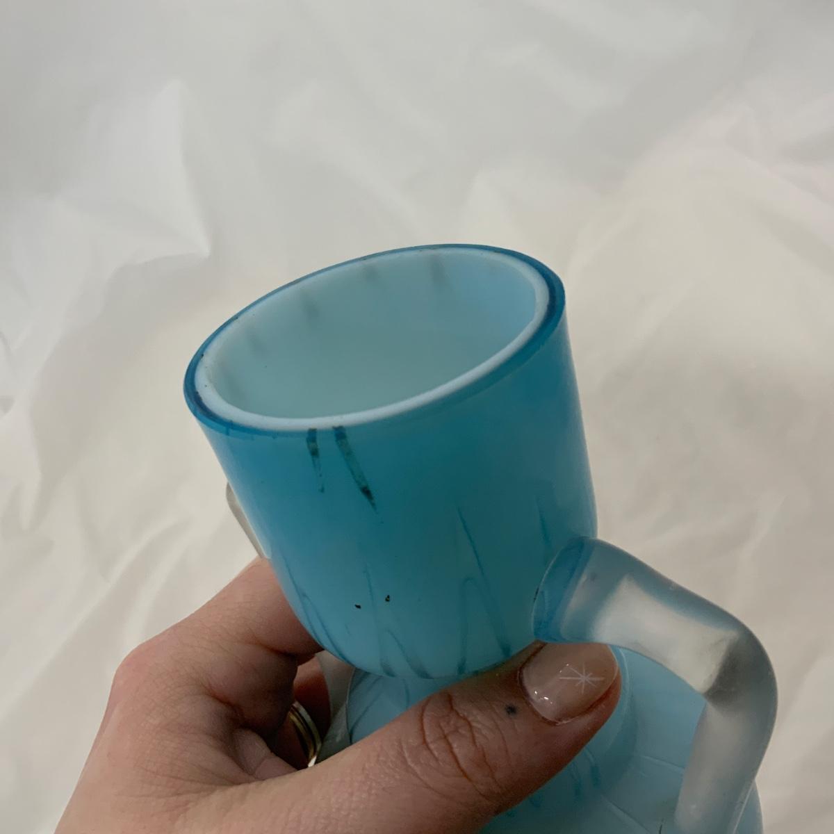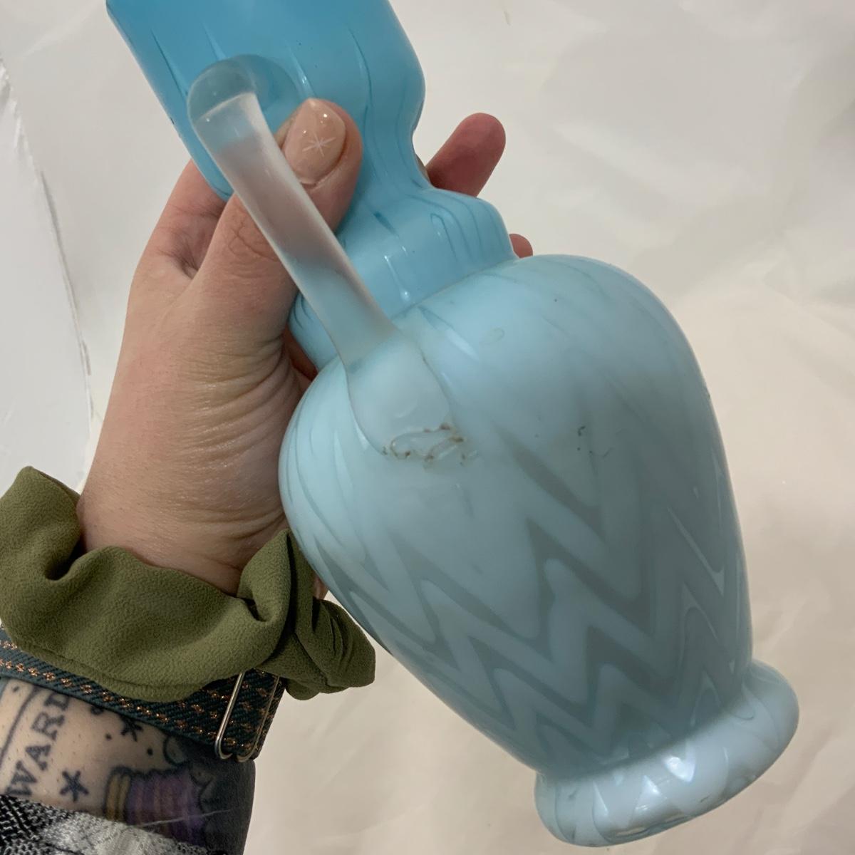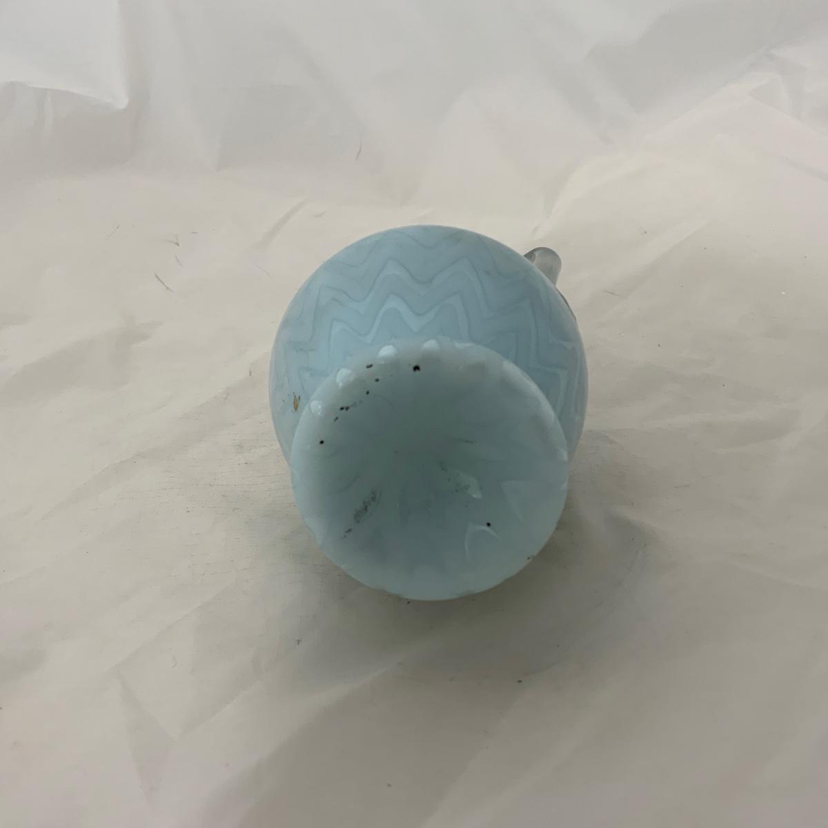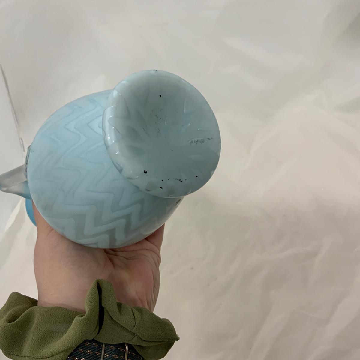 Beautiful Blue Herringbone Double Handled Satin Vase, circa 1900. This vase needs a little cleaning to bring it back to it’s original glory. Overall incredible condition given it’s age. Being that it’s cased glass it gives an incredible glow, but can also look a little uneven on the top. Please see photos for details and condition. ::: Shipping is available on this lot. If you require shipping you must let us know at the close of the auction. We will coordinate with you after the item has been won. Shipping fees will include insurance up to or exceeding the value of all items being mailed. If you have any questions regarding this lot please contact the auctioneer either via this website, by direct email or by phone. PICK UP TIMES and other important information can be found in the TERMS and DESCRIPTION of the auction. Please take a look for pertinent information. Thanks!
