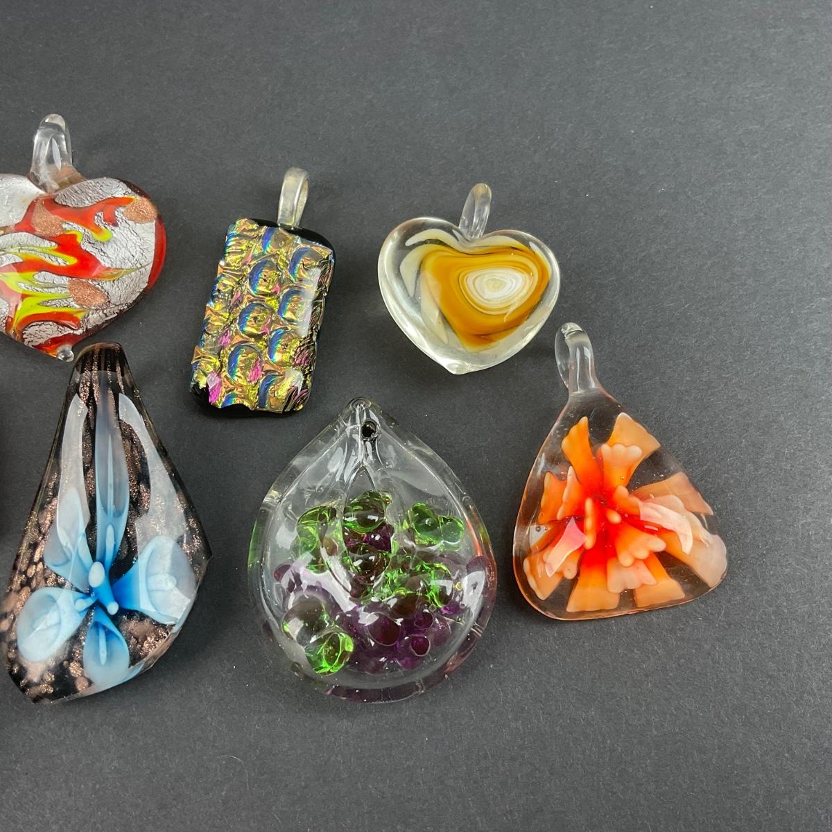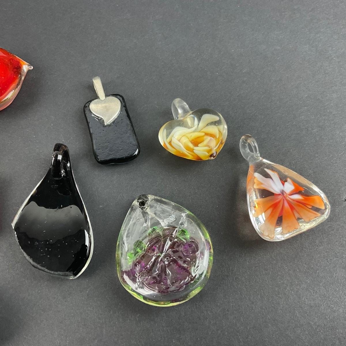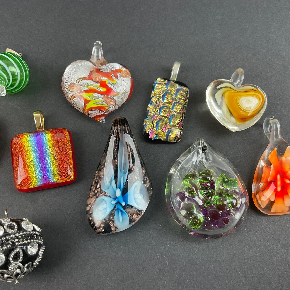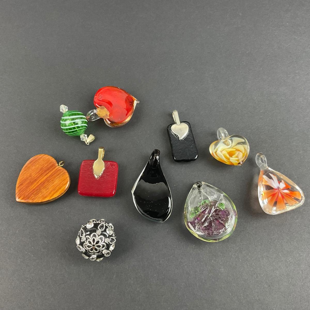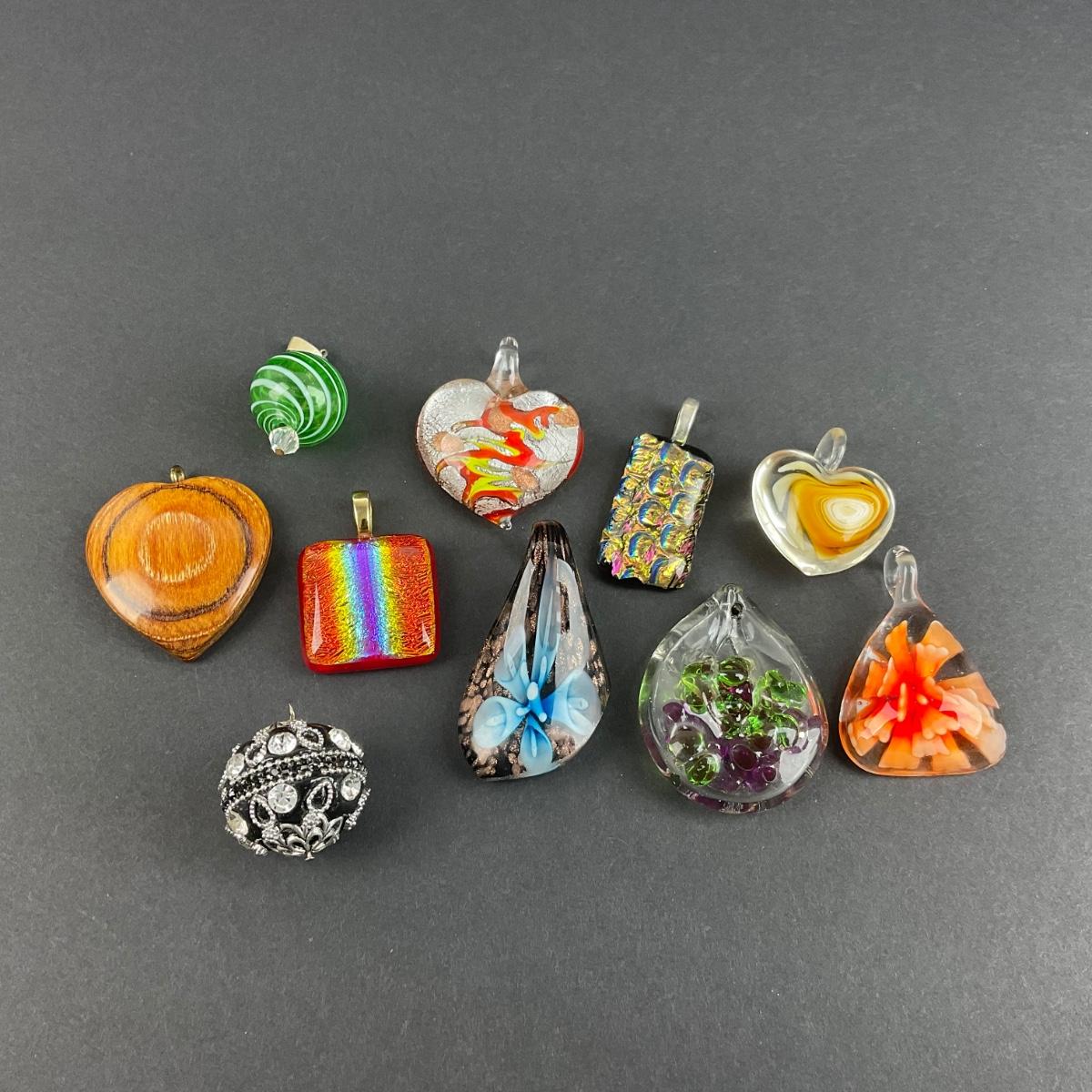 Ten miscellaneous assorted pendants mostly glass but not all of them. Please see photos for details and condition. Any condition statement is given as a courtesy to a client, is an opinion, and should not be treated as a statement of fact. Reference to condition written, oral or within a condition report shall not be regarded as a full account of condition and may not include all defects, alterations, or restorations. Absence of a condition report does not imply a lot is flawless or lacking imperfections or damage. Katherine’s Auction & Appraisal Service shall have no responsibility for any error or omission. Returns shall not be accepted on the basis of condition. ::: Shipping is available on this lot. If you require shipping you must let us know at the close of the auction. We will coordinate with you after the item has been won. Shipping fees will include insurance up to or exceeding the value of all items being mailed. If you have any questions regarding this lot please contact the auctioneer either via this website, by direct email or by phone. PICK UP TIMES and other important information can be found in the TERMS and DESCRIPTION of the auction. Please take a look for pertinent information. Thanks!