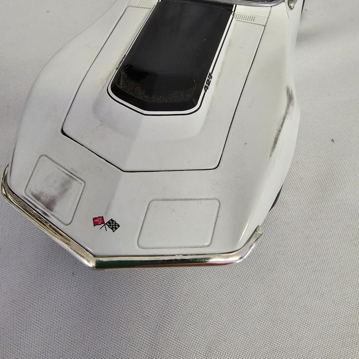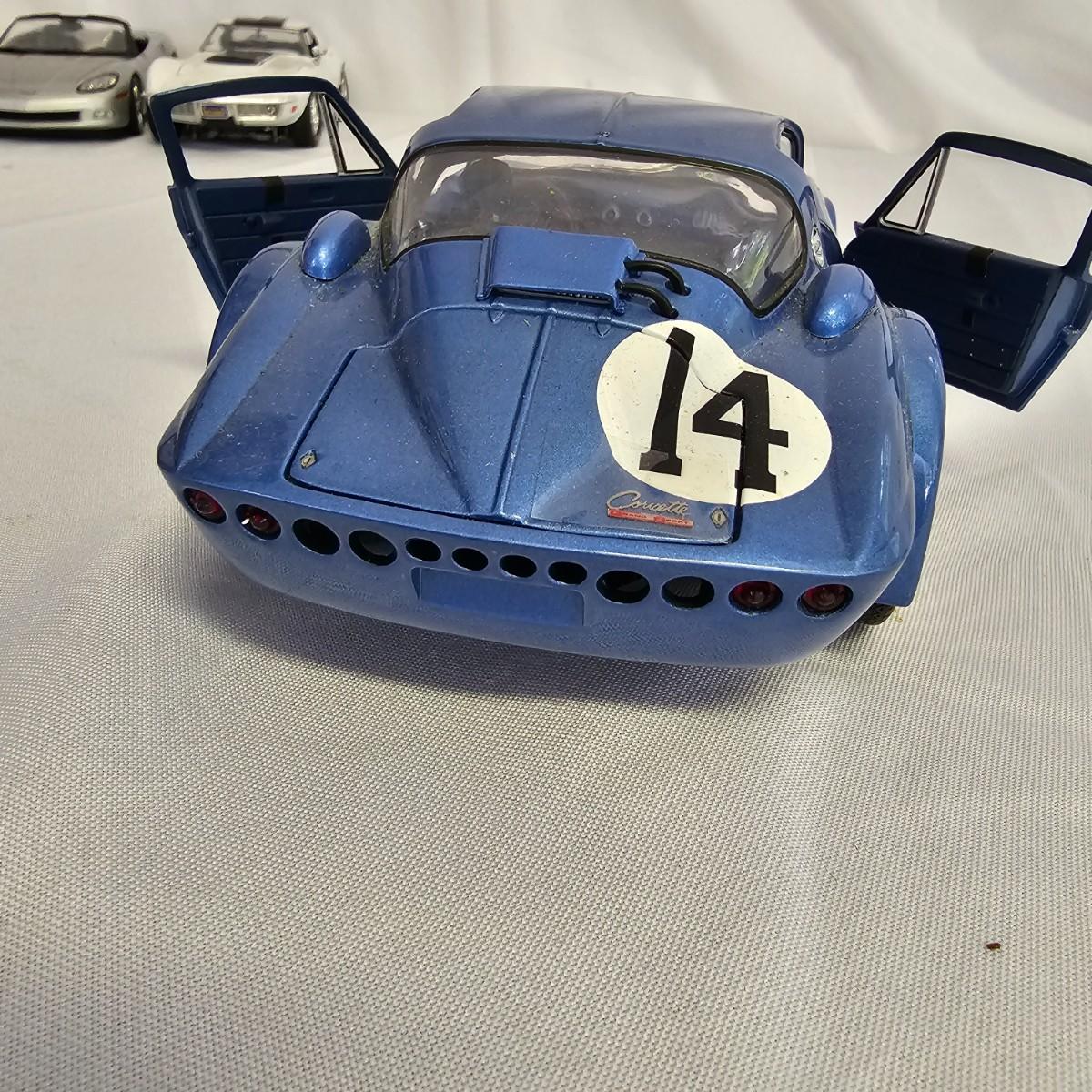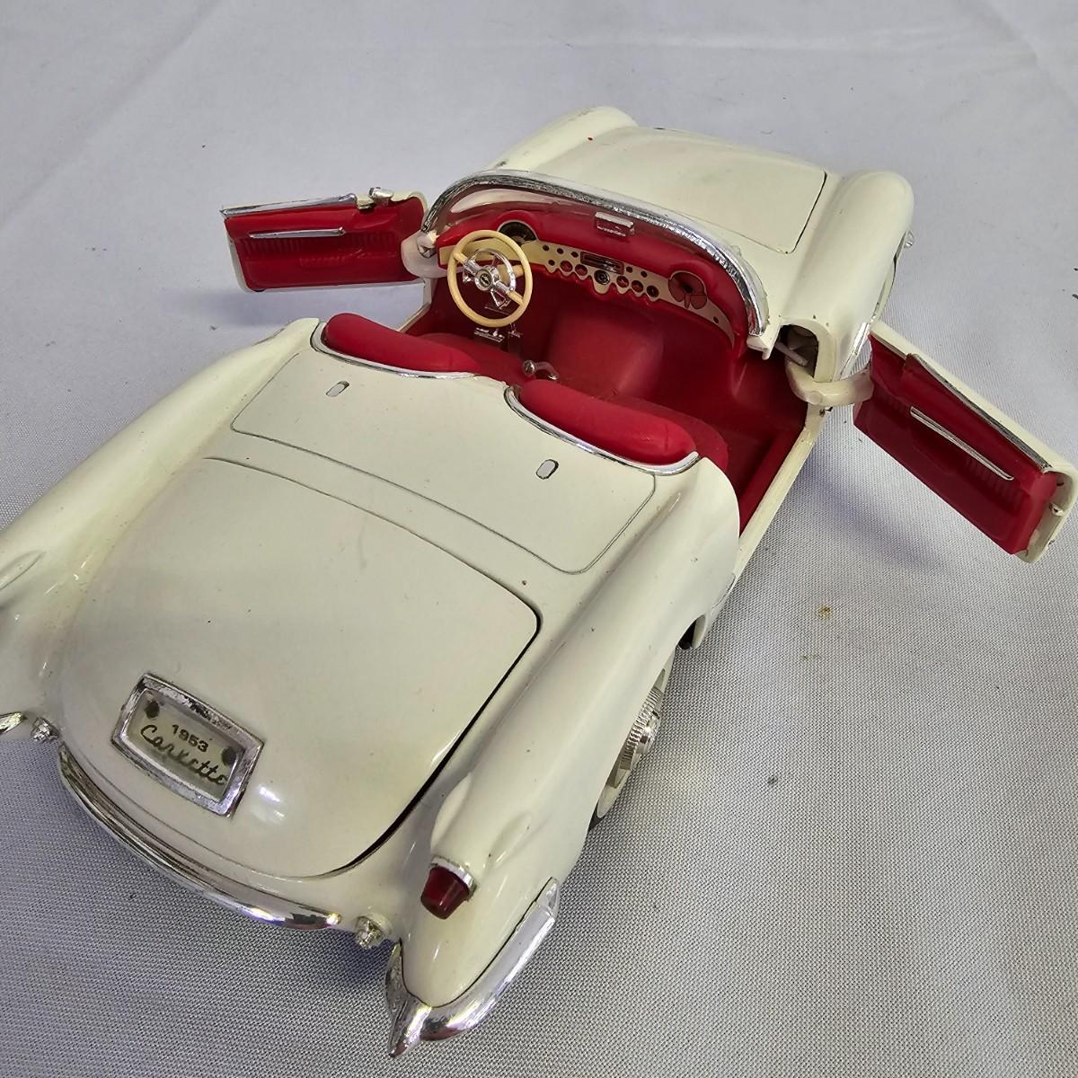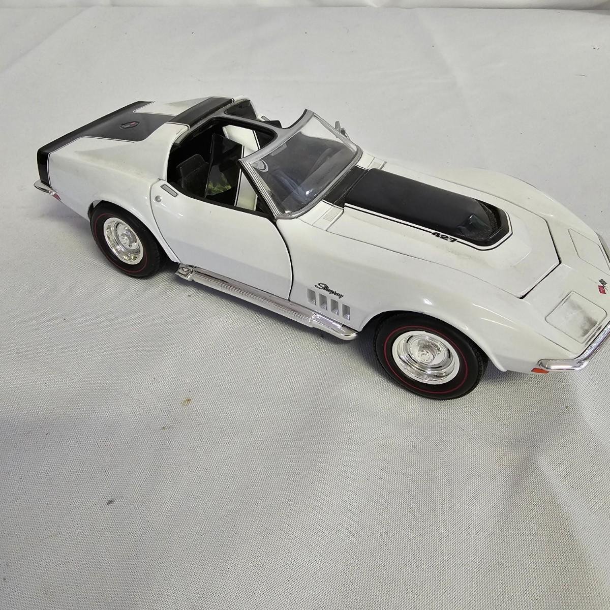A range of seven metal Corvettes in 1:18 scale. Years include 1953, 1963, 1969, 1984, 1997, 1998, 2003. Cars from Mattel, Exoto, BBurago, others. Opening doors and hoods on all models, some with removable tops as well. One model includes tool stack with simulated tools inside. A replica of the original 1953 model as well as a 1963 Grand Sport. Average size is 5" x 10". Smallest pewter car is 4.5" long. Some wear and tear on finishes, and a couple missing mirrors. See photos for details. Shipping available.