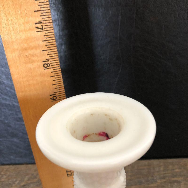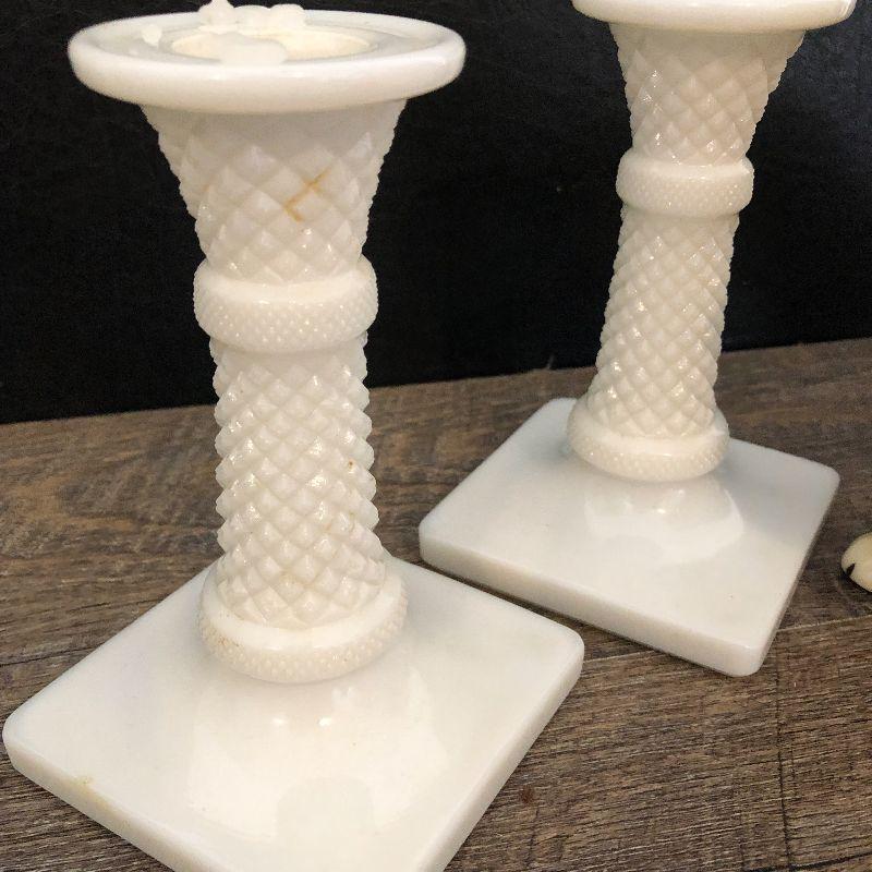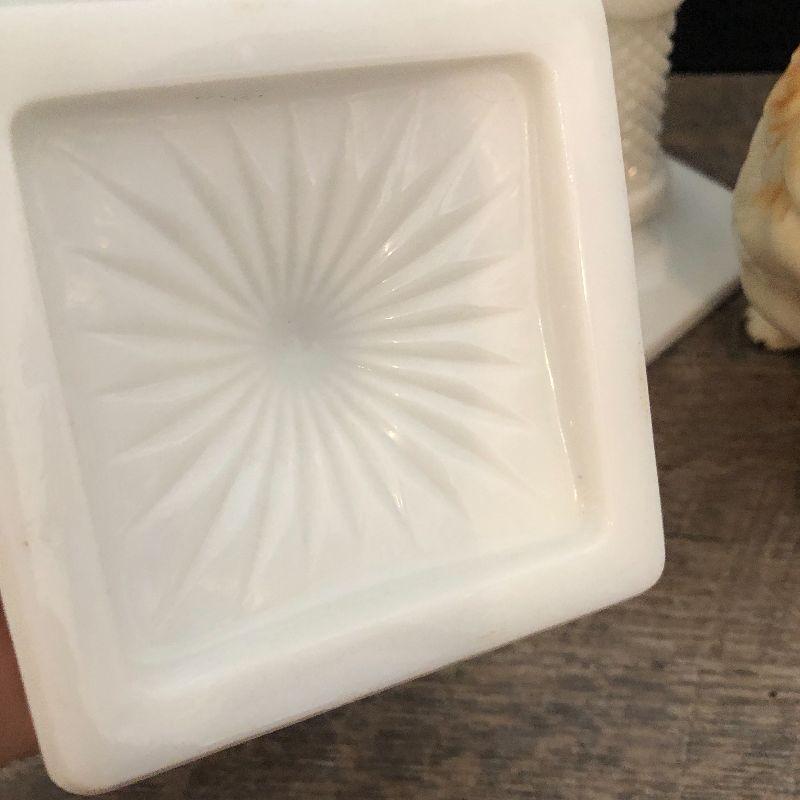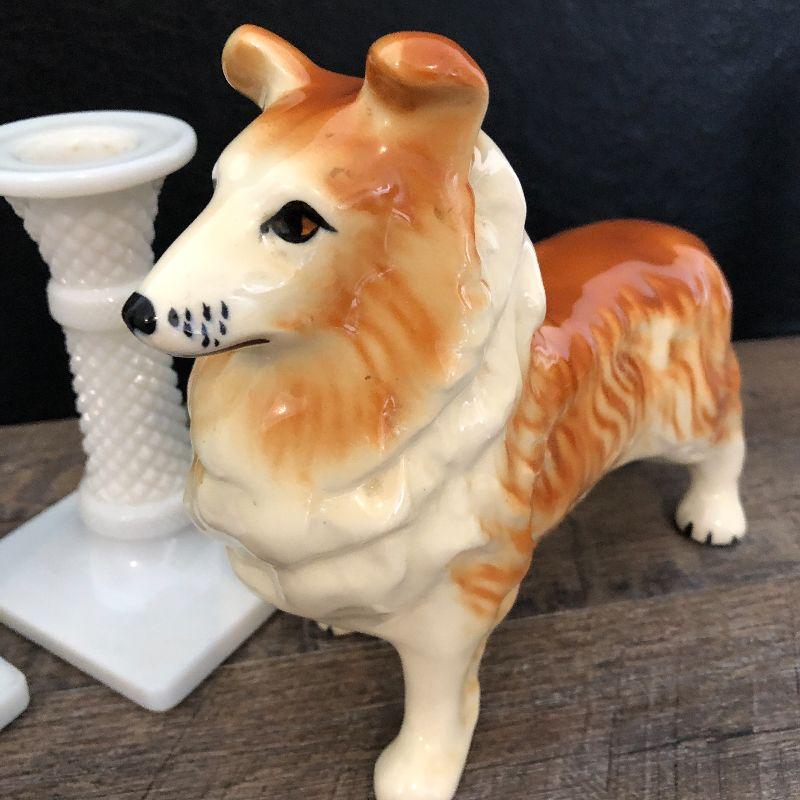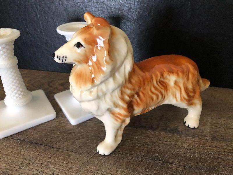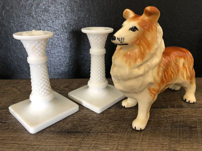 Milkglass candlesticks and dog decor