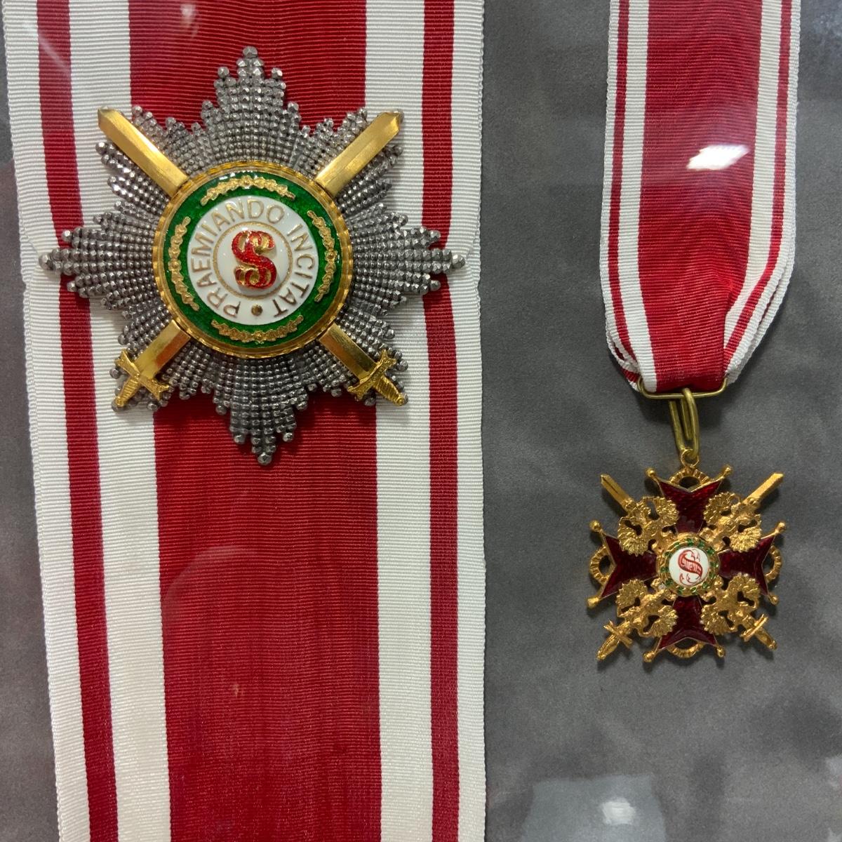 From the Estate of Peter and Alice Radovanovich: Elegantly framed Medals from the Russian Empire. On the Left are medals from the Order of Saint Anna, On the Right are medals from the Order of St. Stanislaus (awarded by the imperial government to those Poles who co-operated with Russia rule making the order a symbol of subservience to an occupying power). Medals are excellent reproductions. They are framed behind conservation glass by a reputable local frame shop. Frame measures 27” x 20.5”. Please see photos for details and condition. ::: Shipping is available on this lot. If you require shipping you must let us know at the close of the auction. We will coordinate with you after the item has been won. Shipping fees will include insurance up to or exceeding the value of all items being mailed. If you have any questions regarding this lot please contact the auctioneer either via this website, by direct email or by phone. PICK UP TIMES and other important information can be found in the TERMS and DESCRIPTION of the auction. Please take a look for pertinent information. Thanks!