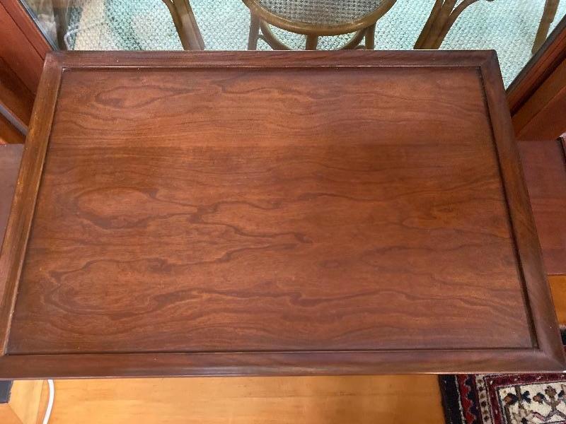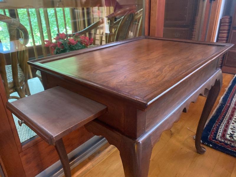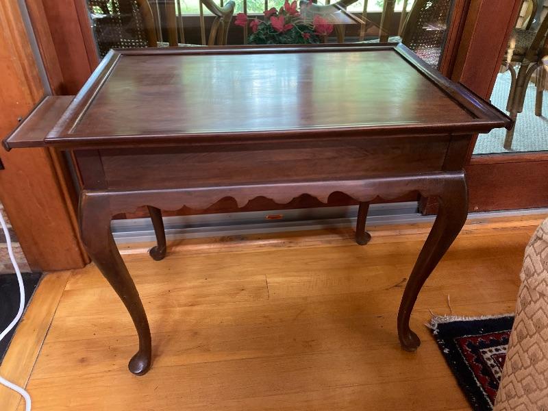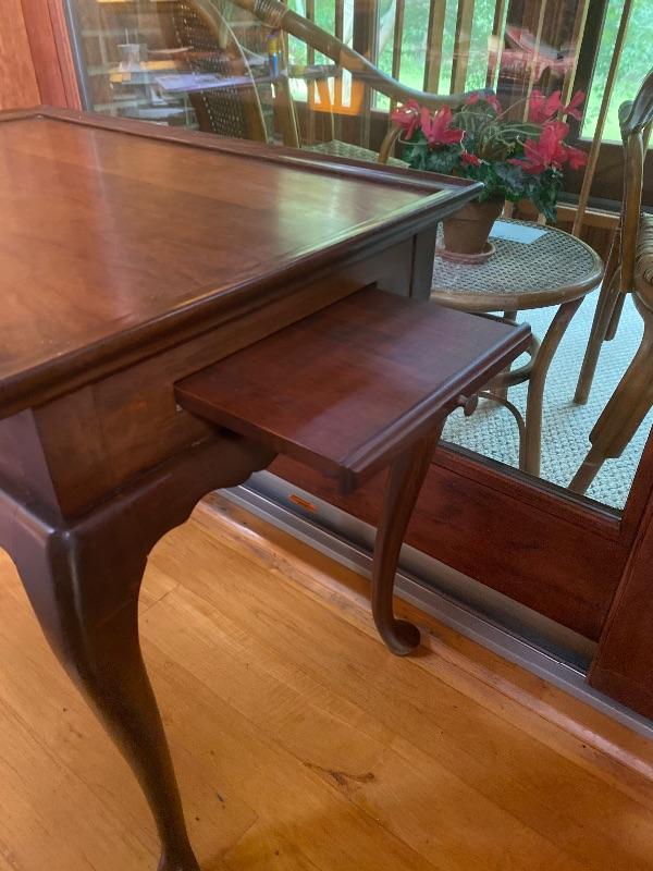 Henredon Scalloped Mahogany Tea Table with 2 candle shelves measuring 29.5” wide x 20” deep x 26” tall