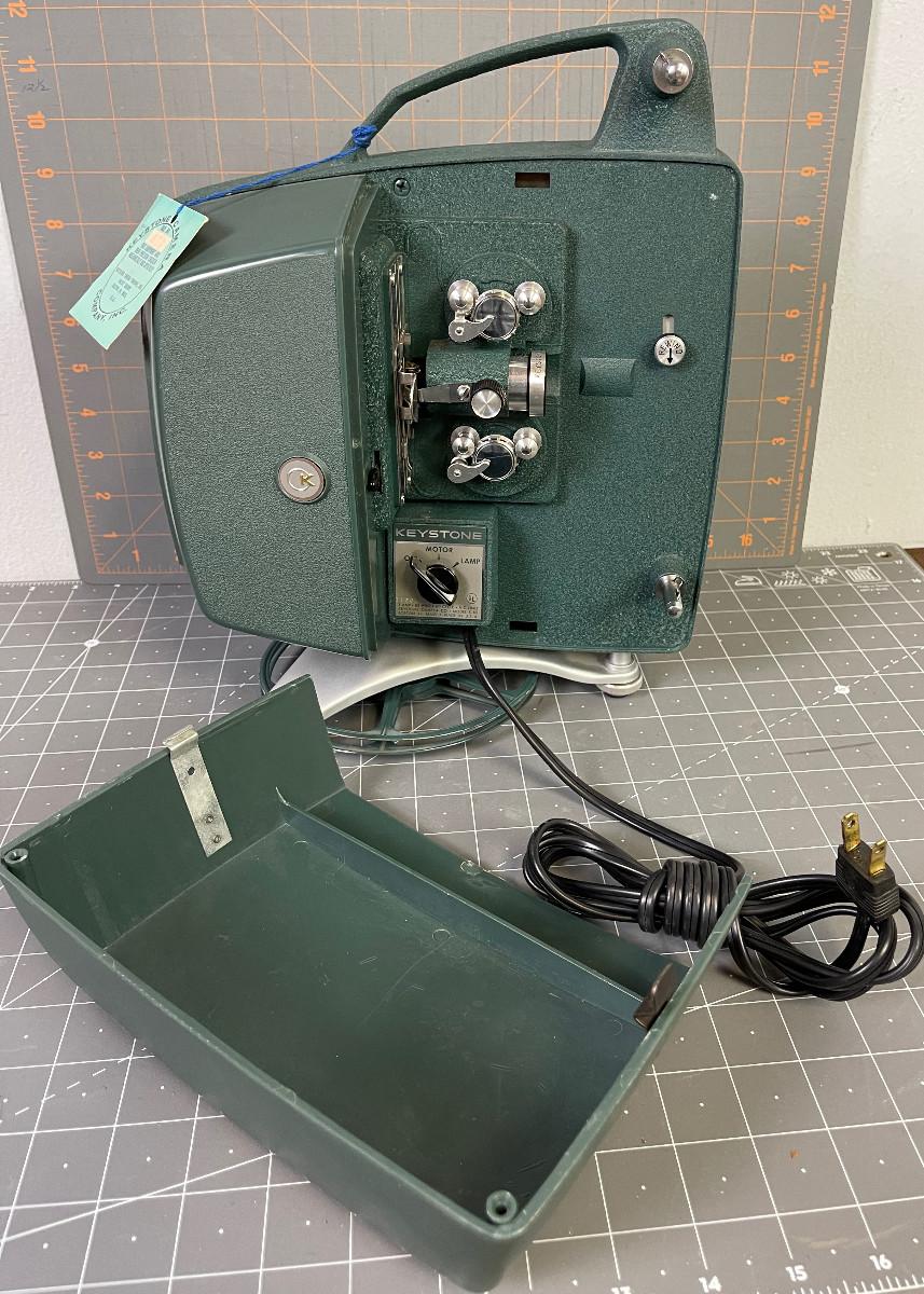 Powers up may need a bulb. Has a crack in the casing but it does not affect the operation with take up reel included..
