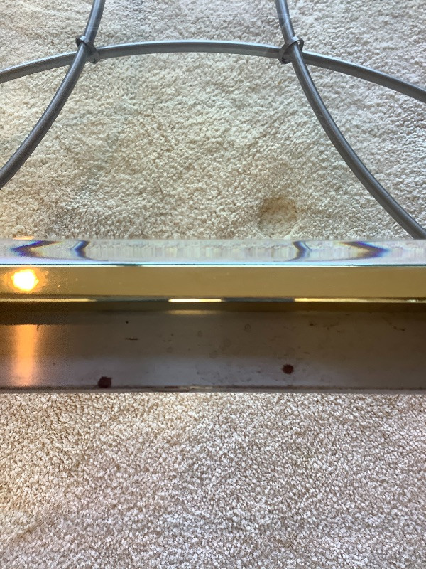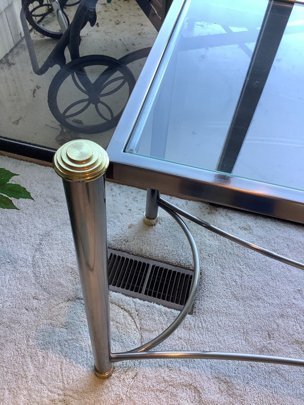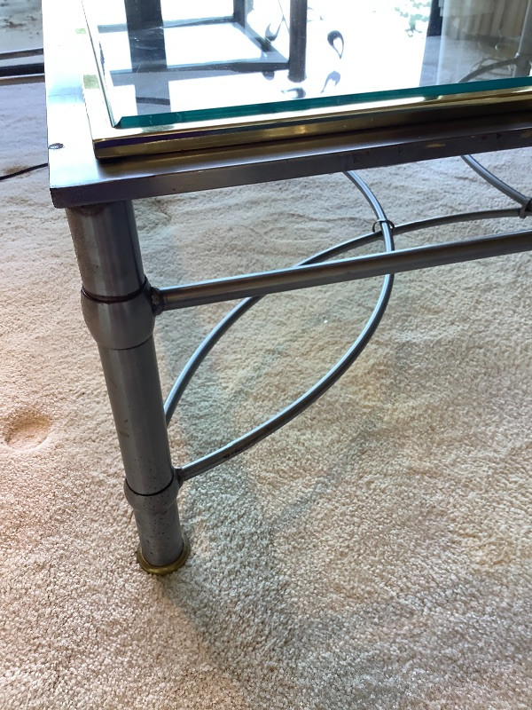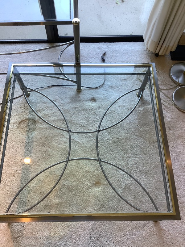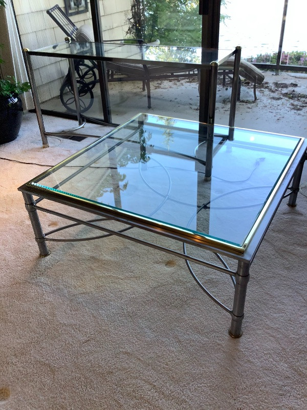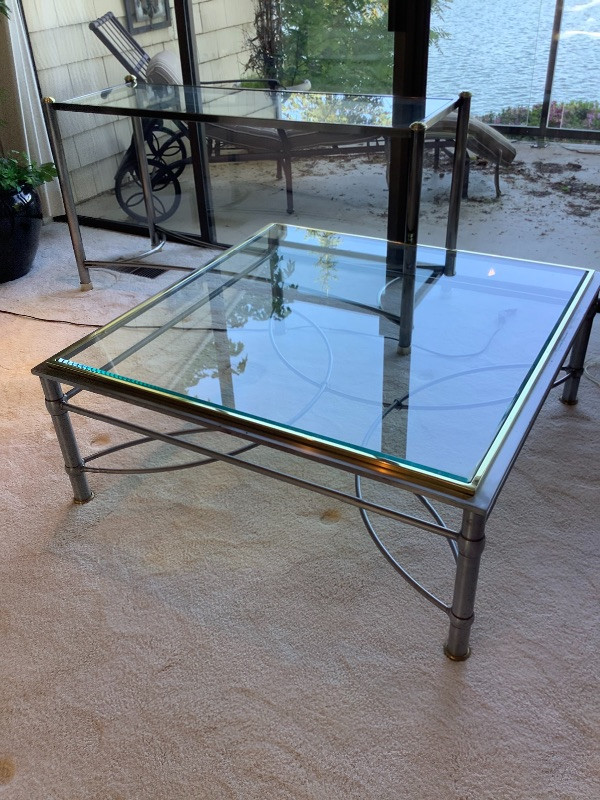 One beveled glass coffee table with two toned metal frame measuring 16” tall and 40” square with a matching couch table measuring 28” tall x 54” long x 19” wide Tables show some ware